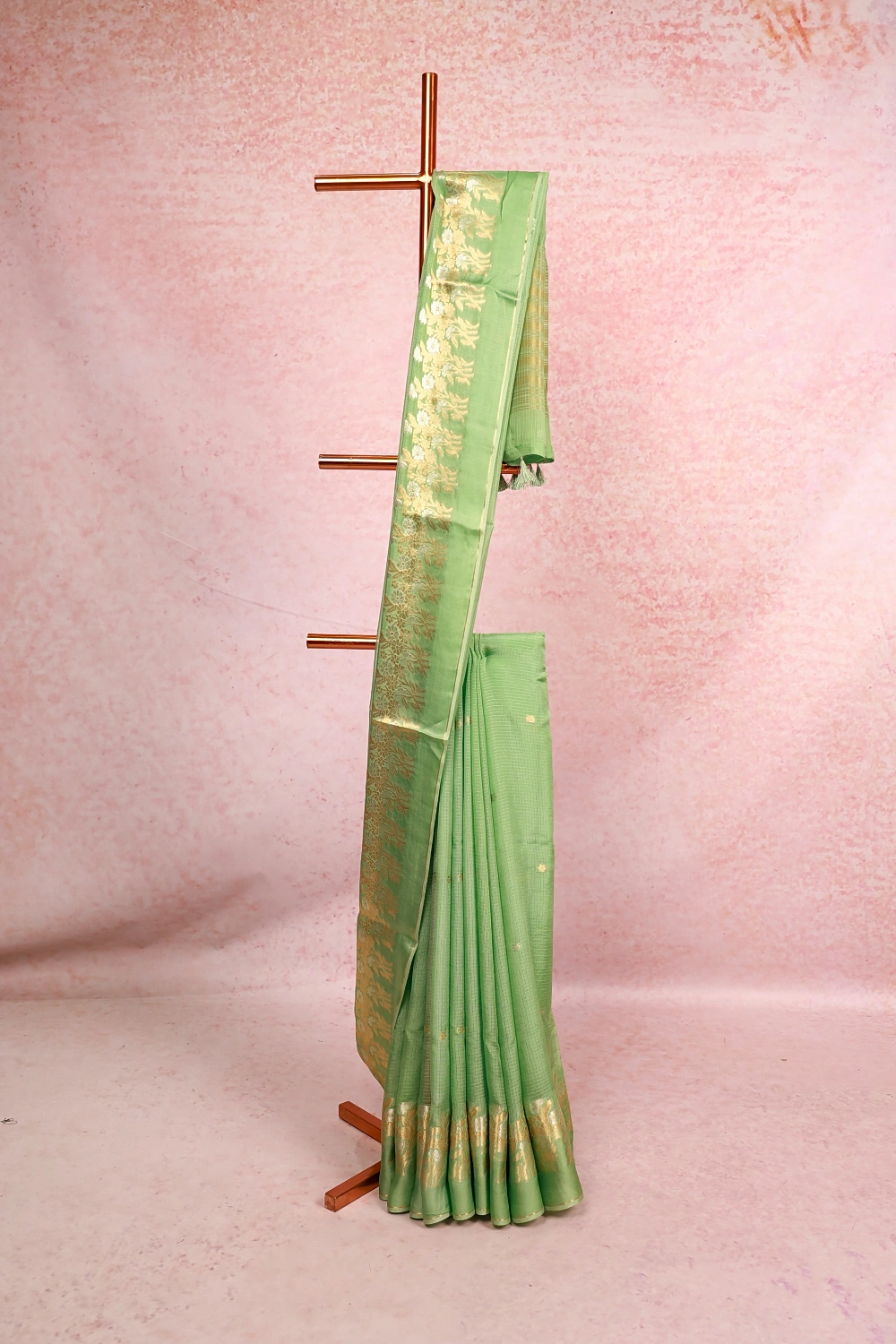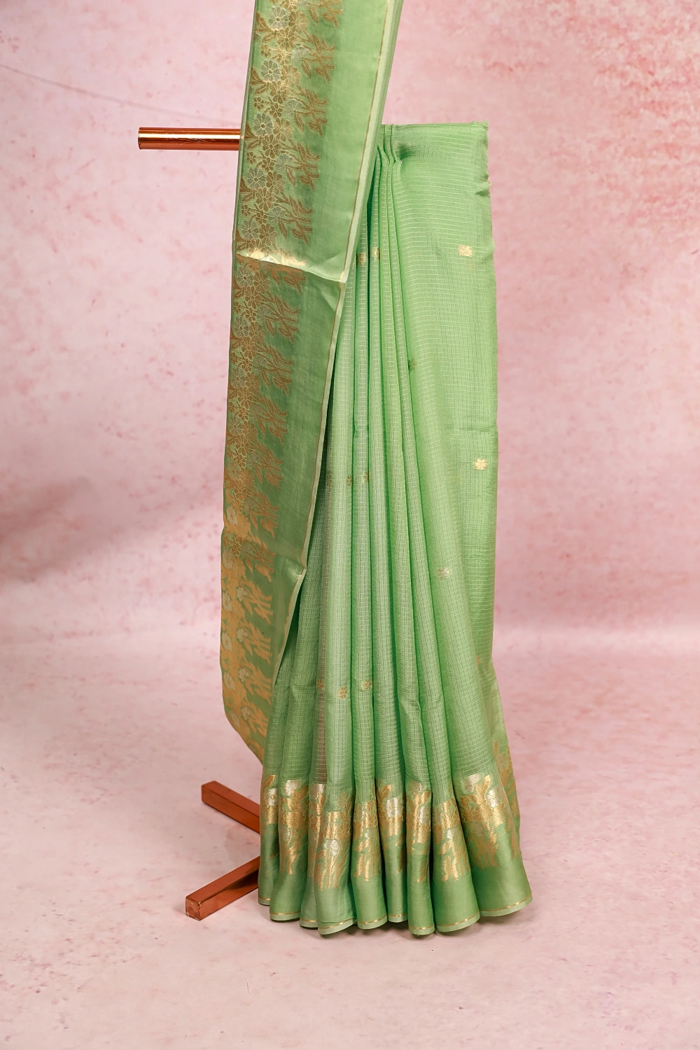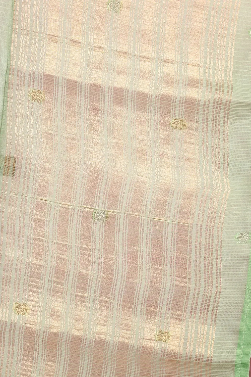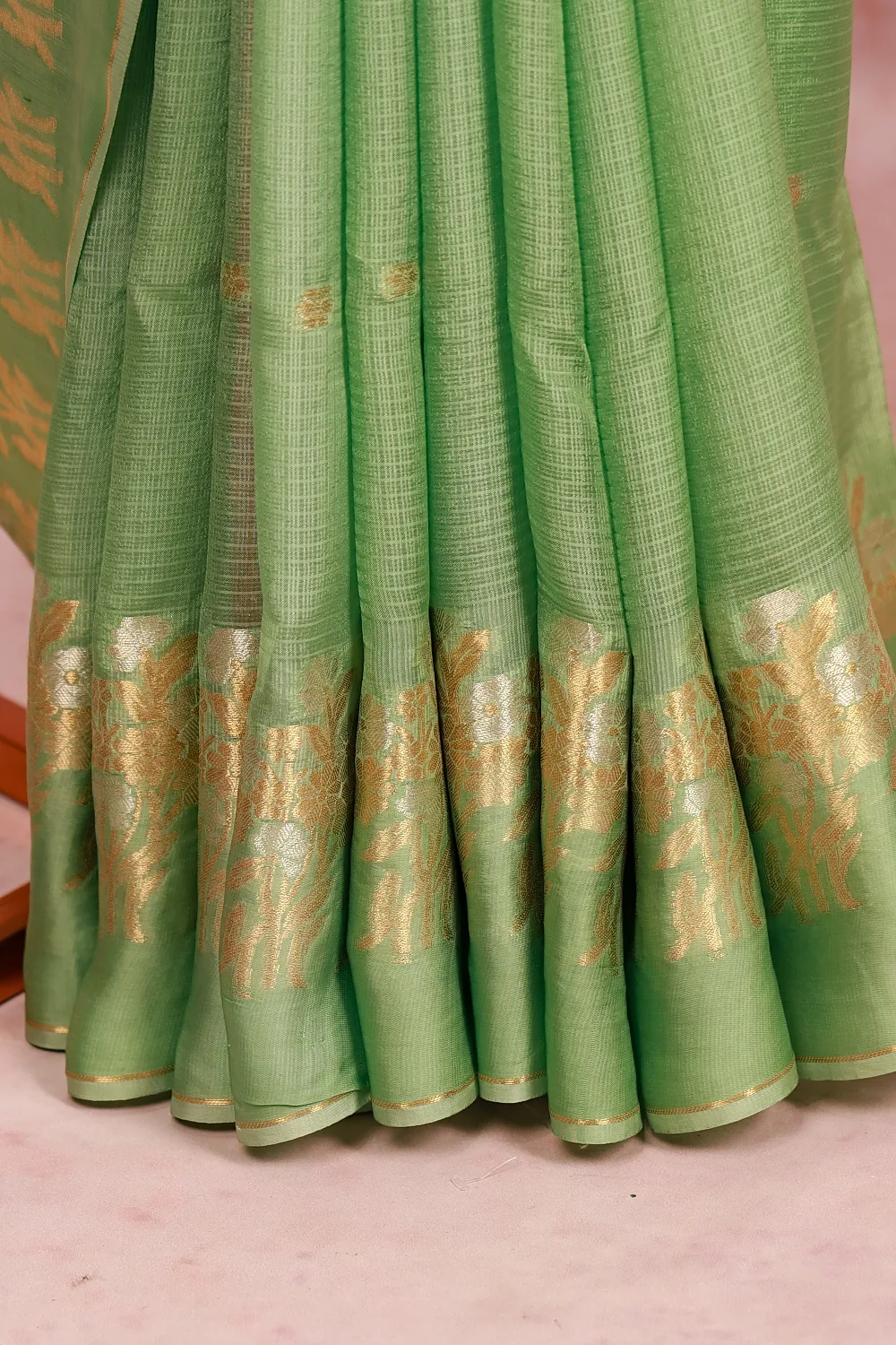 Light Green Tussar Banarasi Butta Saree with Zari Border. Includes Unstitched Blouse