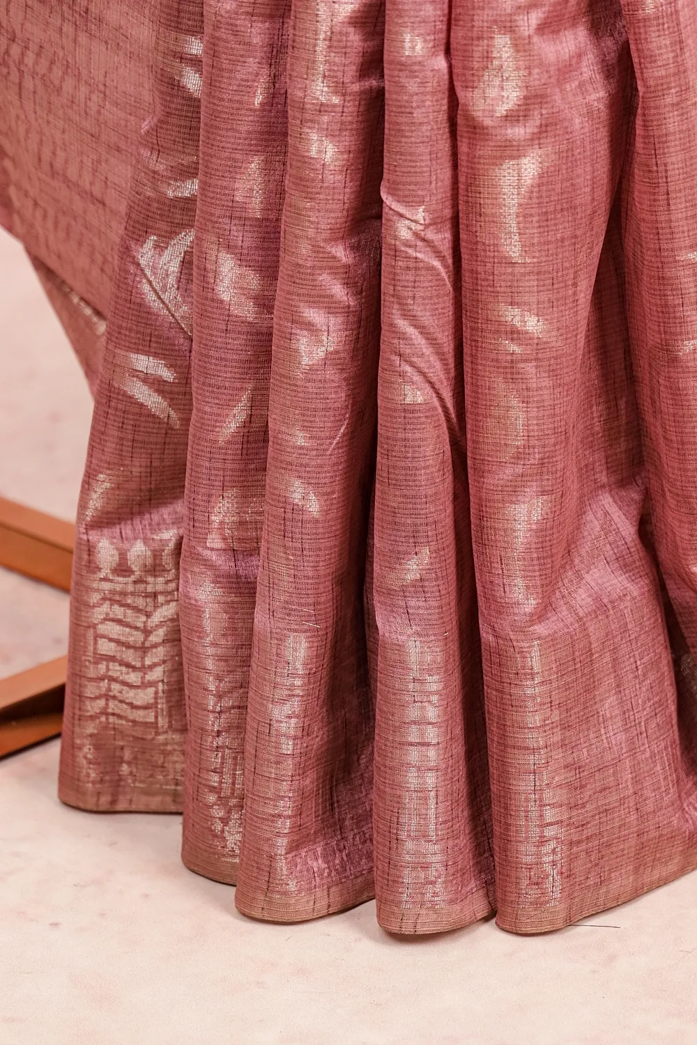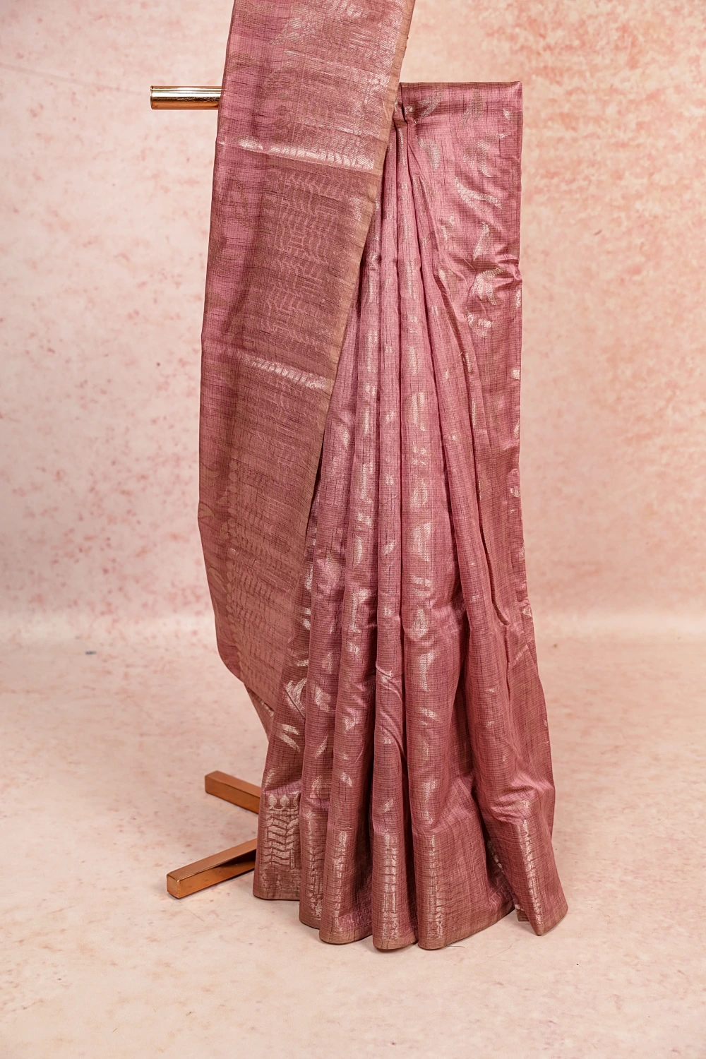 Light Onion Pink Semi Tussar Leaf Butta Saree With Designer Border. Includes Unstitched Blouse