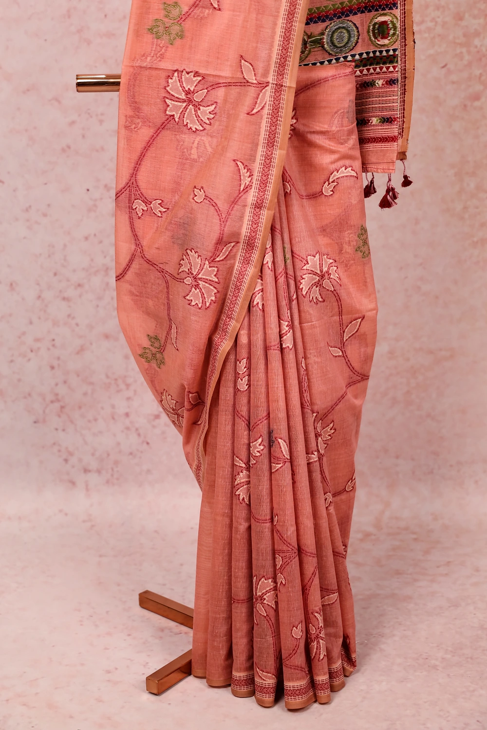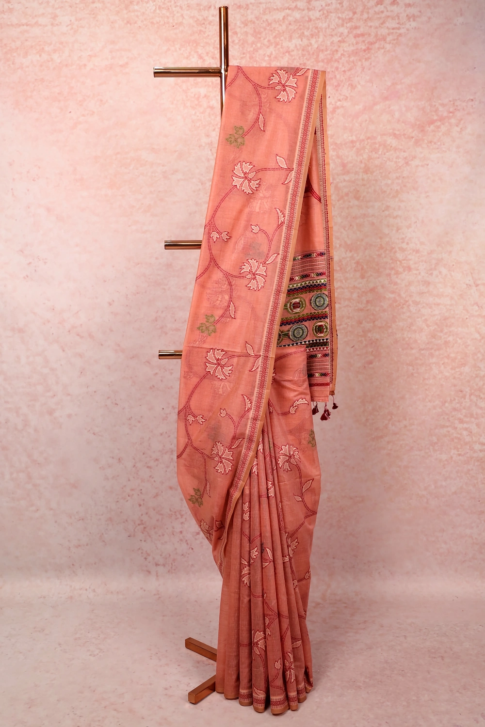 Light Peach Mul Cotton Embroidery Saree with Thread Border. Includes Unstitched Blouse