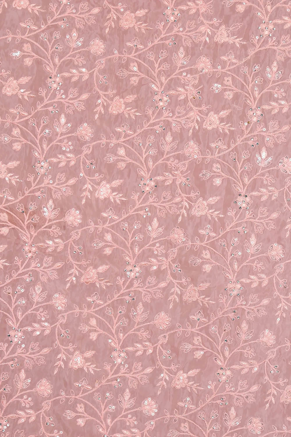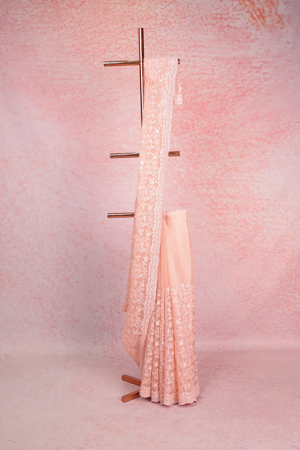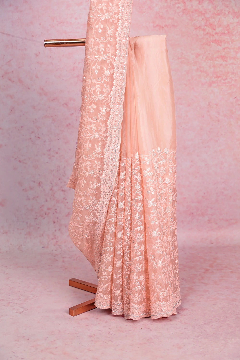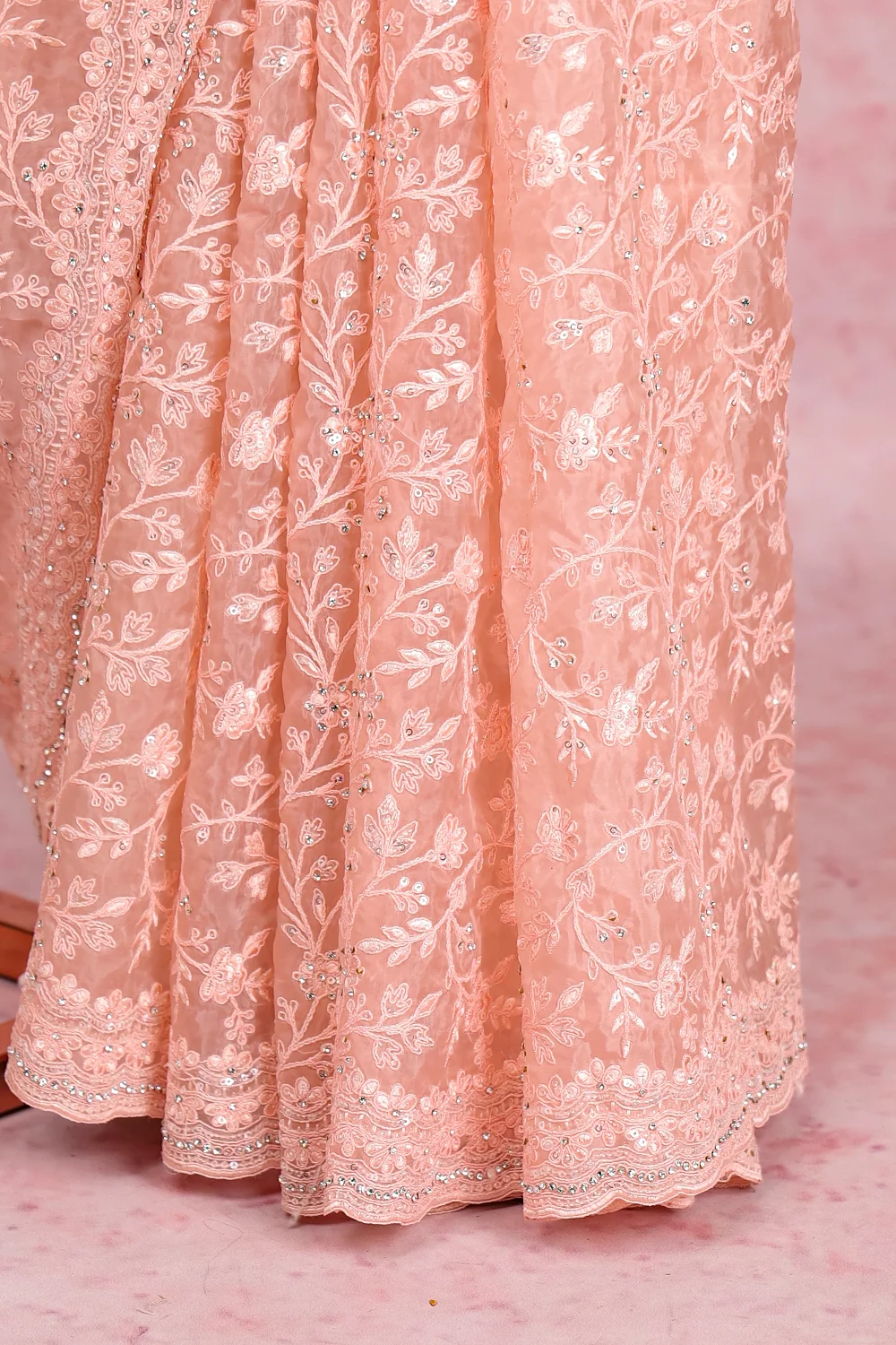 Light Peach Organza Thread Work Saree with Scalp Border. Includes Unstitched Blouse