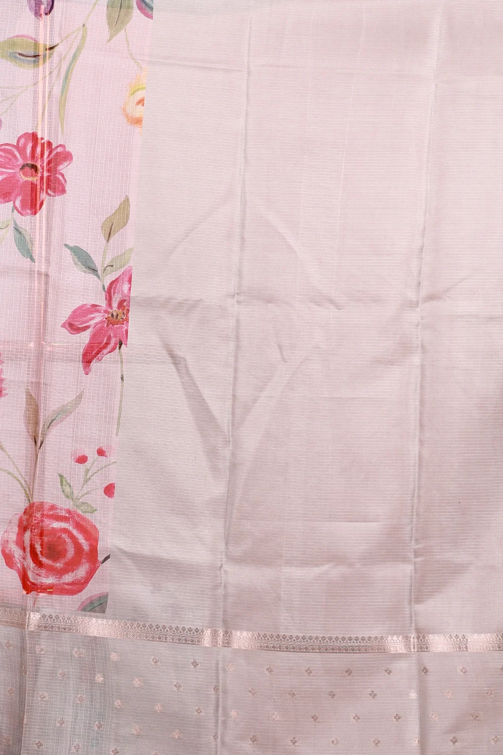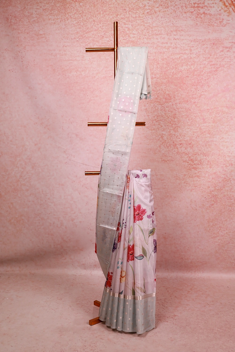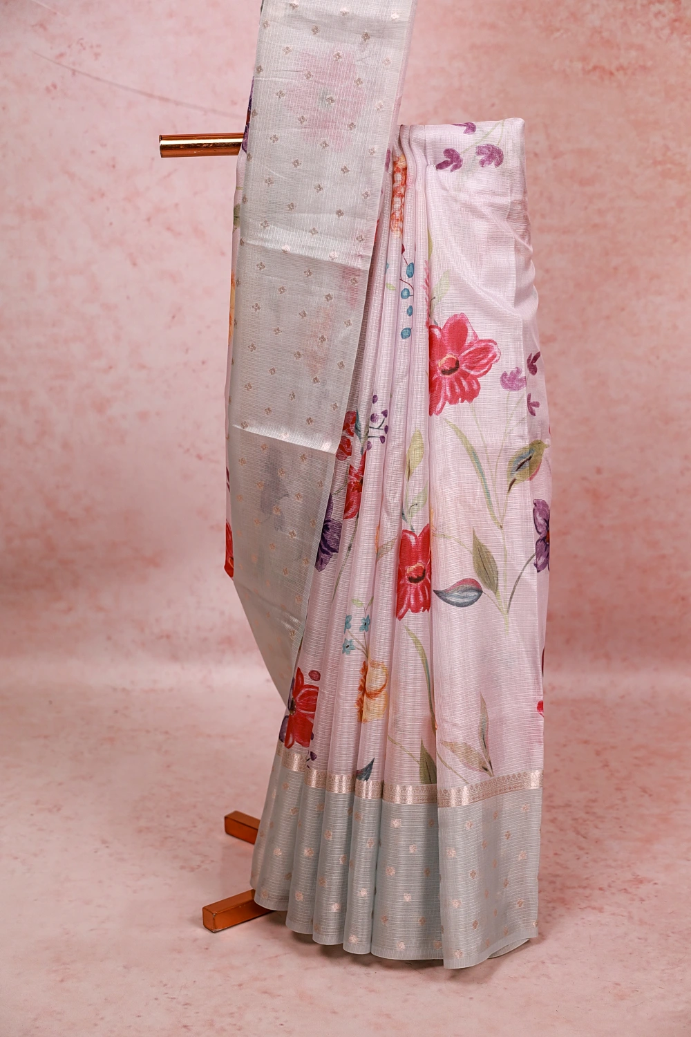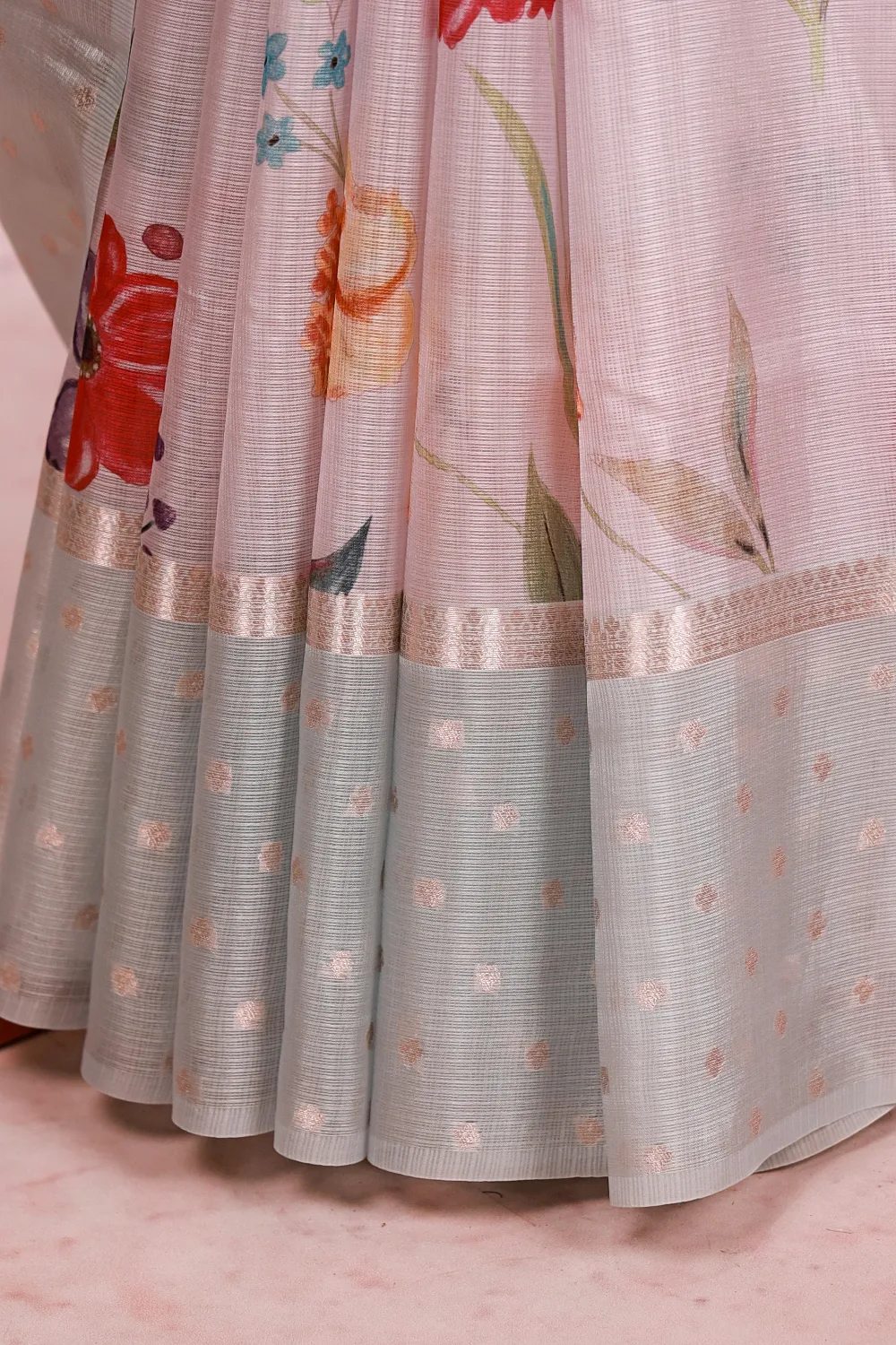 Light Pink Linen Kota Floral Printed Saree With Butta Border. Includes Unstitched Blouse