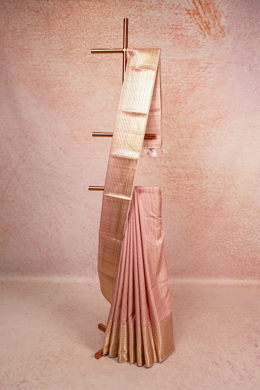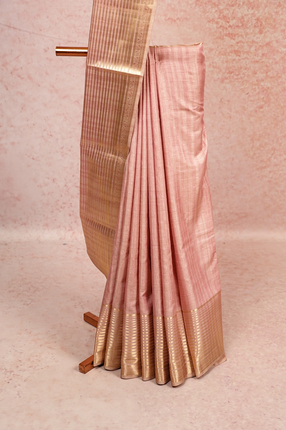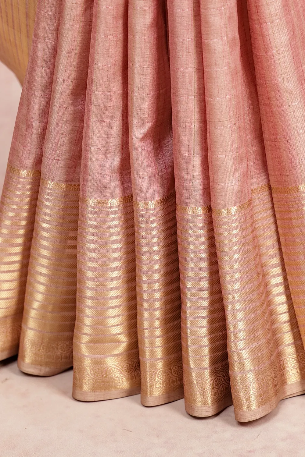 Light Pink Semi Banarasi Lines Saree With Designer Border. Includes Unstitched Blouse