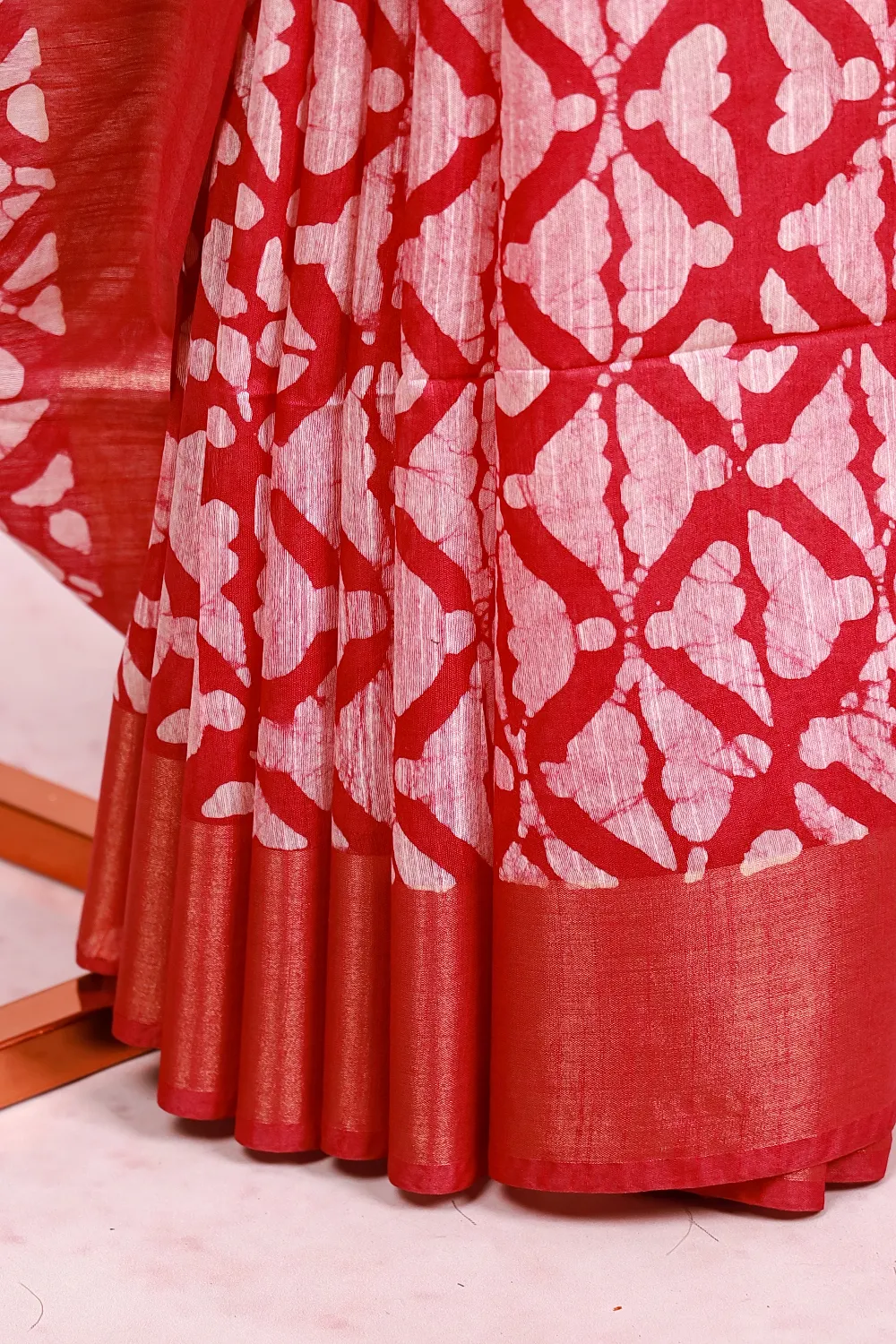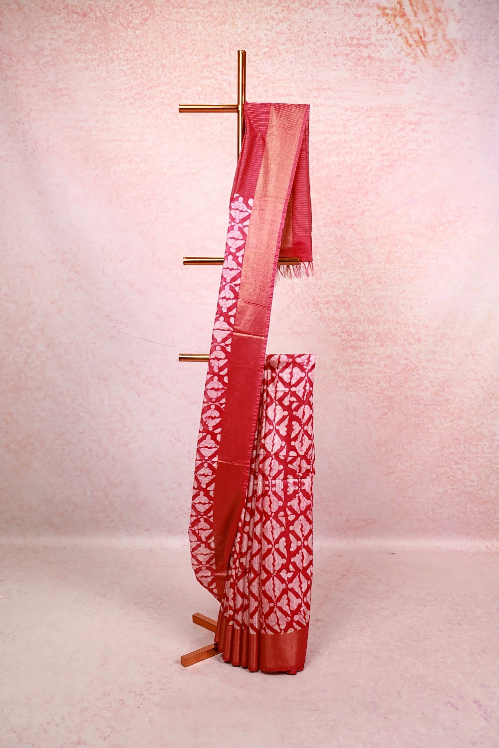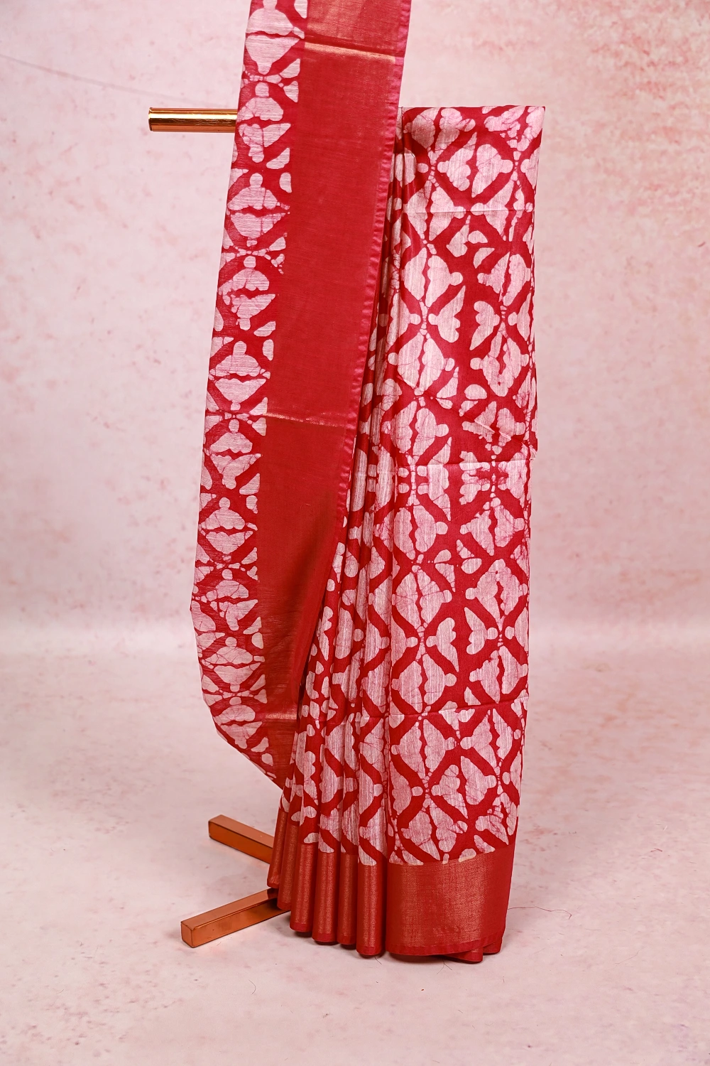 Light Wine Semi Tussar Bathik Printed Saree With Zari Border. Includes Unstitched Blouse