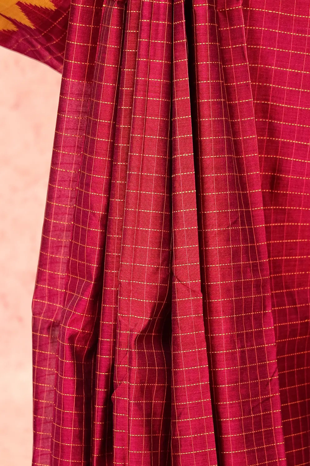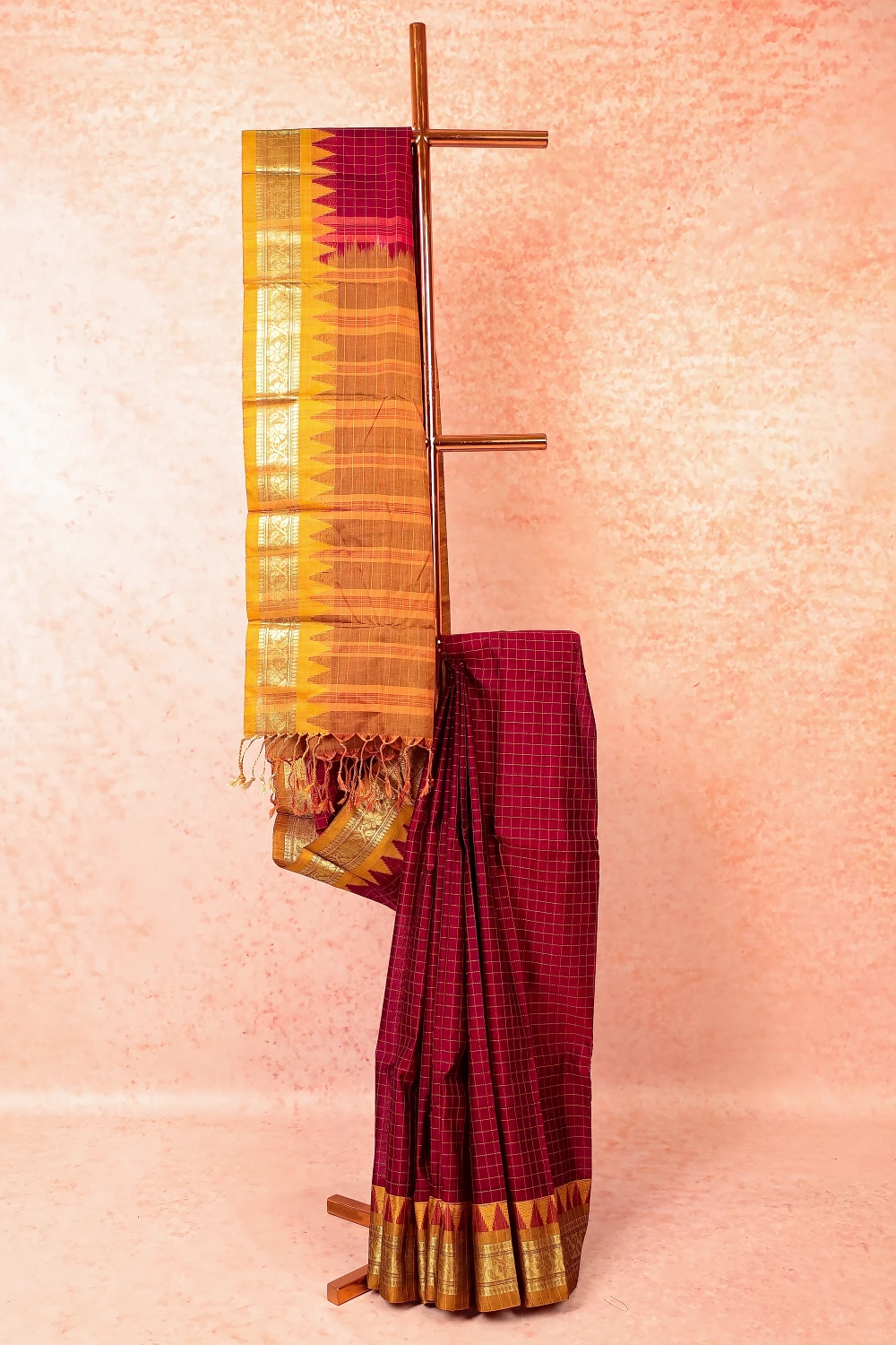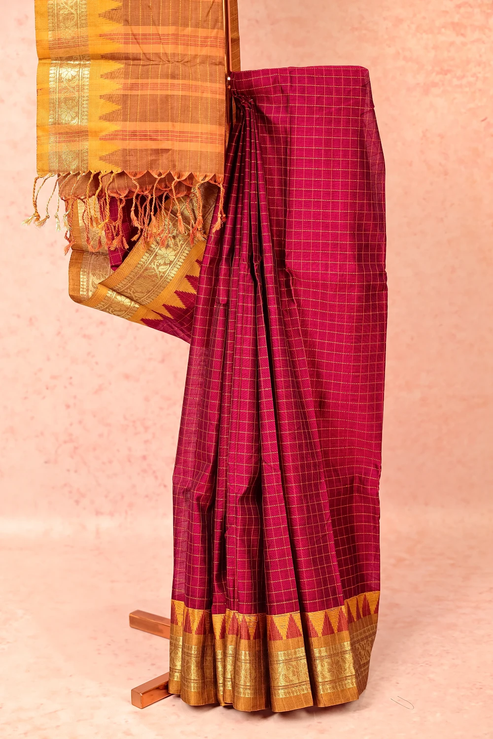 Magenta Cotton Check Saree with Temple border. Includes Unstitched Blouse