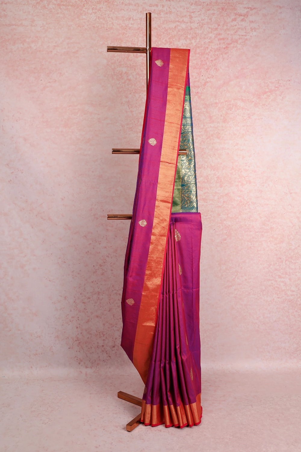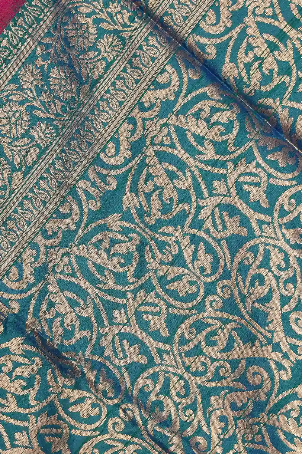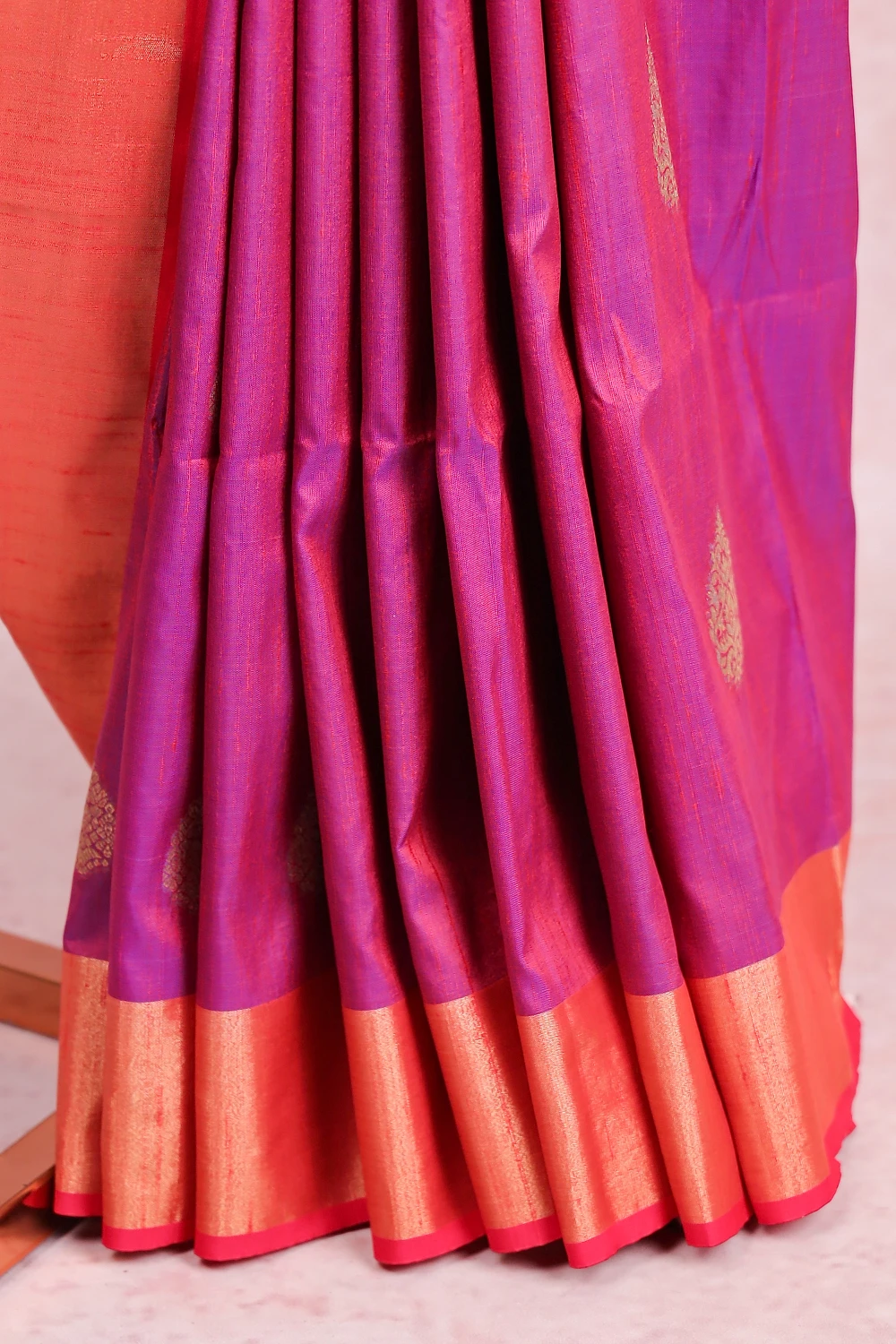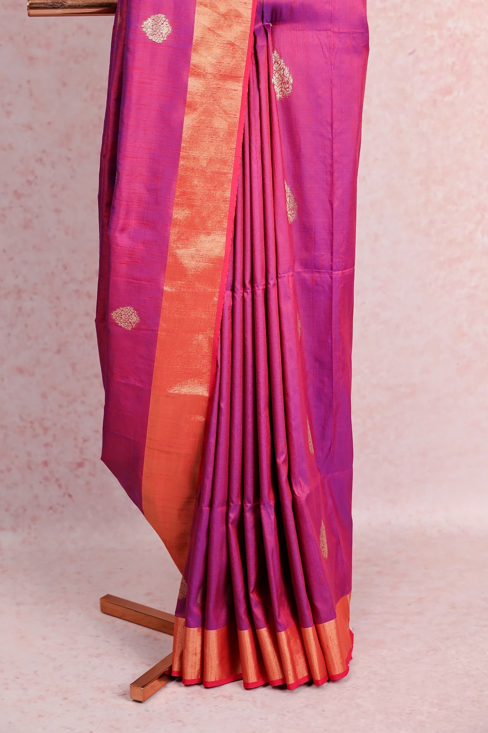 Magenta Pink Semi Jute Banarasi Design Saree With Golden Border. Includes Un Stitched Blouse