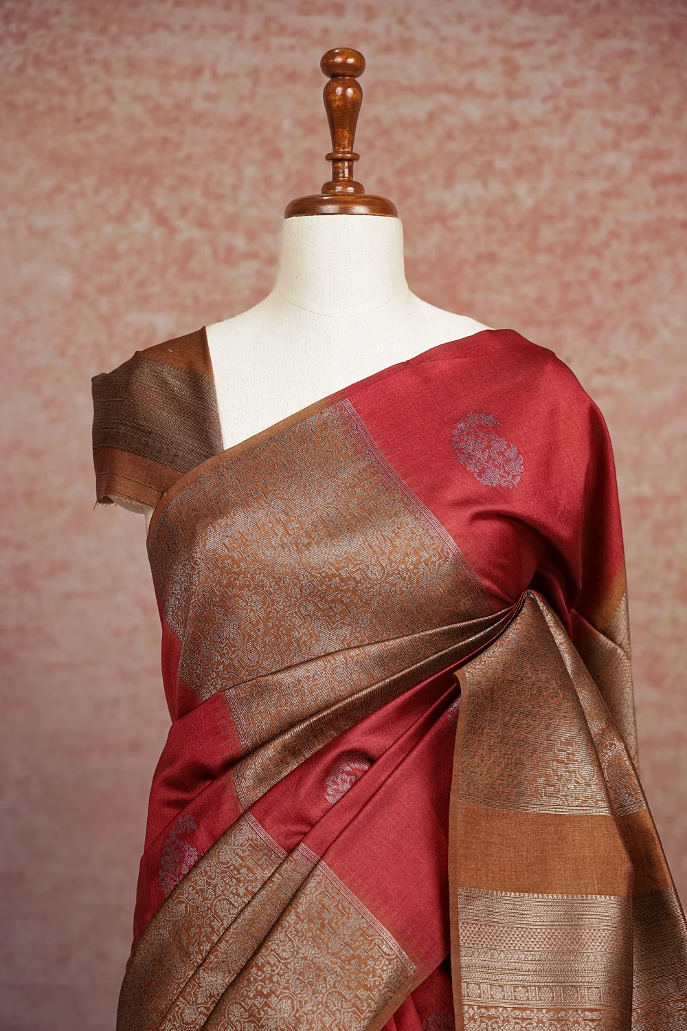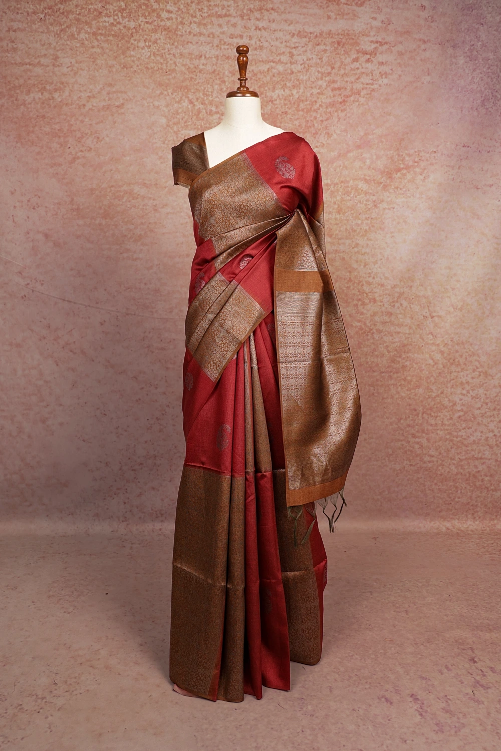 Maroon And Moss Green Semi Silk Mango Design Saree Without Border. Includes Unstitched Blouse