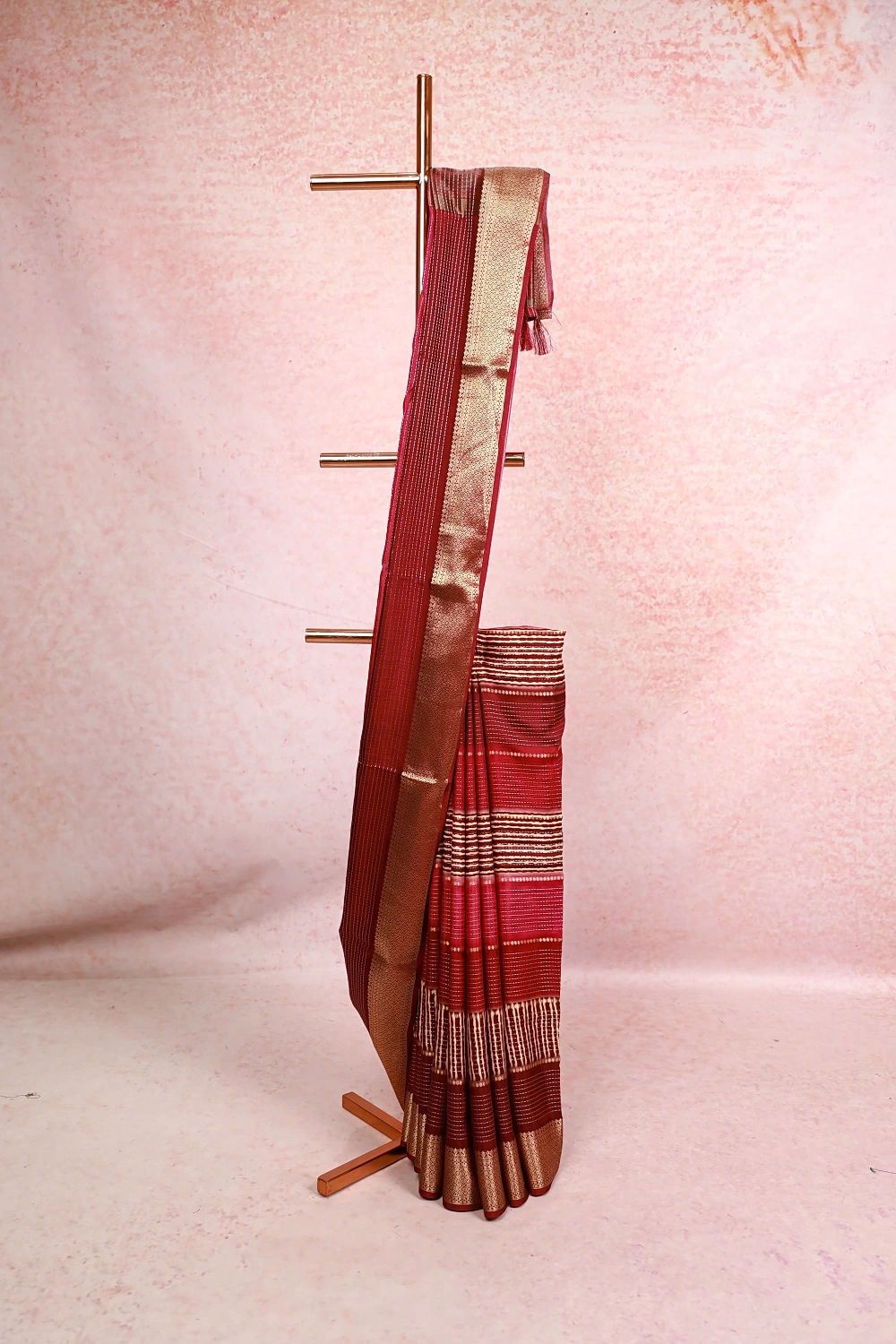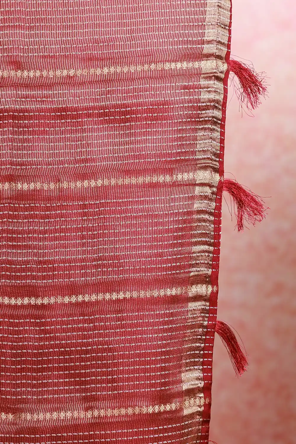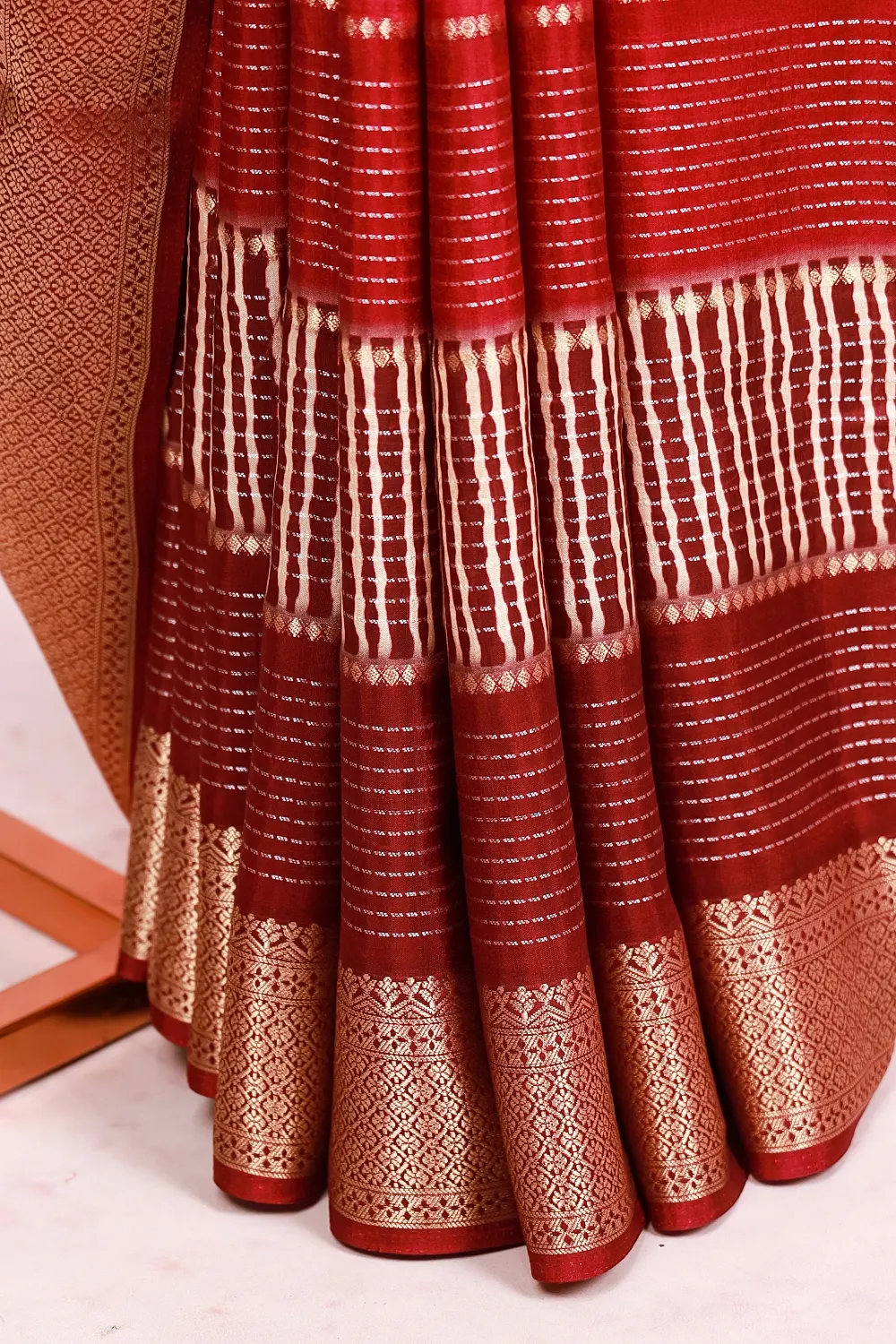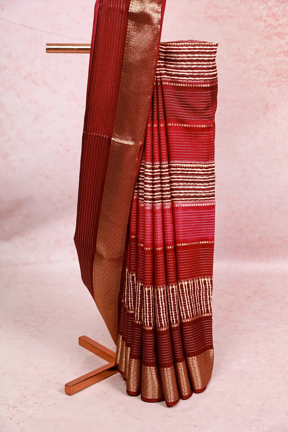 Maroon And Wine Semi Silk Zari line Saree With Banarasi Border. Includes Unstitched Blouse