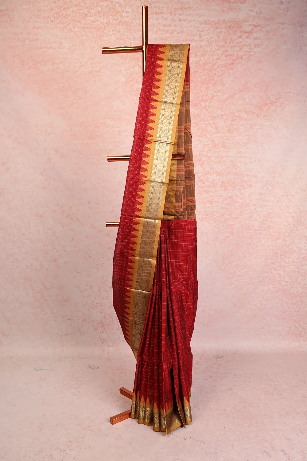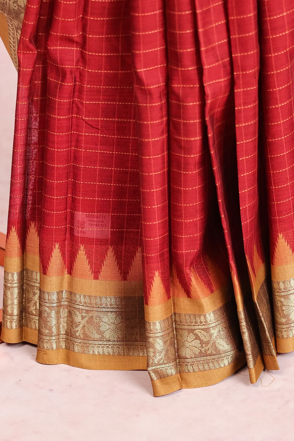Maroon Cotton Silk Check Saree with Designer Border. Includes Unstitched Blouse