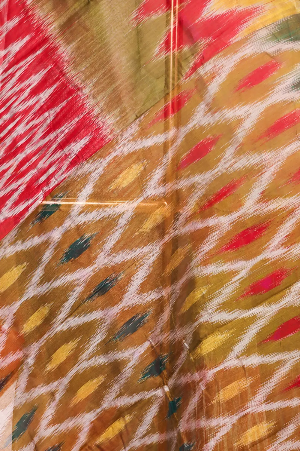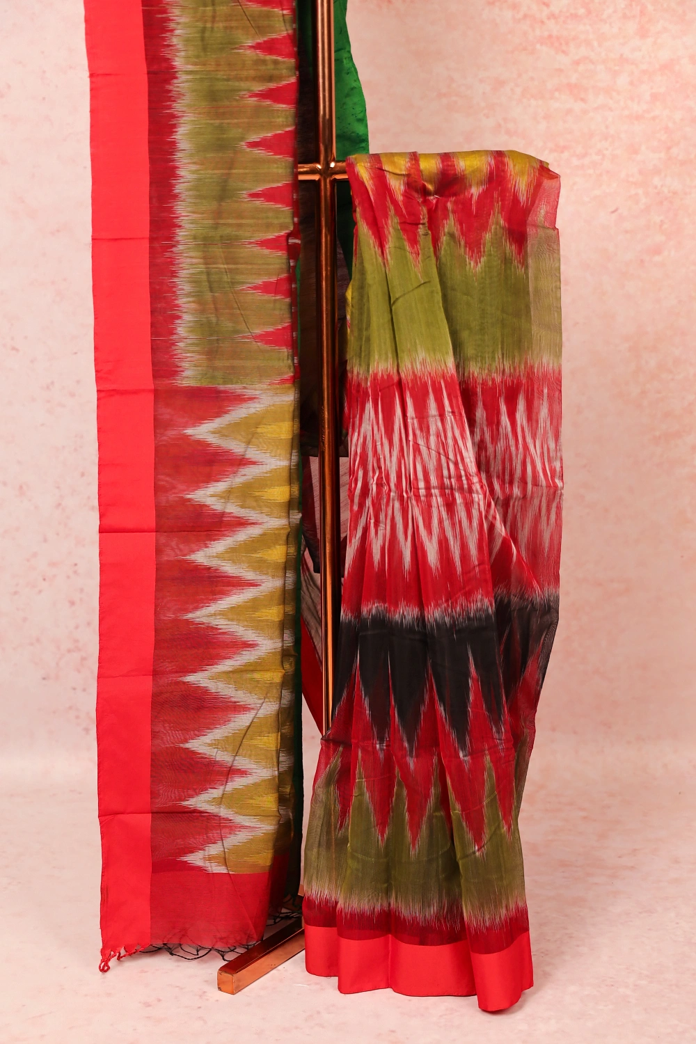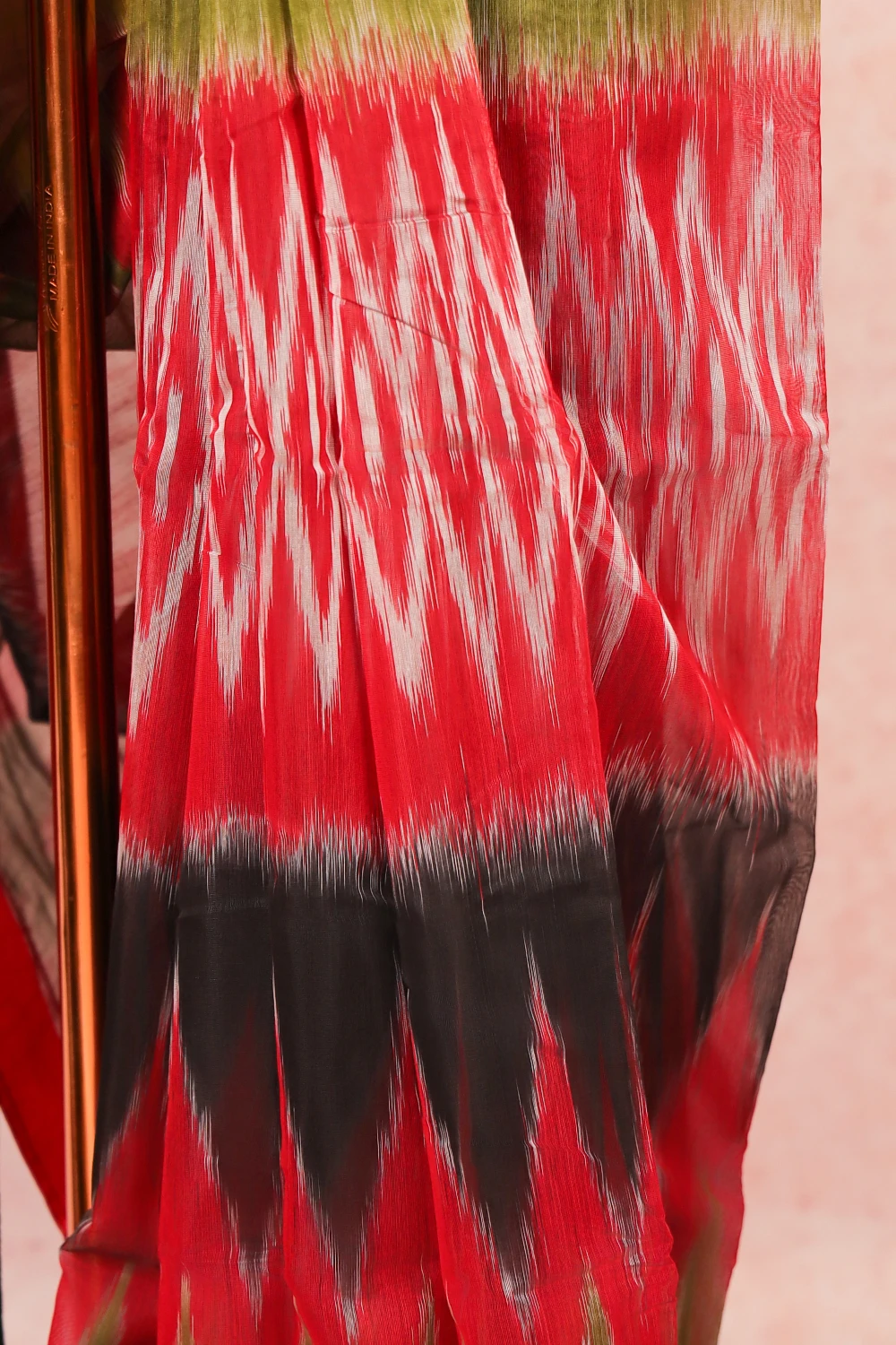Maroon Cotton Silk Pochampalli Printed Saree with Plain border. Includes Unstitched Blouse