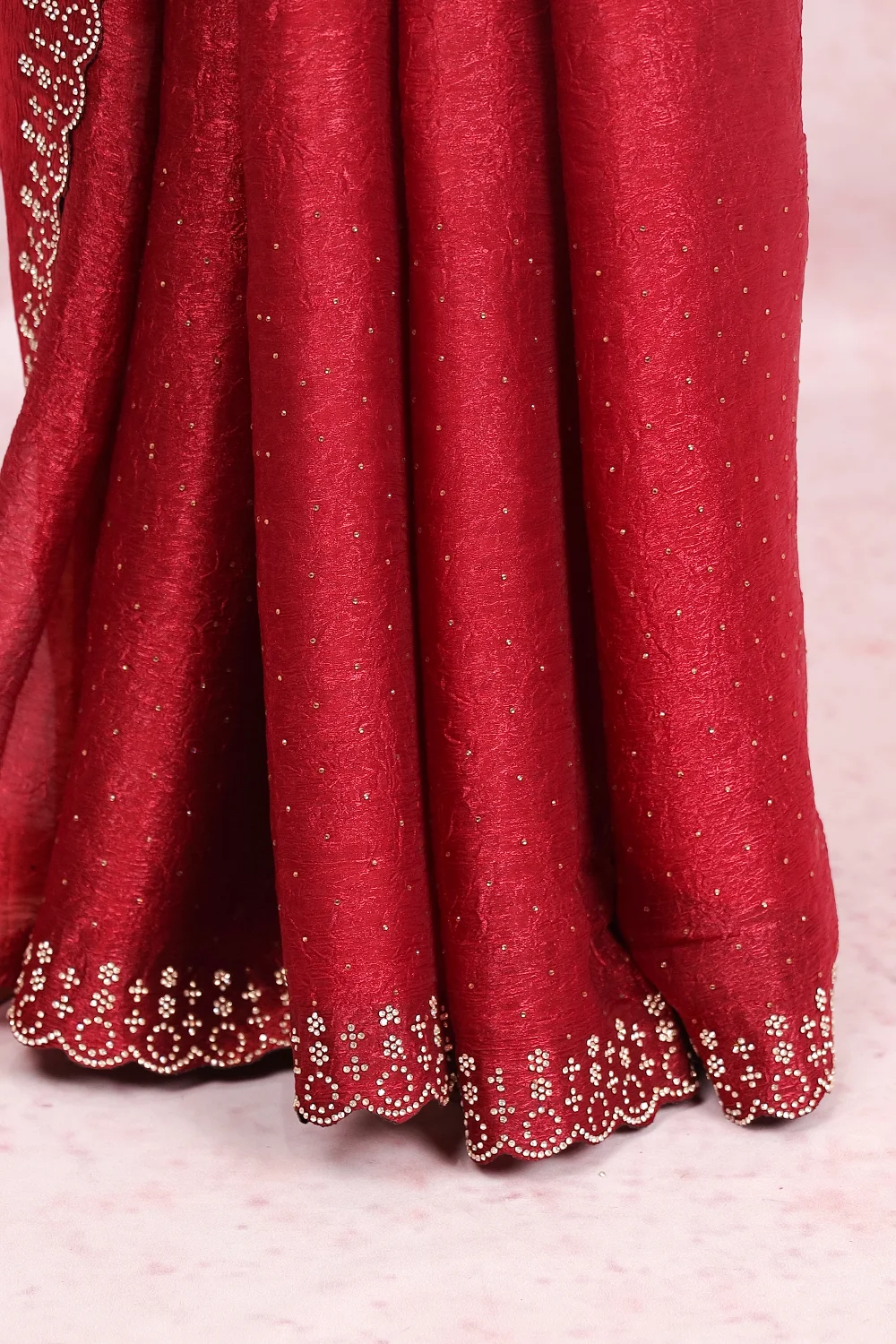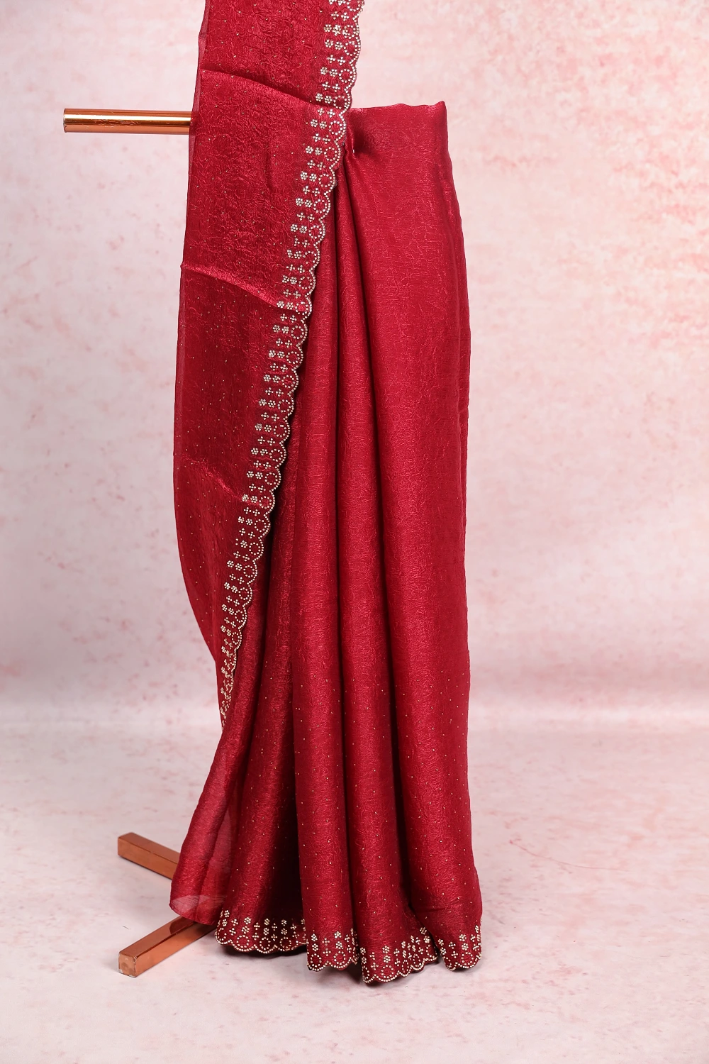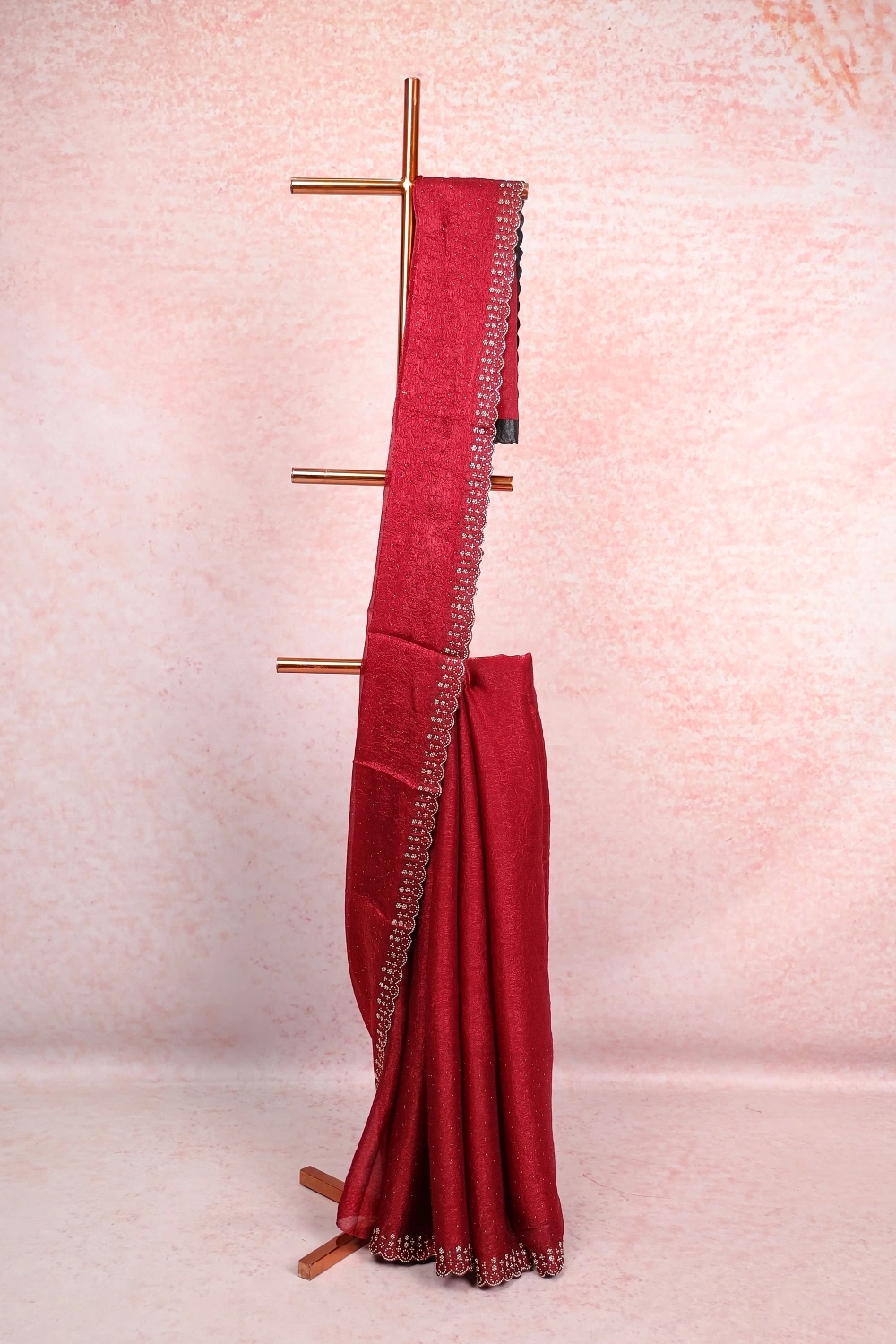 Maroon Crush Plain Saree With Scallop Border. Includes Un Stitched Blouse