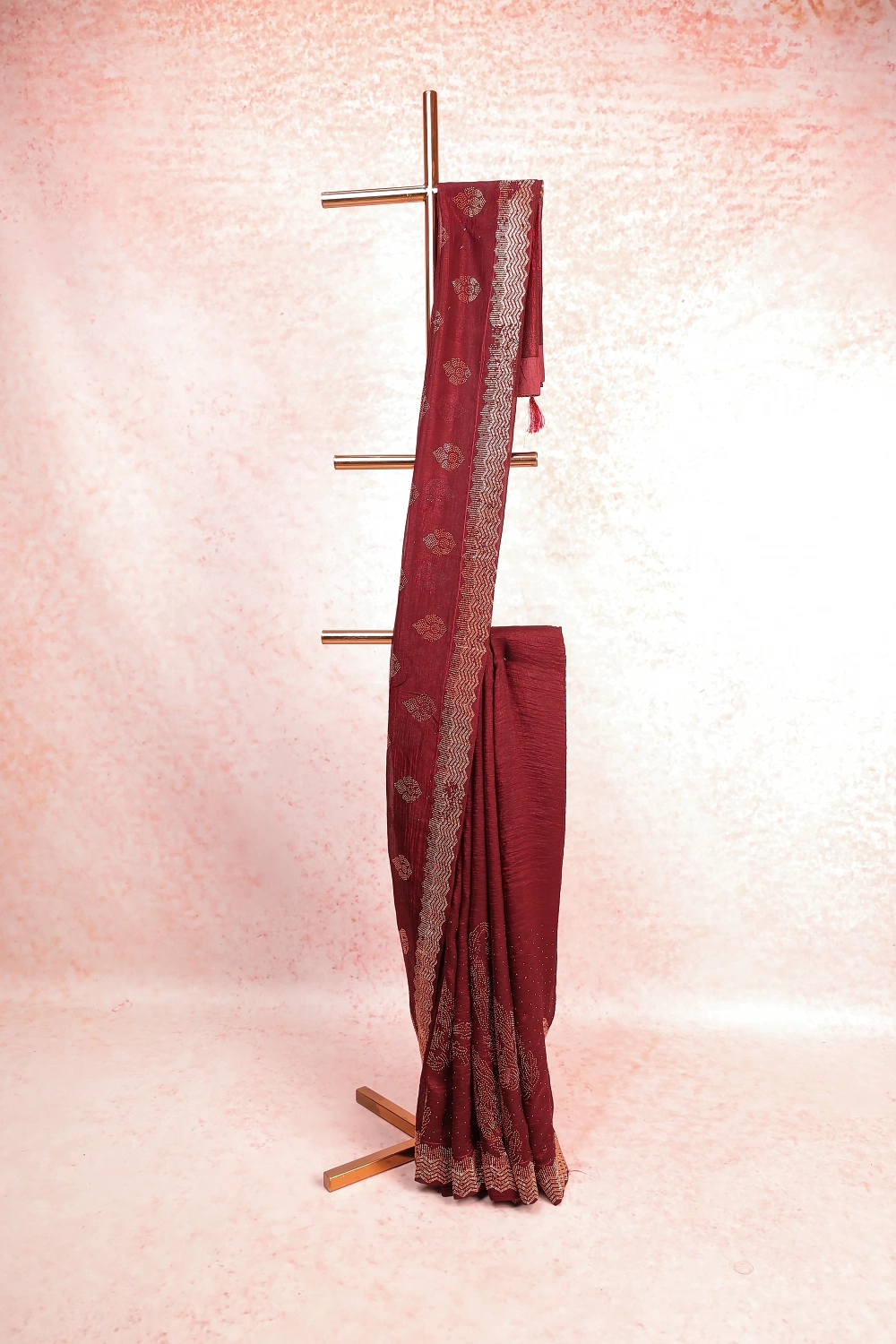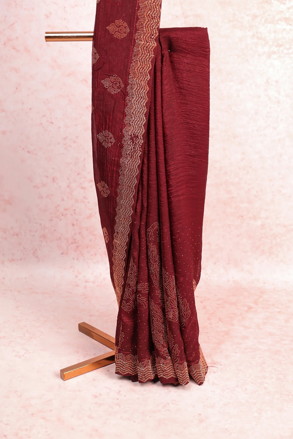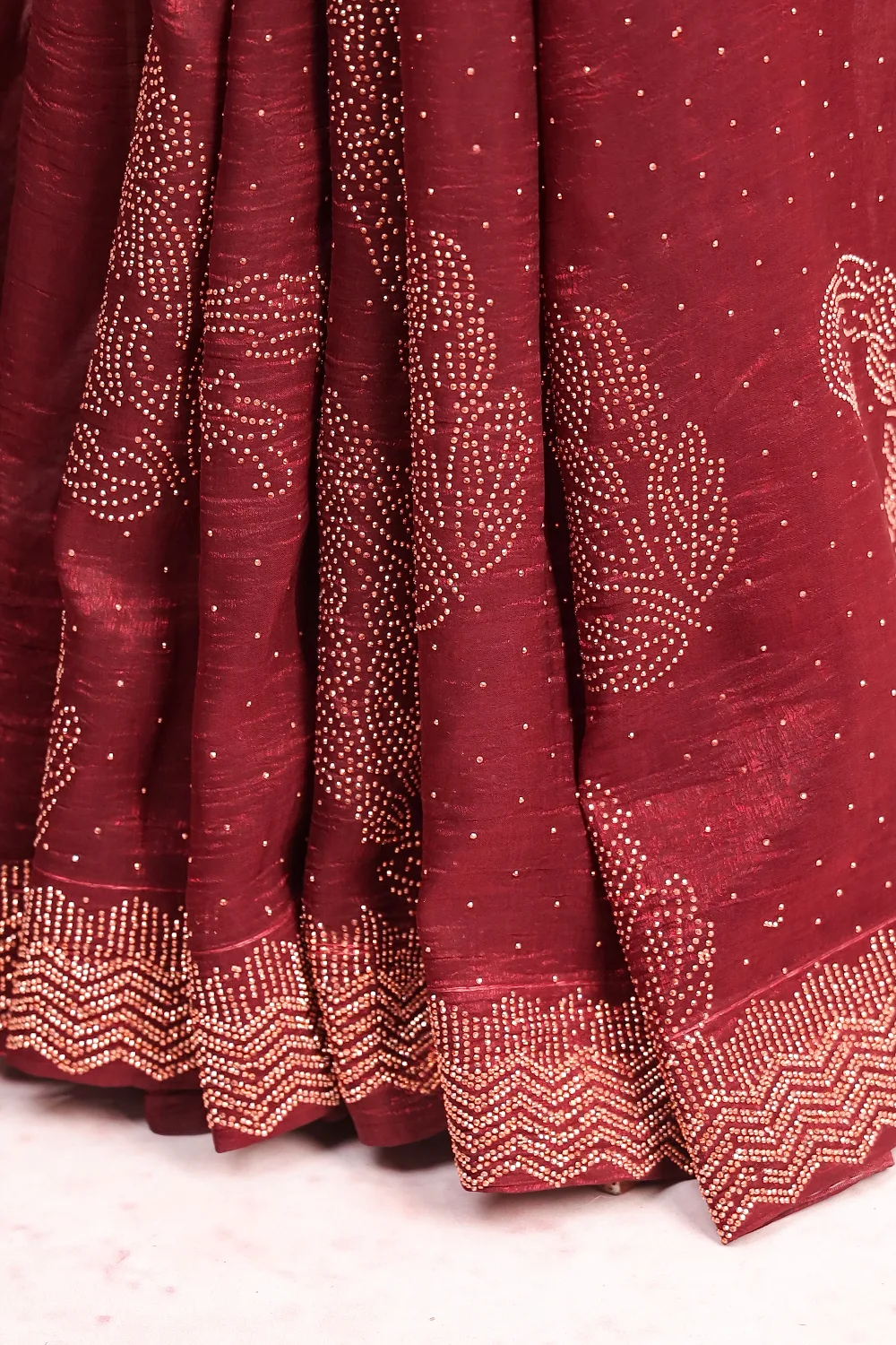 Maroon Crush Stone Work Saree with Scalp Border. Includes Un stitched Blouse