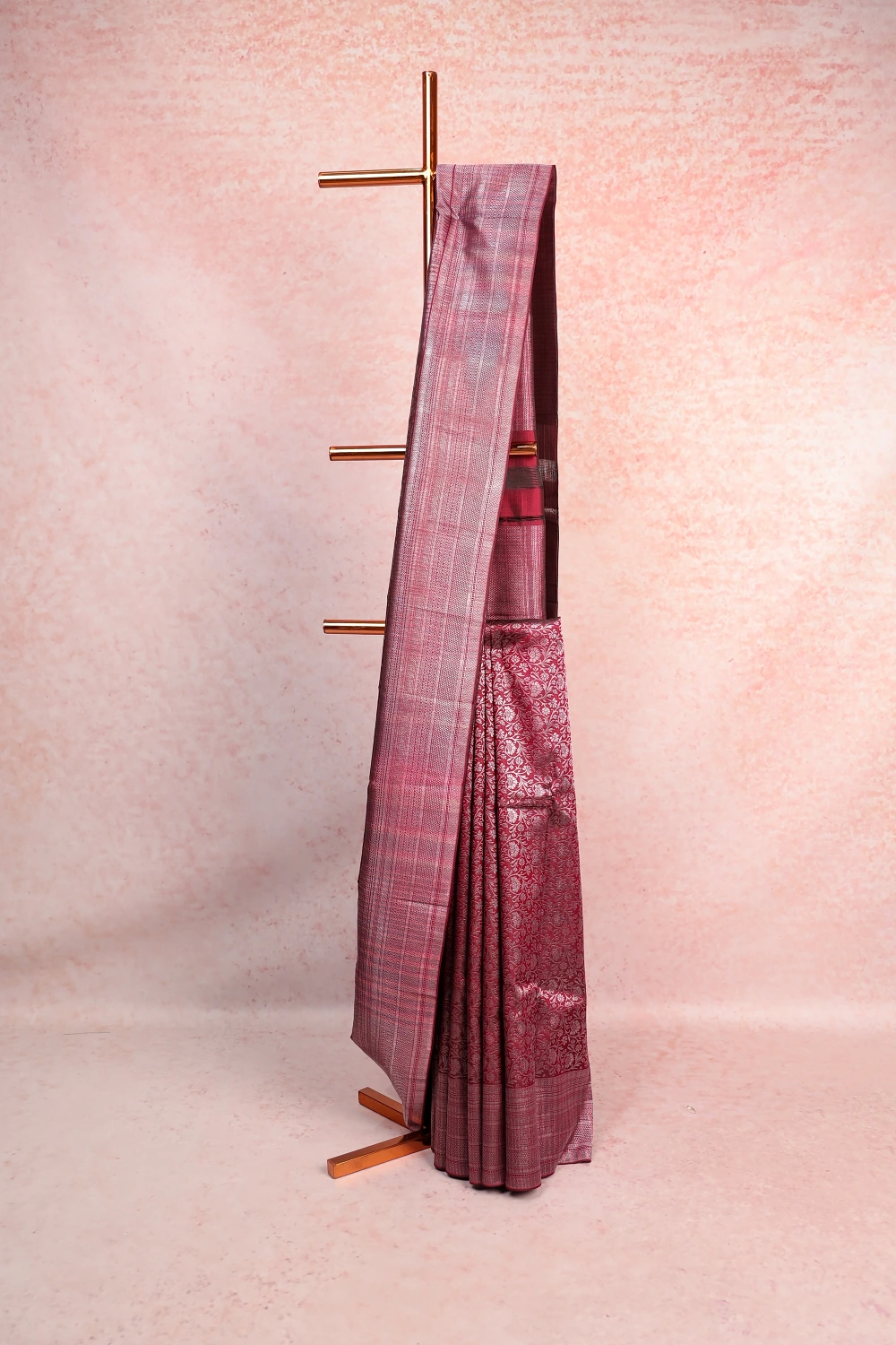 Maroon Kancheepuram Silk Brocade Saree with Designer Border. Includes Unstitched Blouse