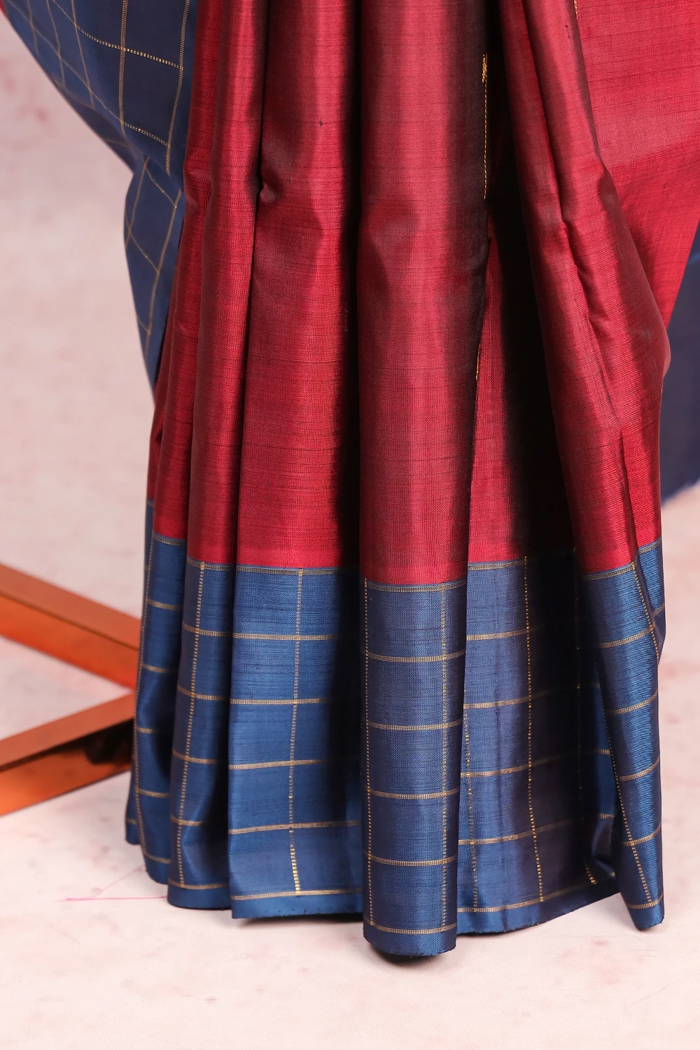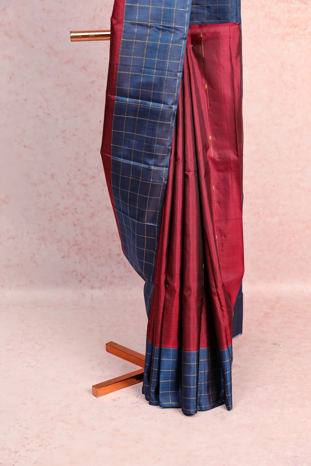 Maroon Kancheepuram Silk Butta Saree with Checks Border. Includes Unstitched Blouse
