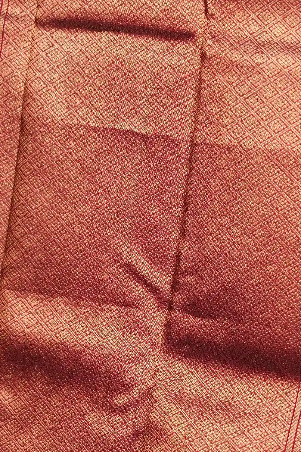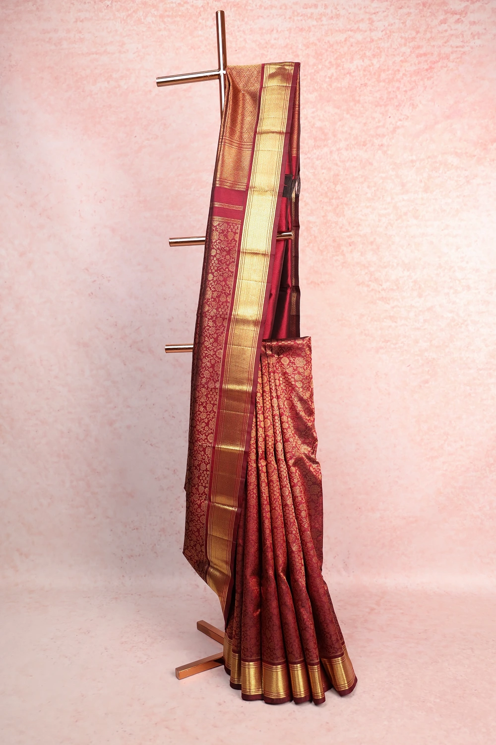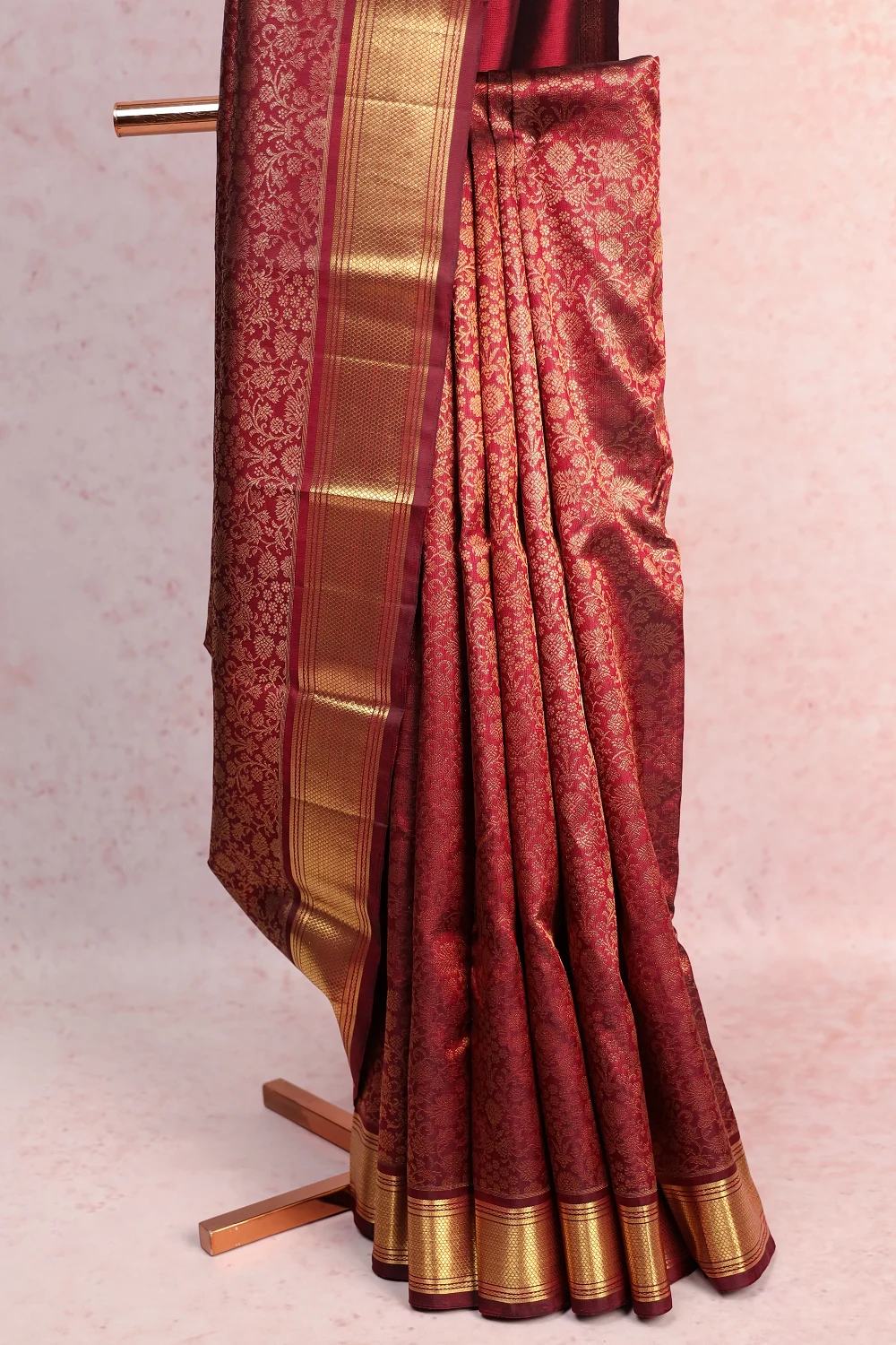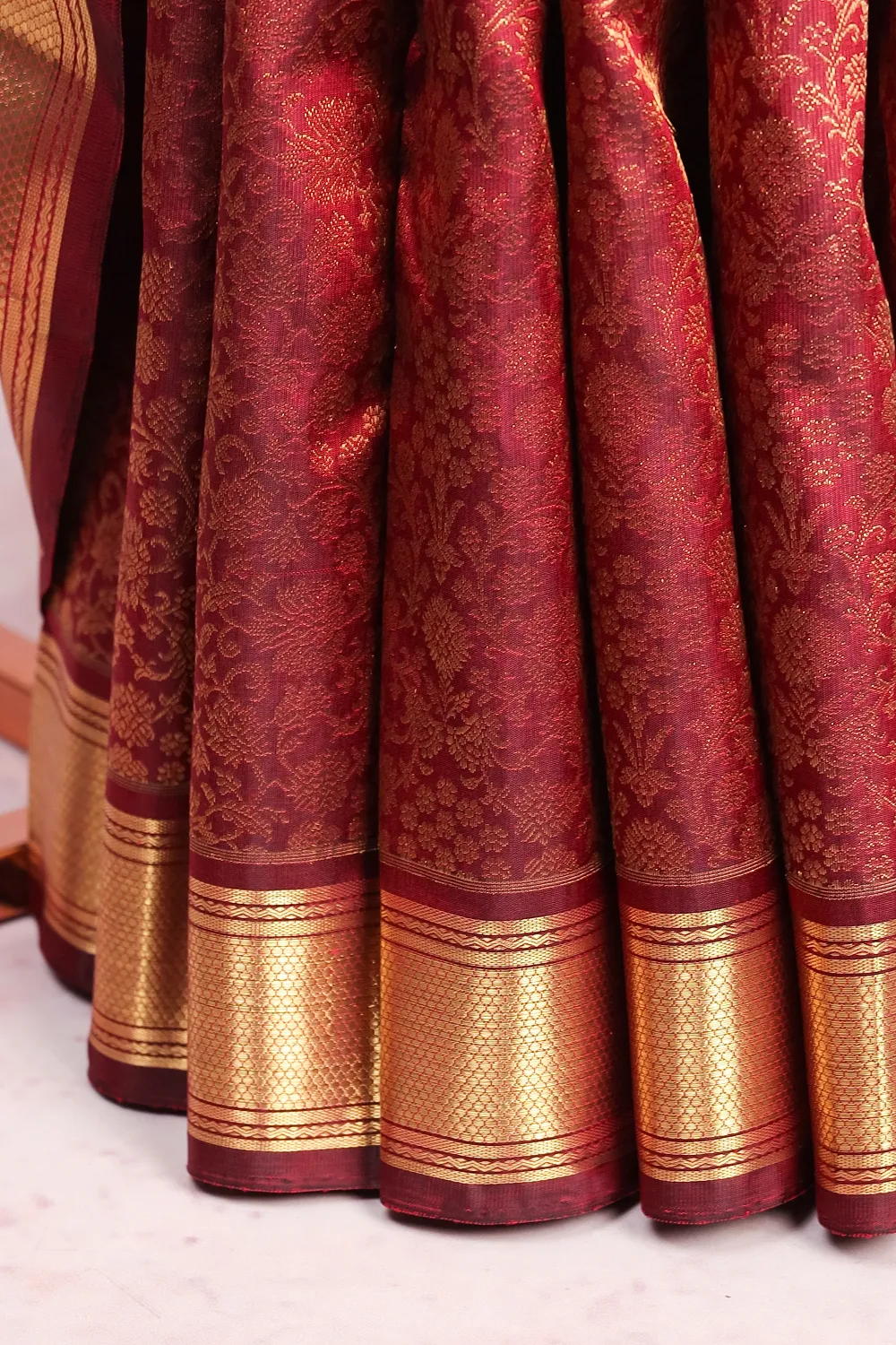 Maroon Kancheepuram Silk Brocade Saree with Designer Border. Includes Un stitched Blouse