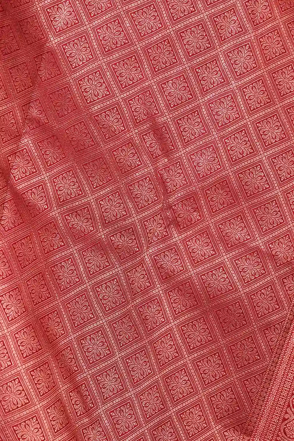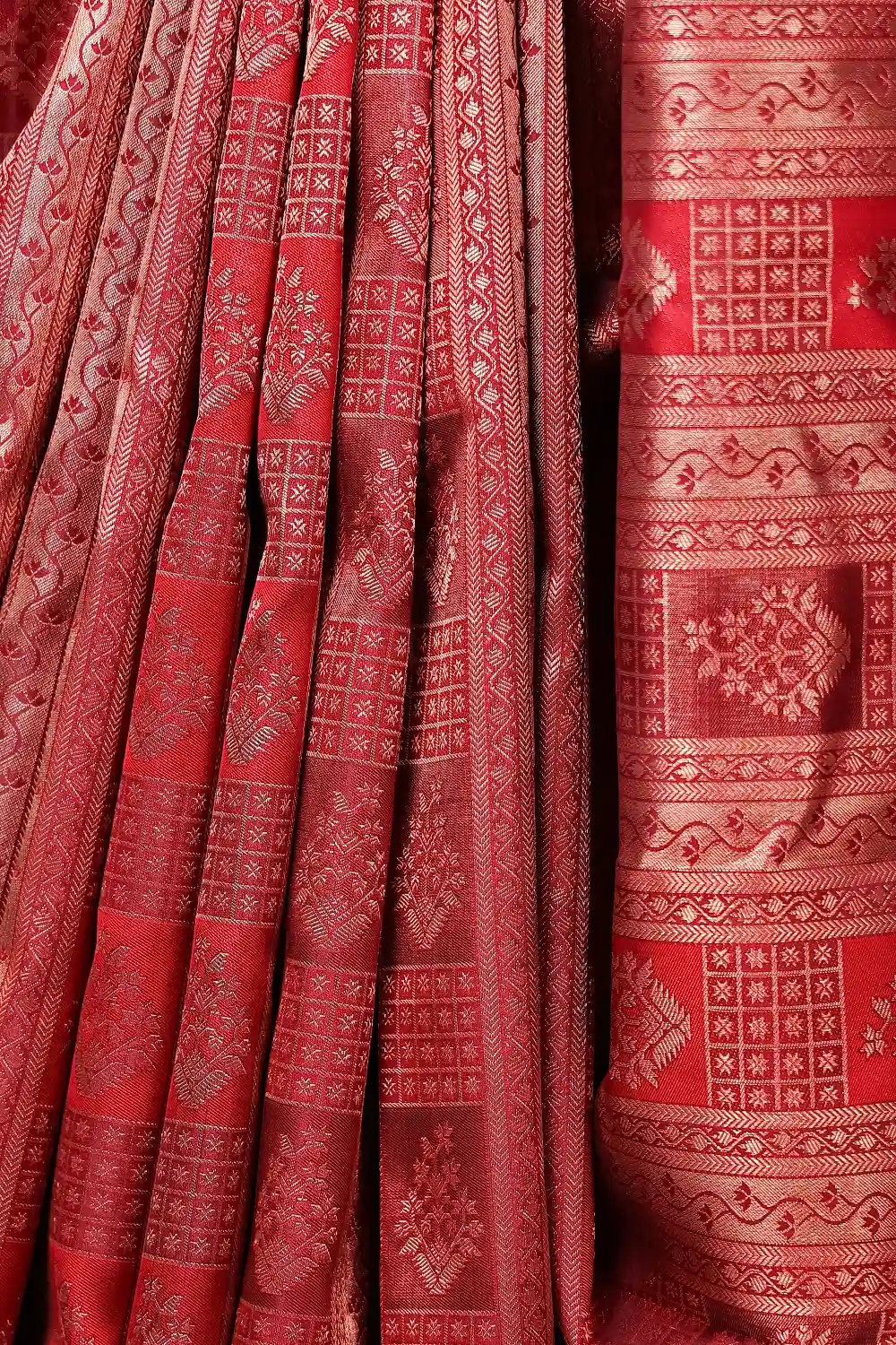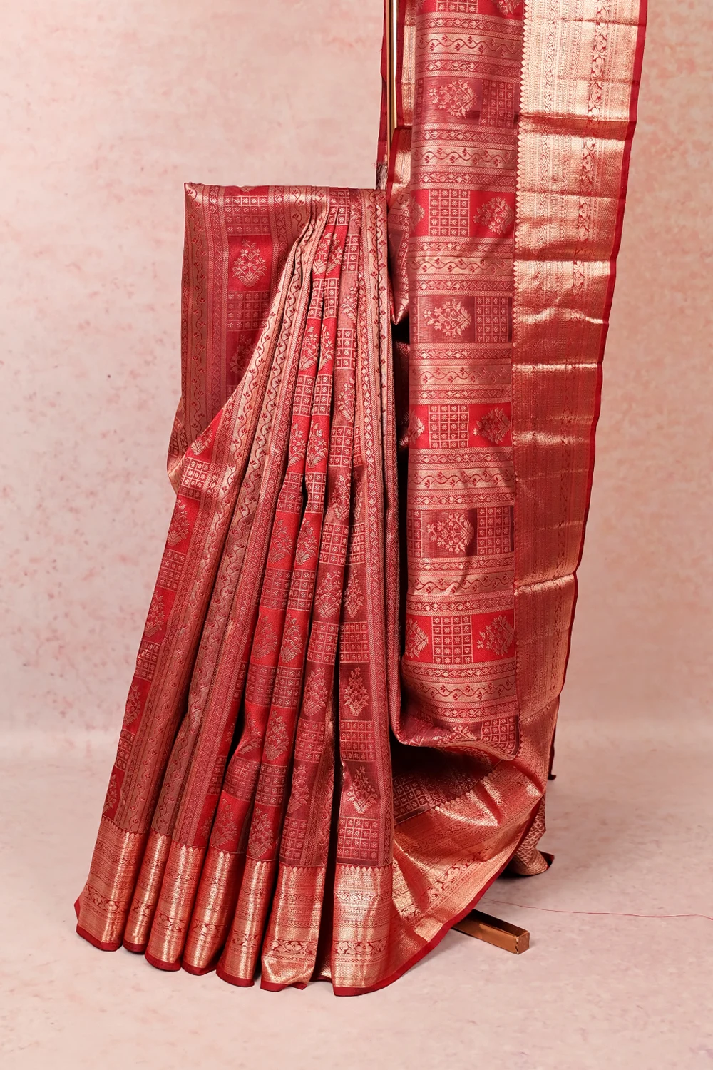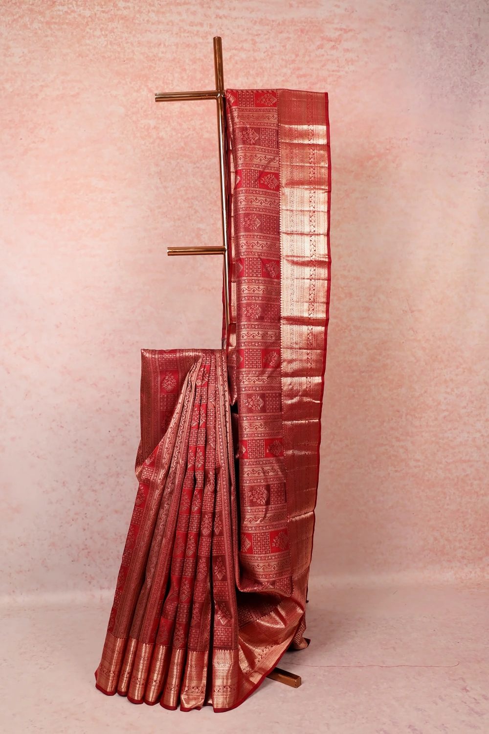Maroon Kancheepuram Silk Brocade Saree with Designer border. Includes Unstitched Blouse