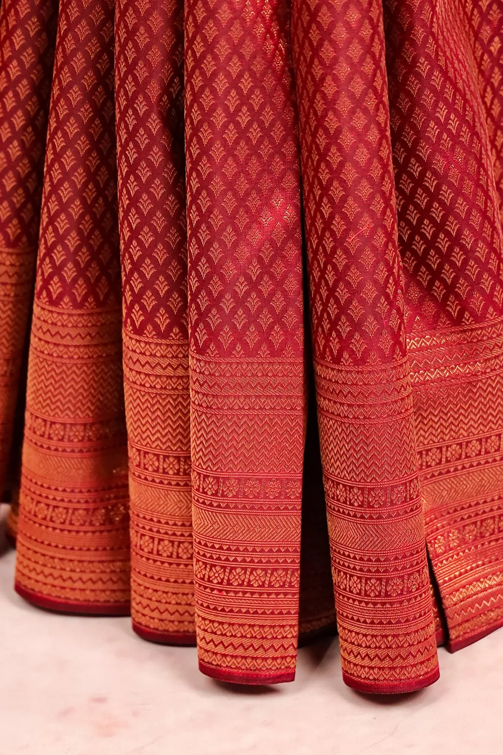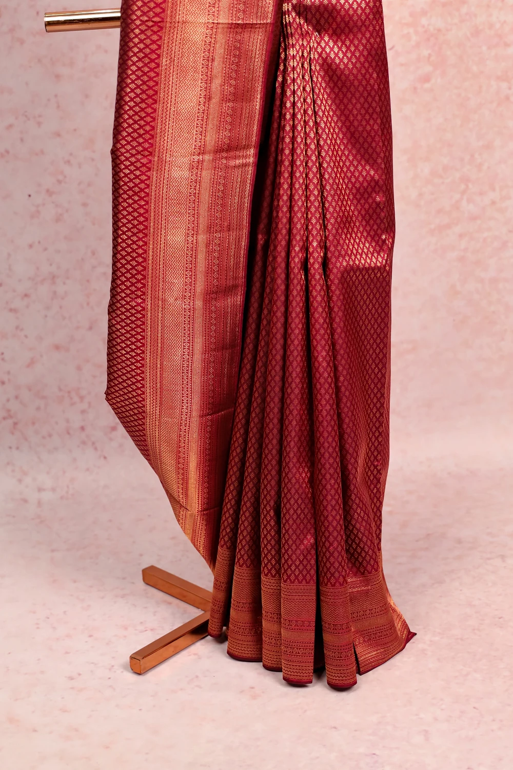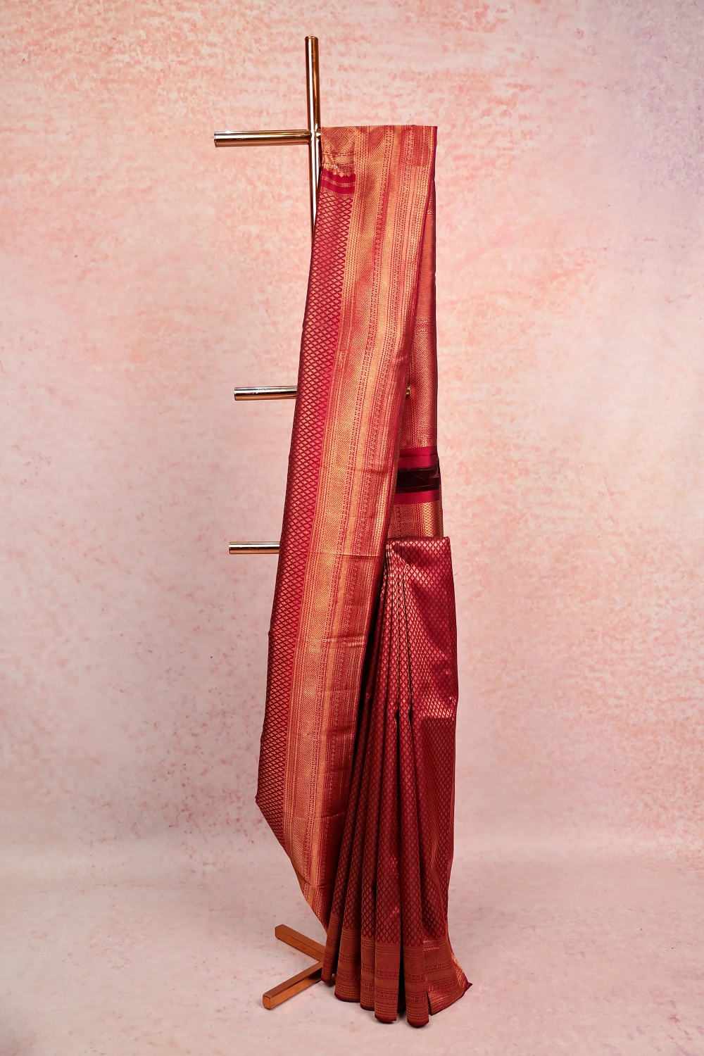 Maroon Kancheepuram Silk Brocade Saree with Designer Border. Includes Unstitched Blouse