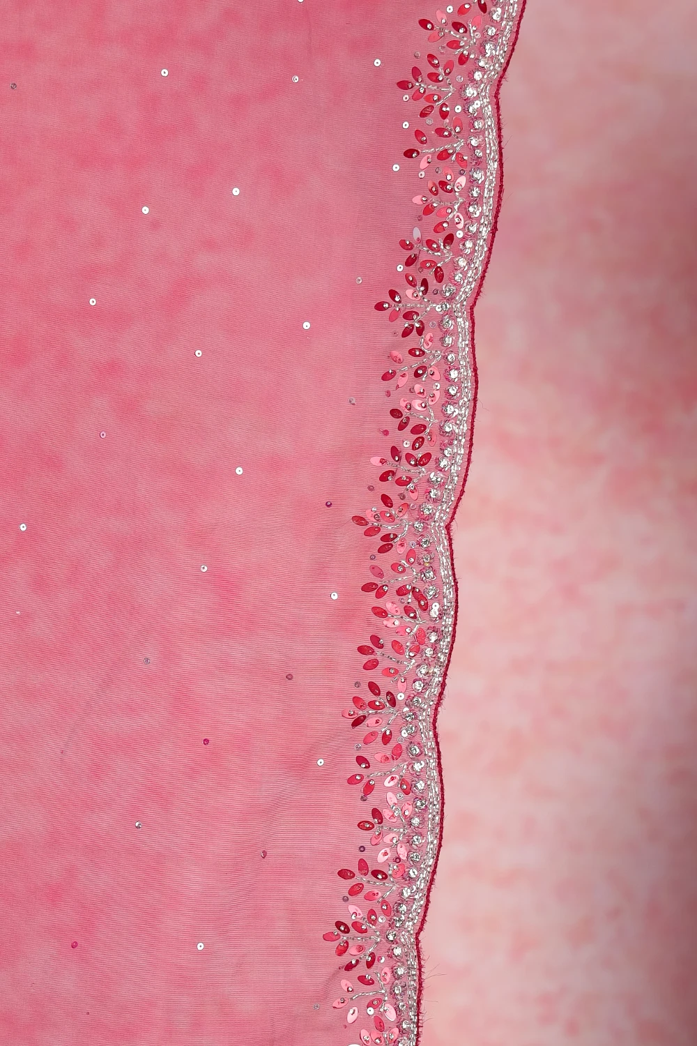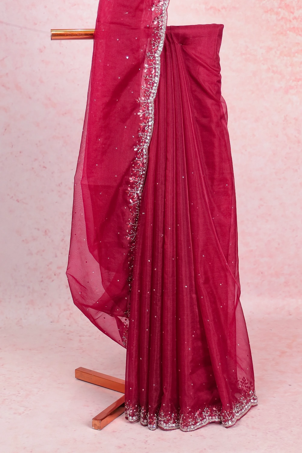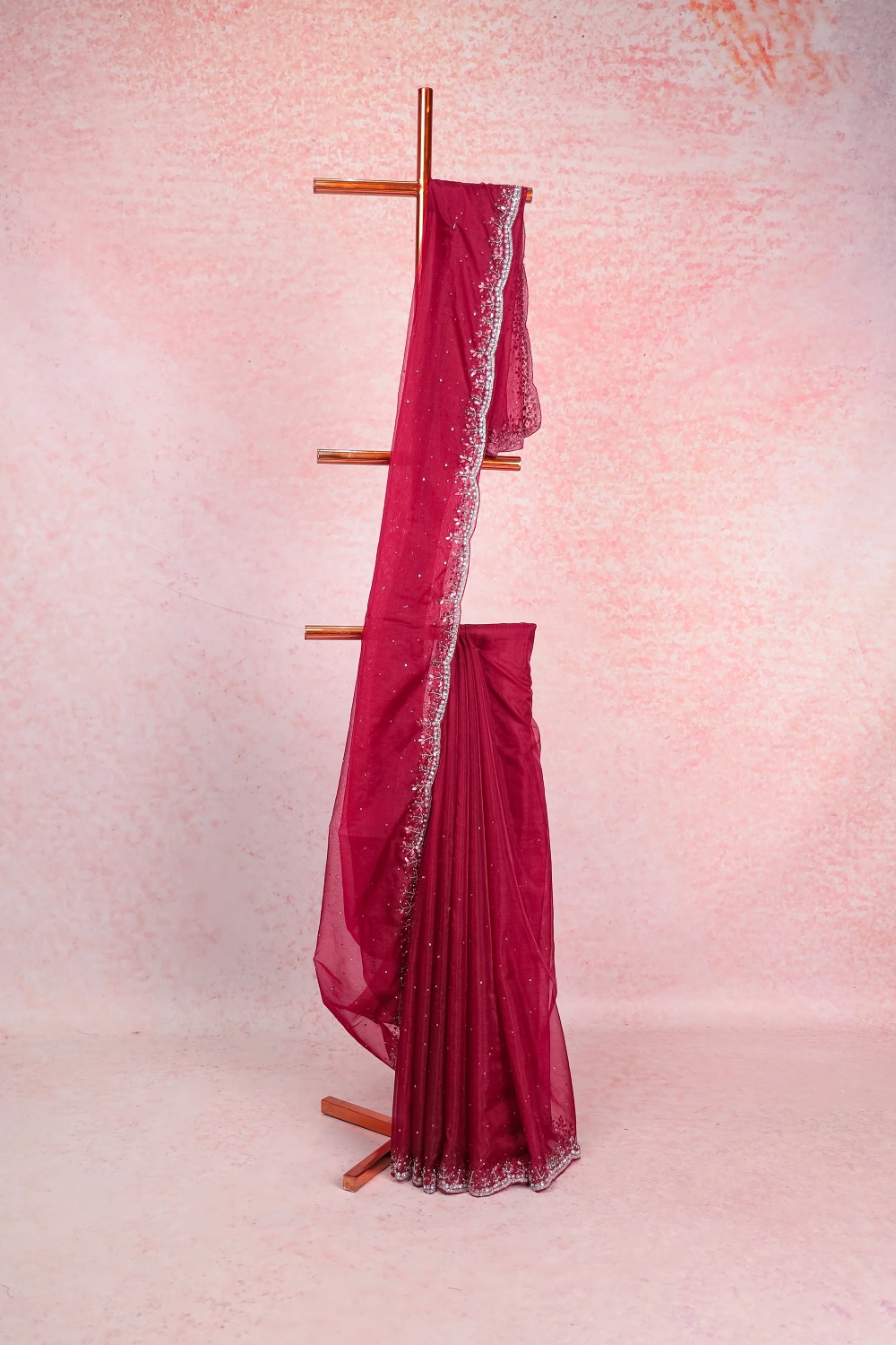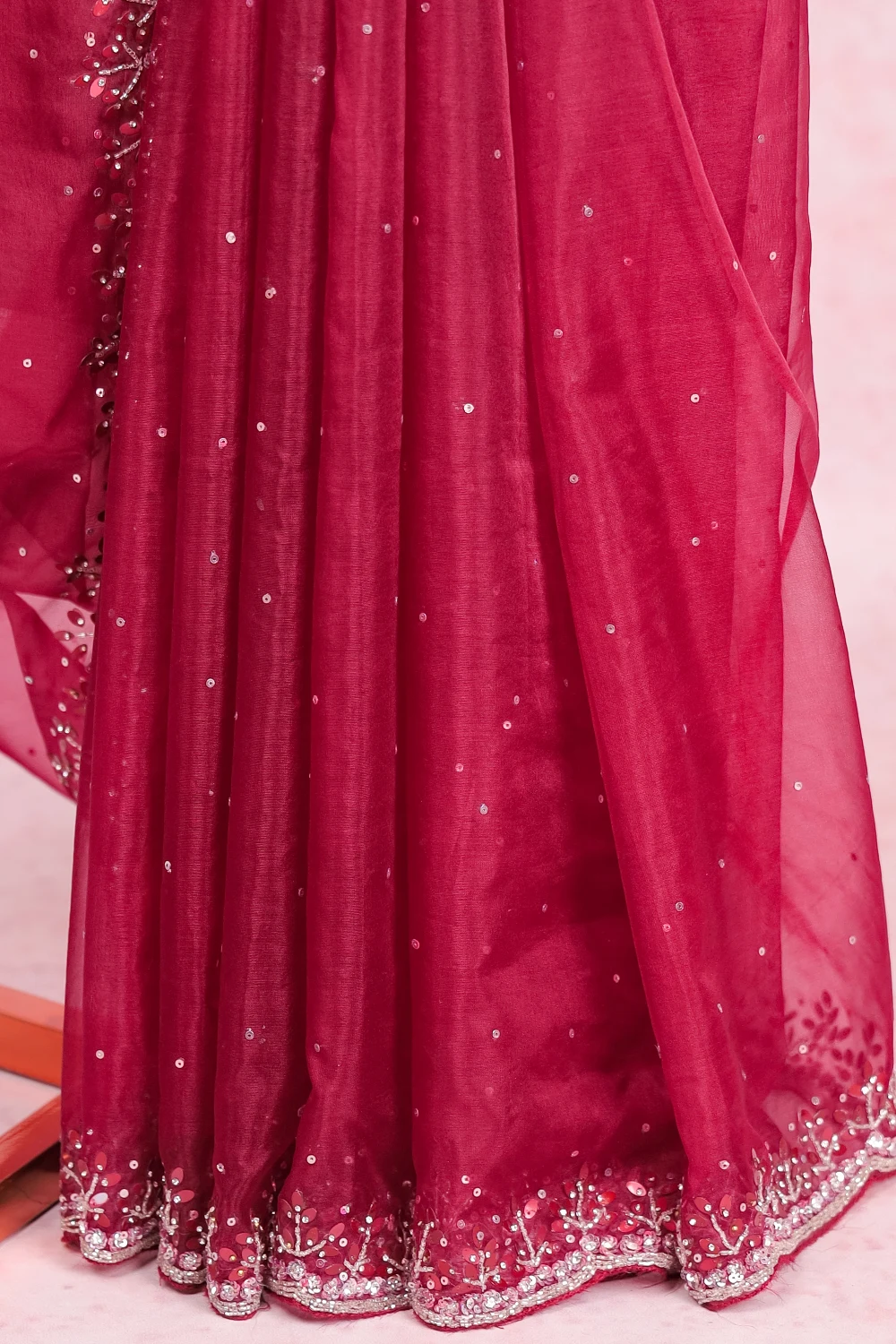 Maroon Organza Sequines Saree with Scalp Border. Includes Unstitched Blouse