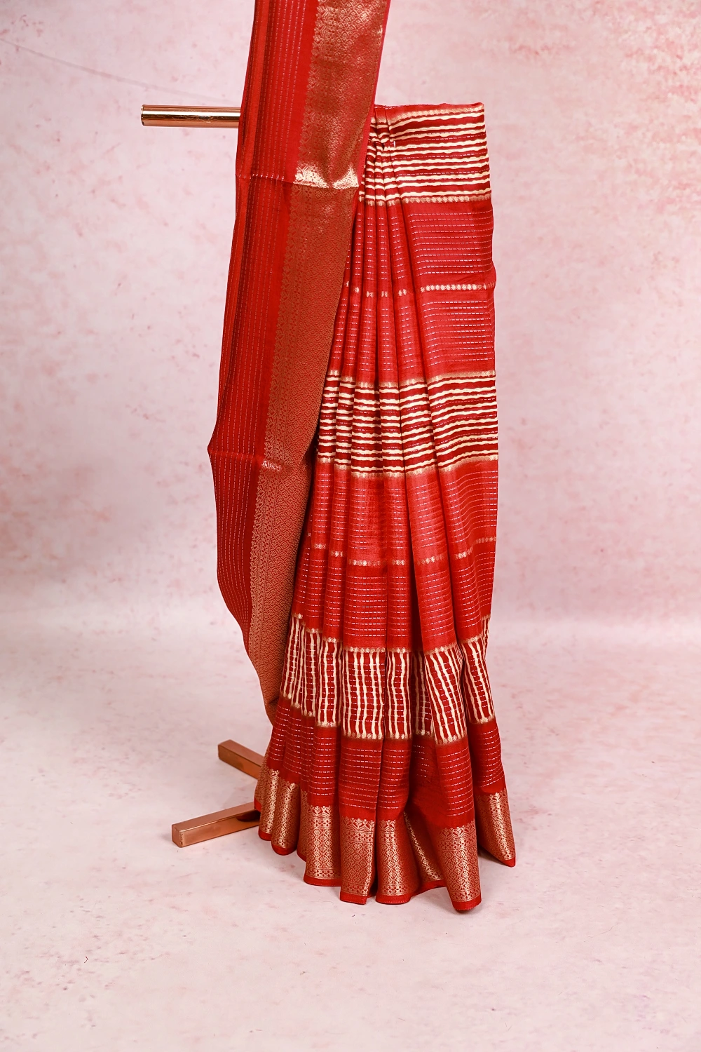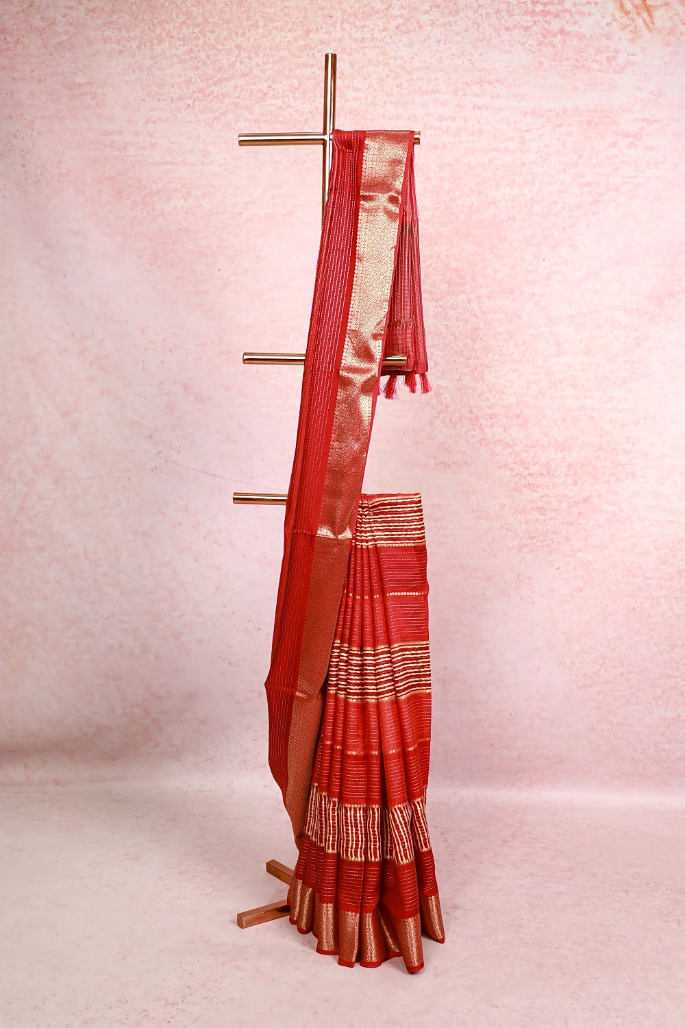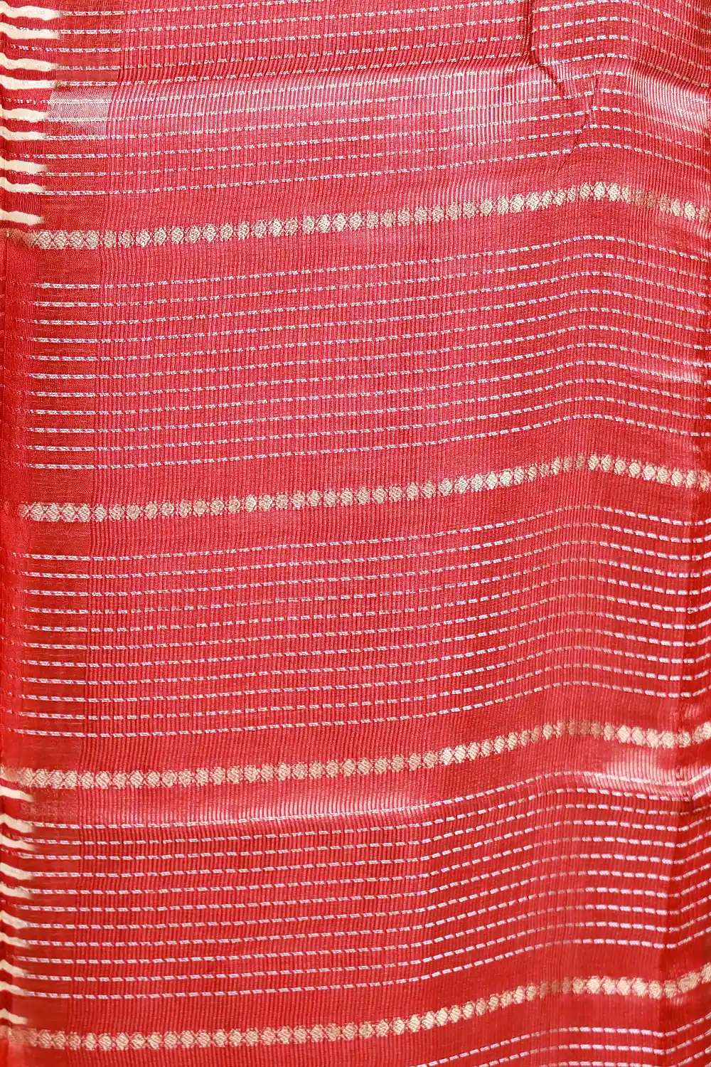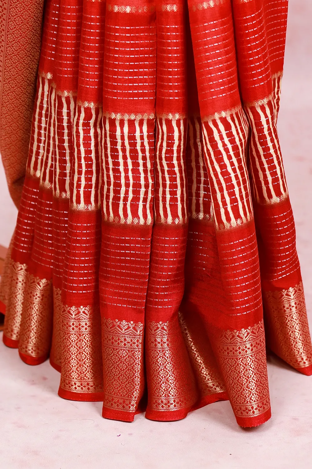 Maroon Red Semi Silk Zari Line Saree With Banarasi Border. Includes Unstitched Blouse