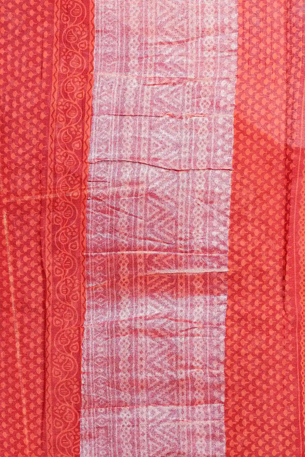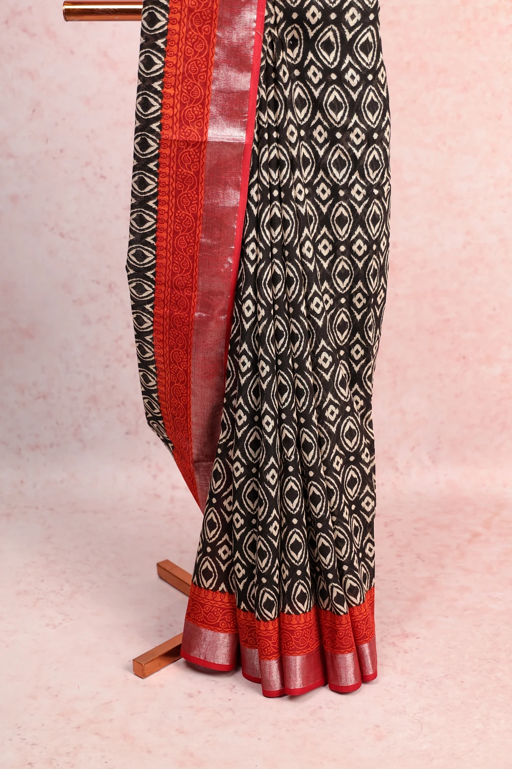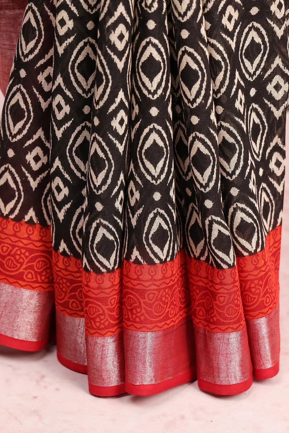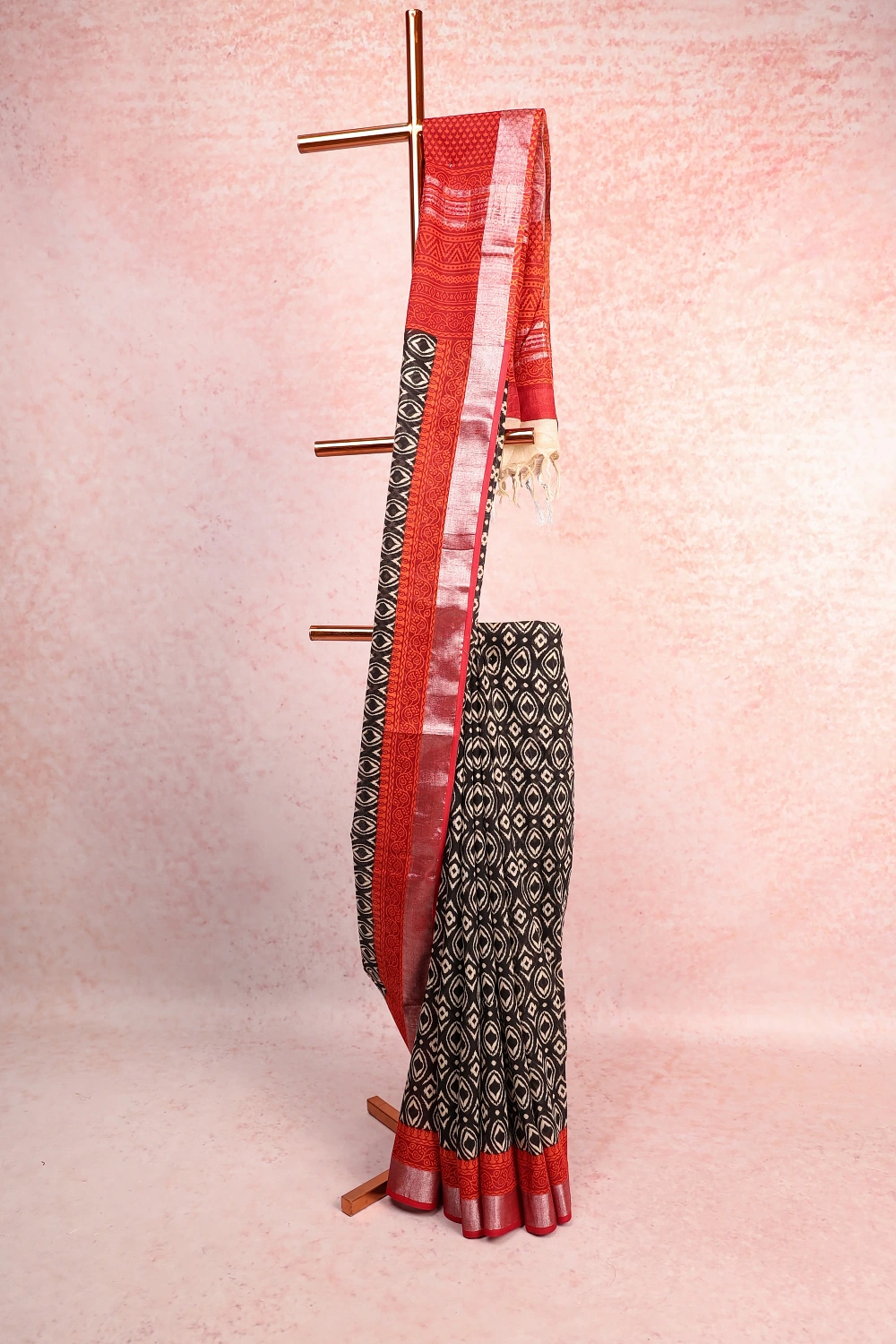 Maroon Semi Linen Printed Saree with Contrast Border. Includes Un stitched Blouse