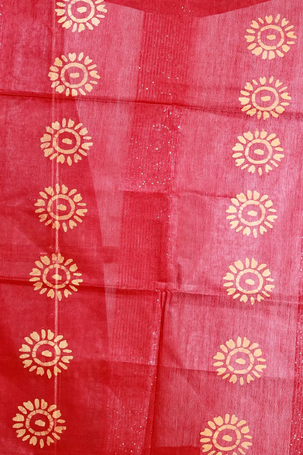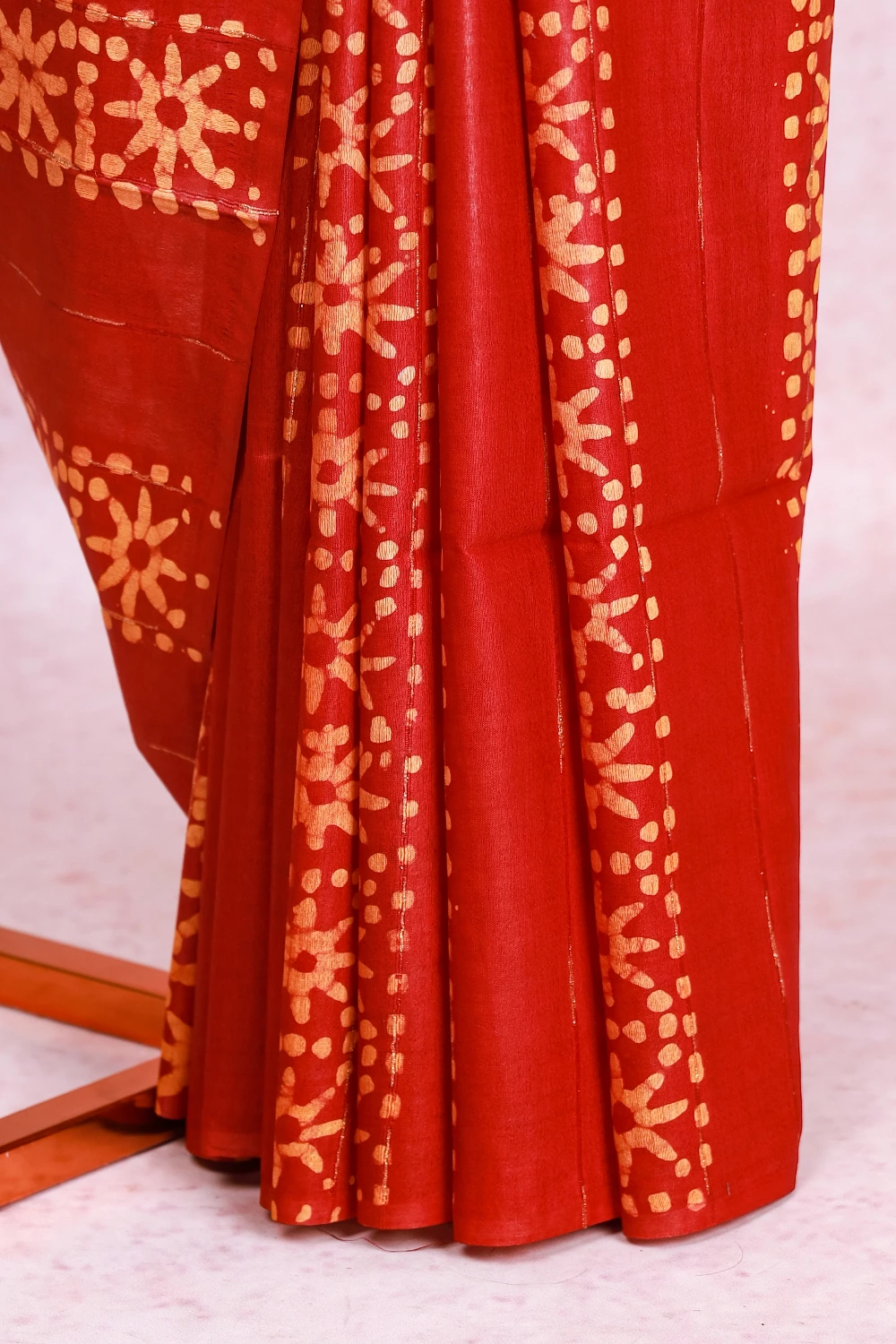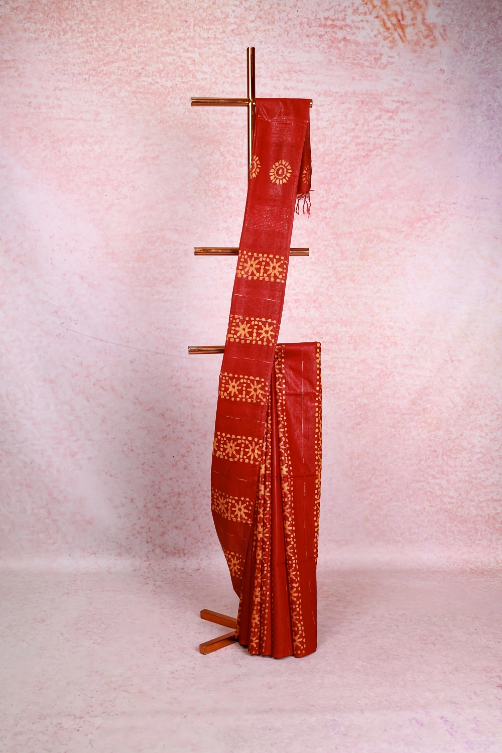 Maroon Semi Tussar Bandhani Printed Saree with Bandhani Border. Includes Unstitched Blouse