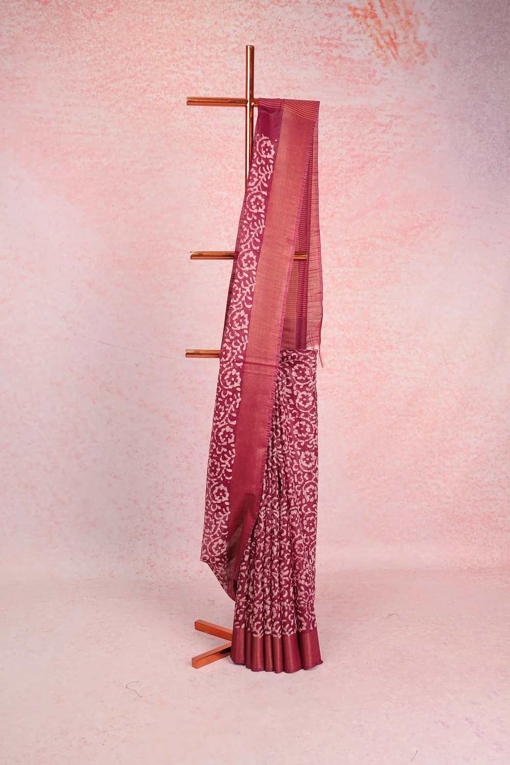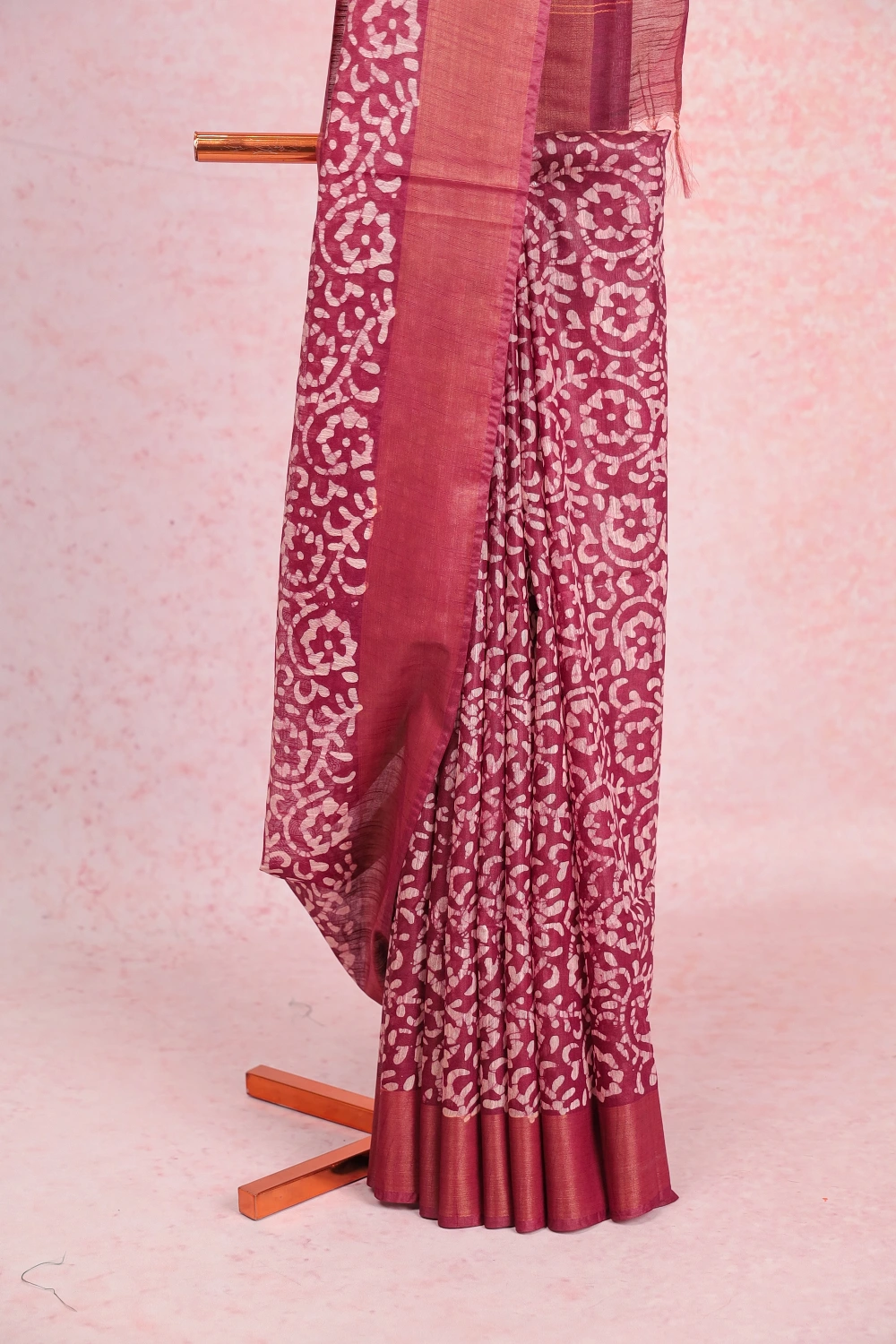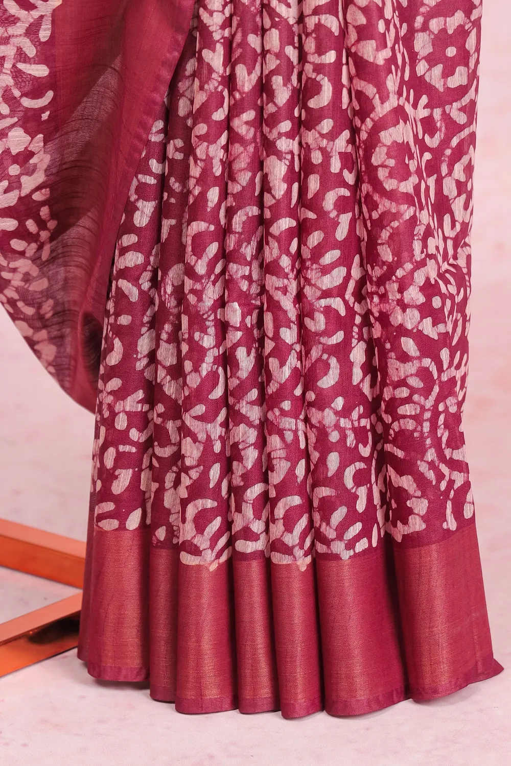 Maroon Semi Tussar Printed Saree With Plain Border. Includes Unstitched Blouse