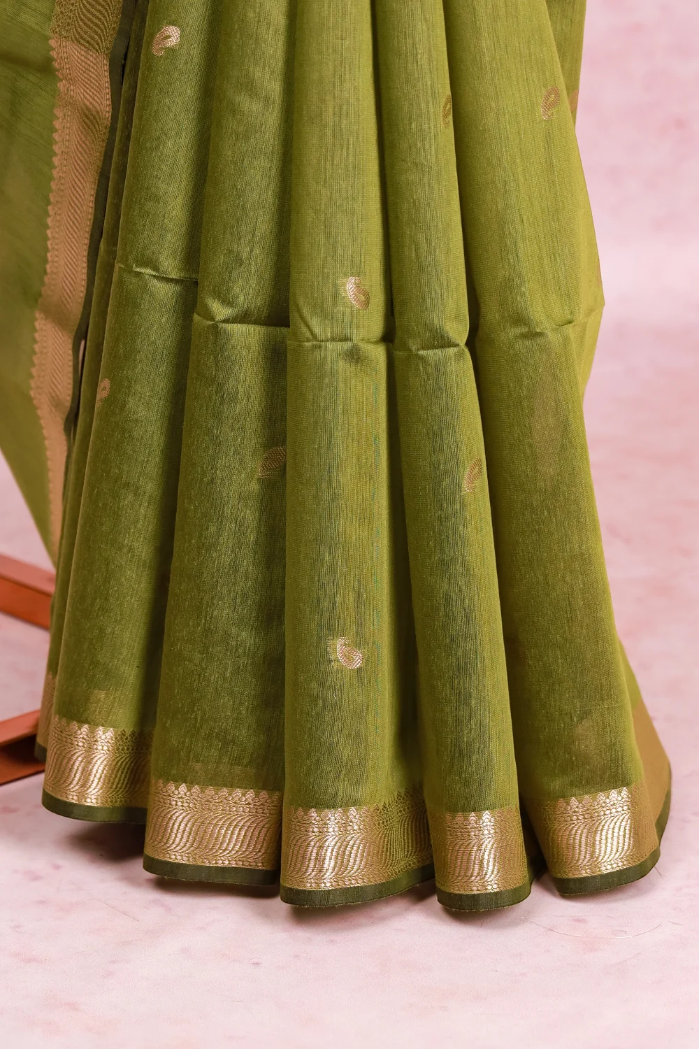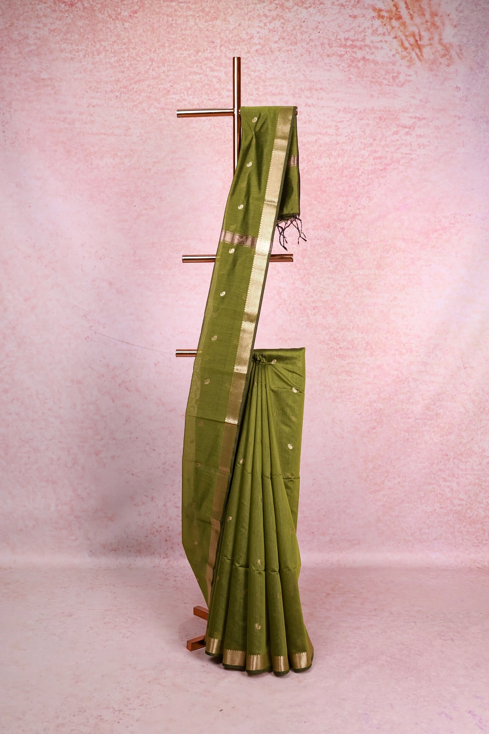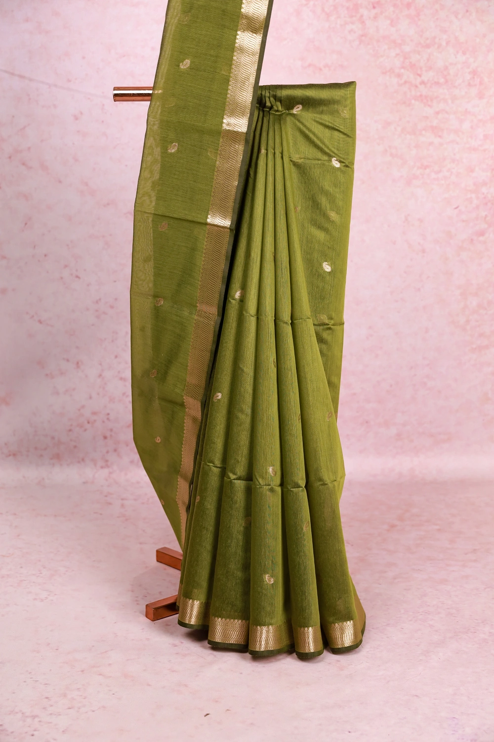 Mehandi Green Cotton Silk Mango Butta Saree With Zari Border. Includes Un Stitched Blouse