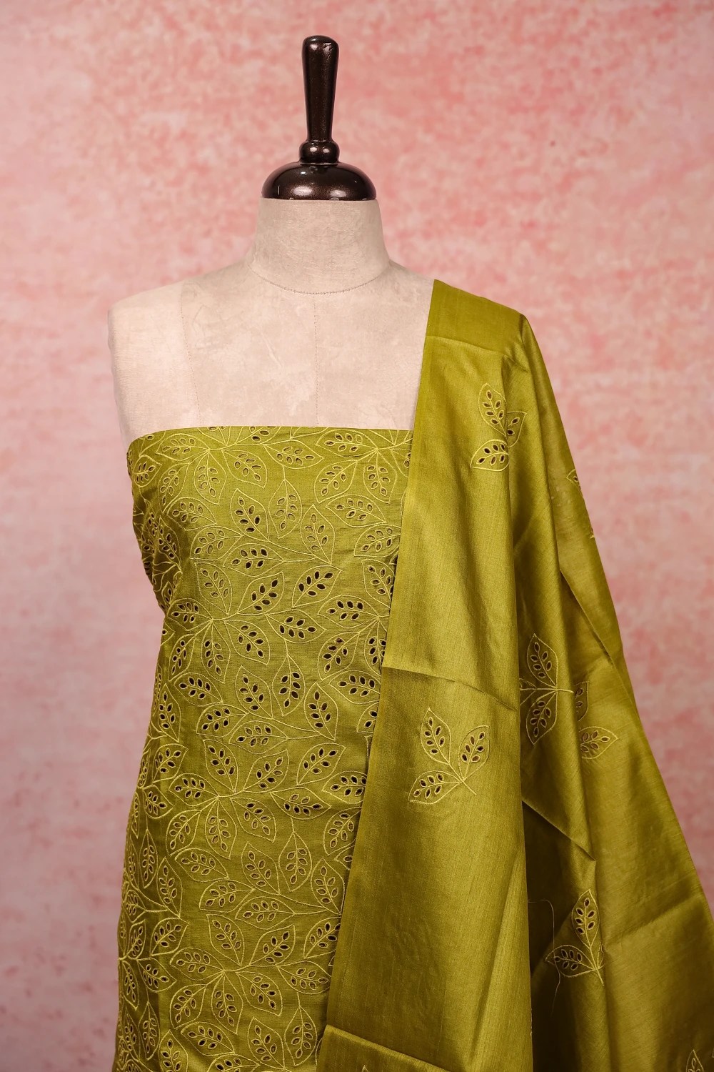 Mehandi Green Tussar Silk Cutt Work Unstitched Churidar Material. Includes Dupatta.