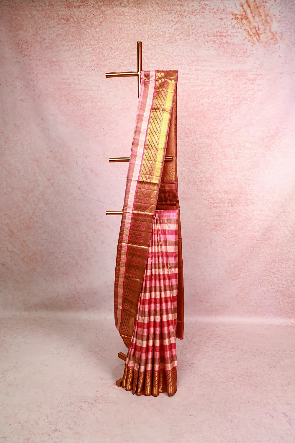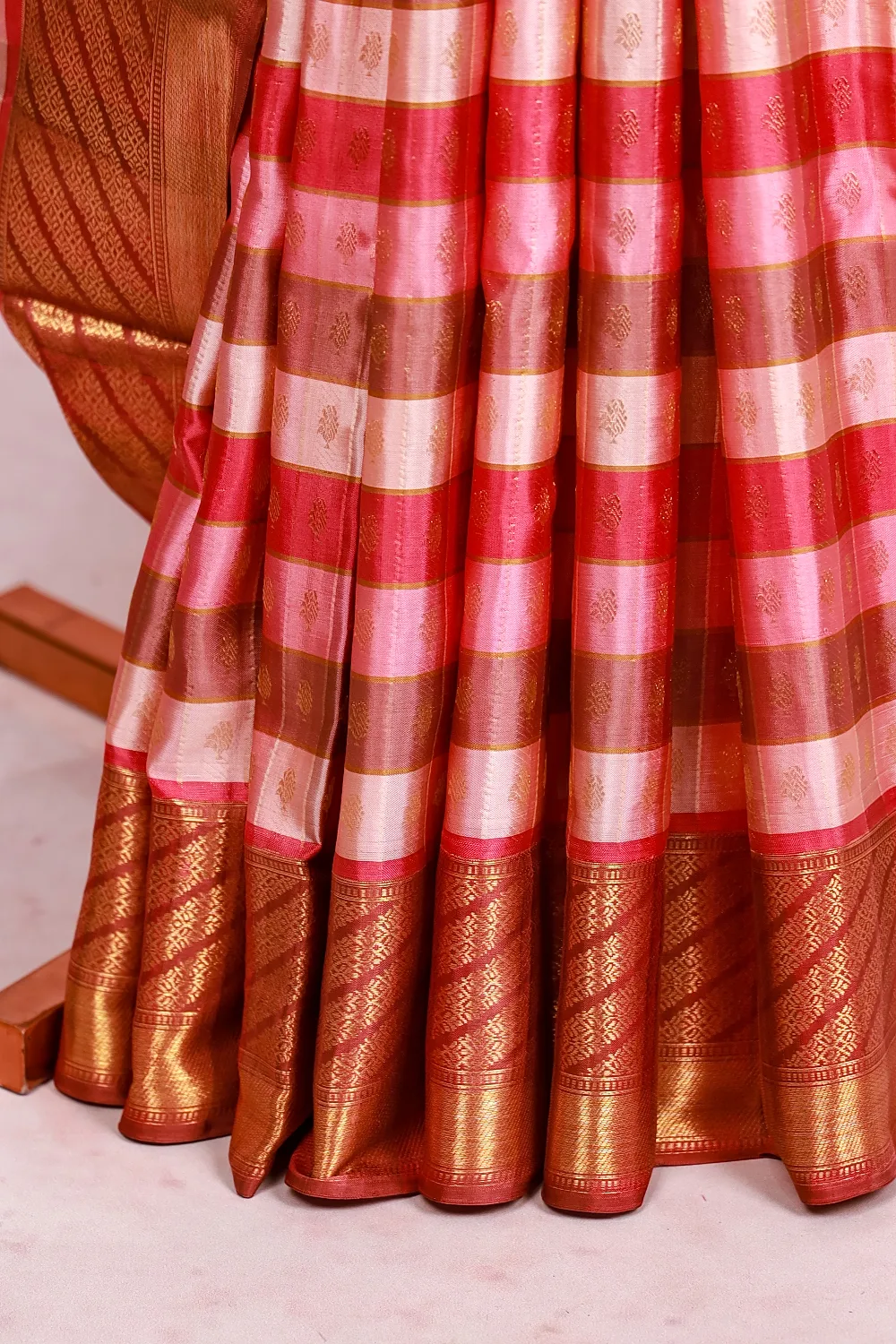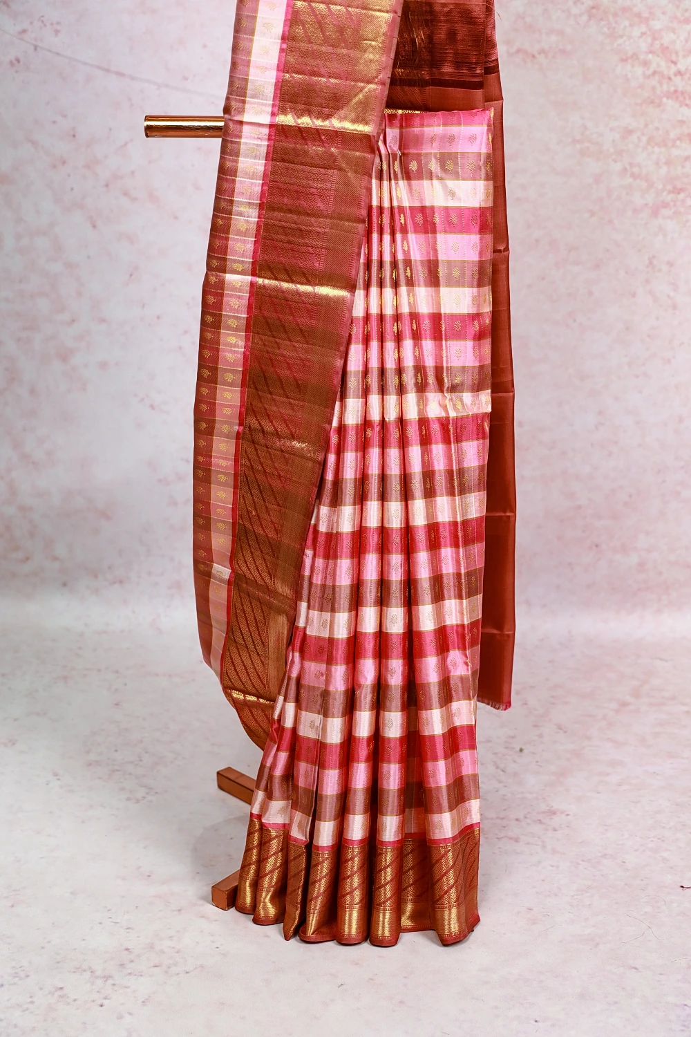 Multi Color Kancheepuram Silk Checked Butta Saree With Traditional Zari Border. Includes Unstitched Blouse