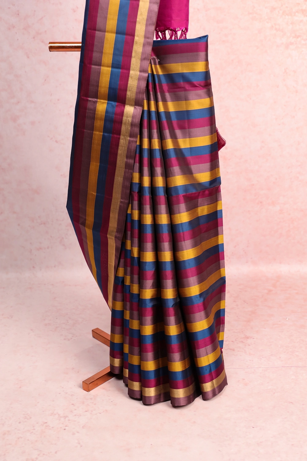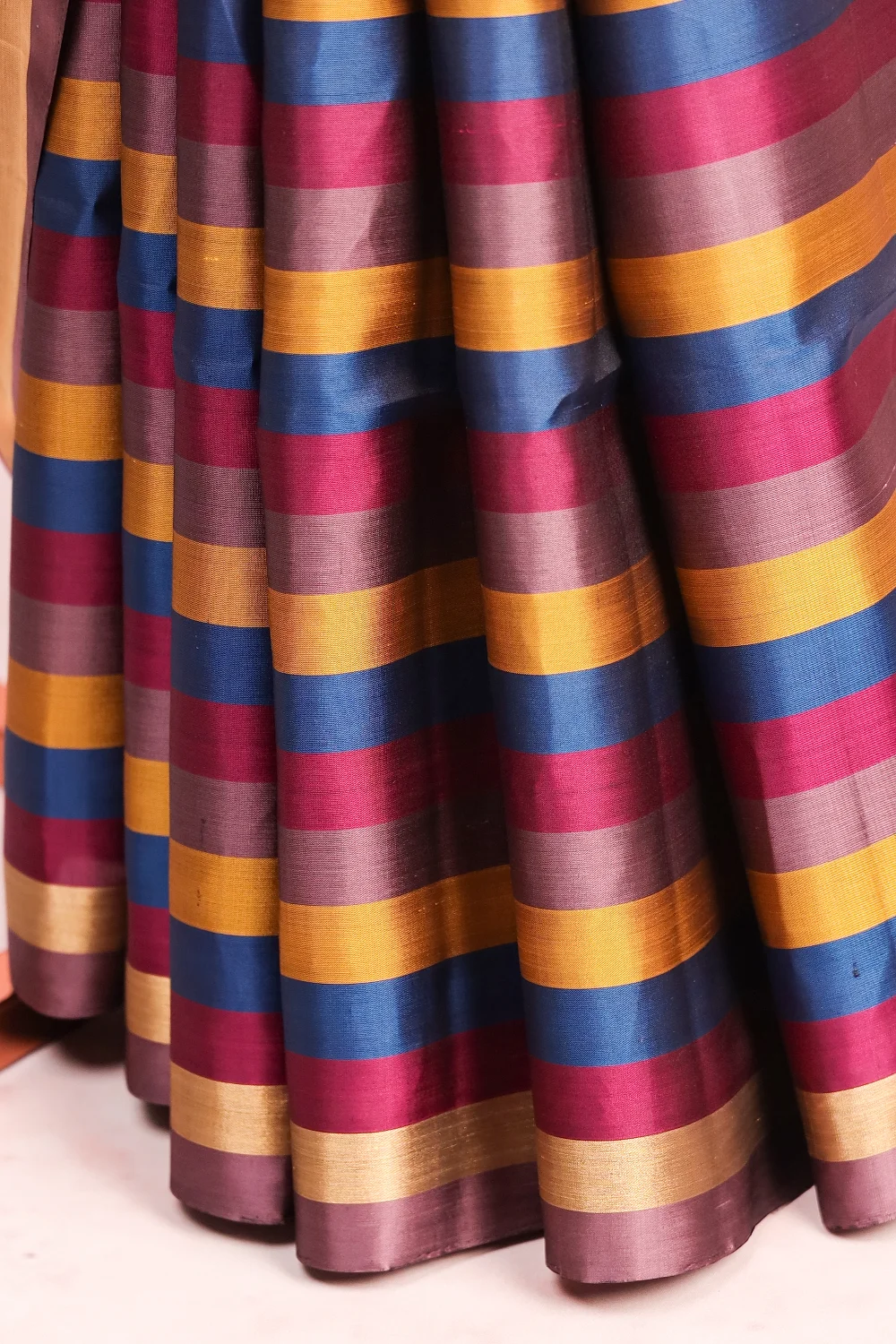 Multi Color Kancheepuram Soft Silk Lines Saree with Small Border. Includes Un stitched Blouse