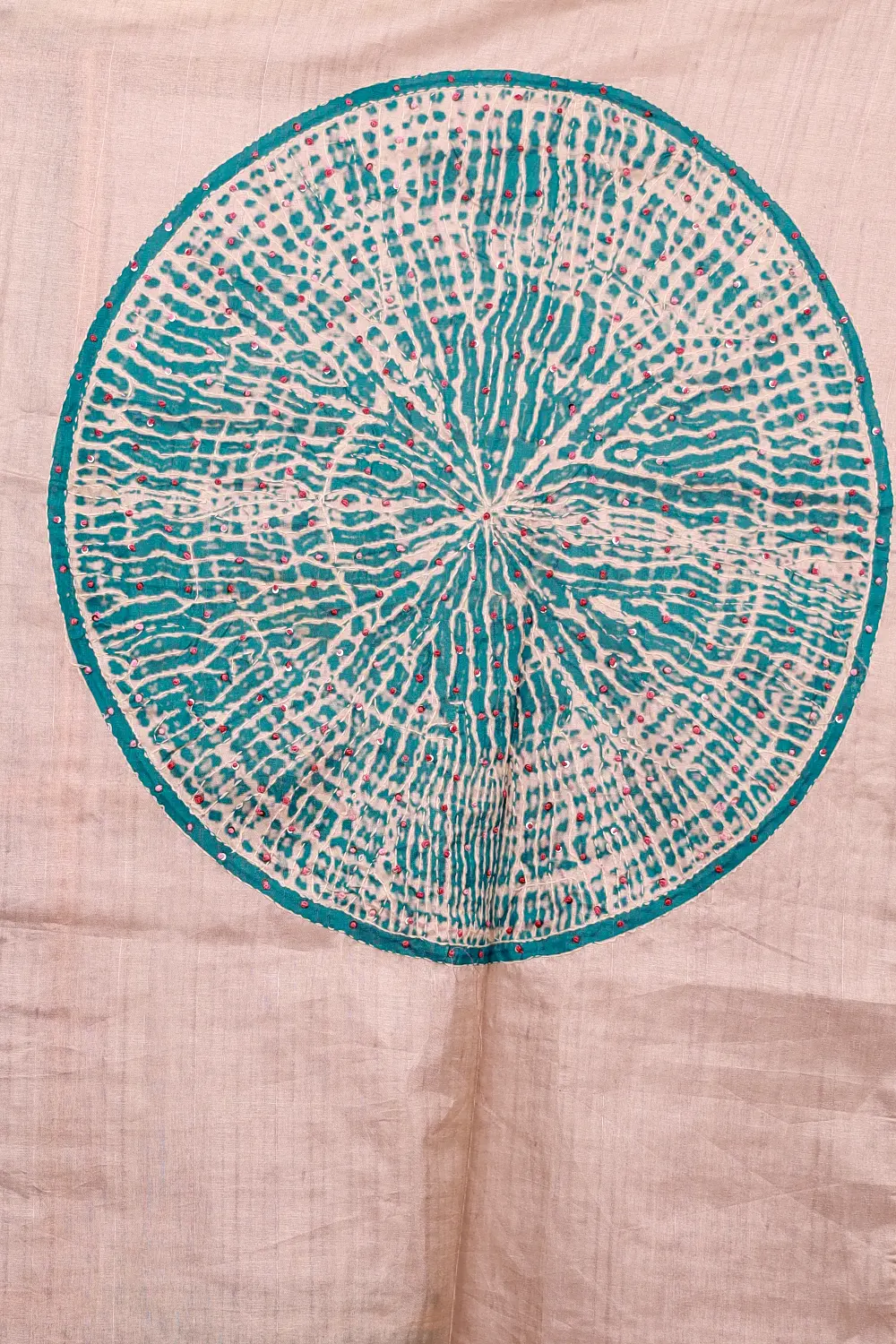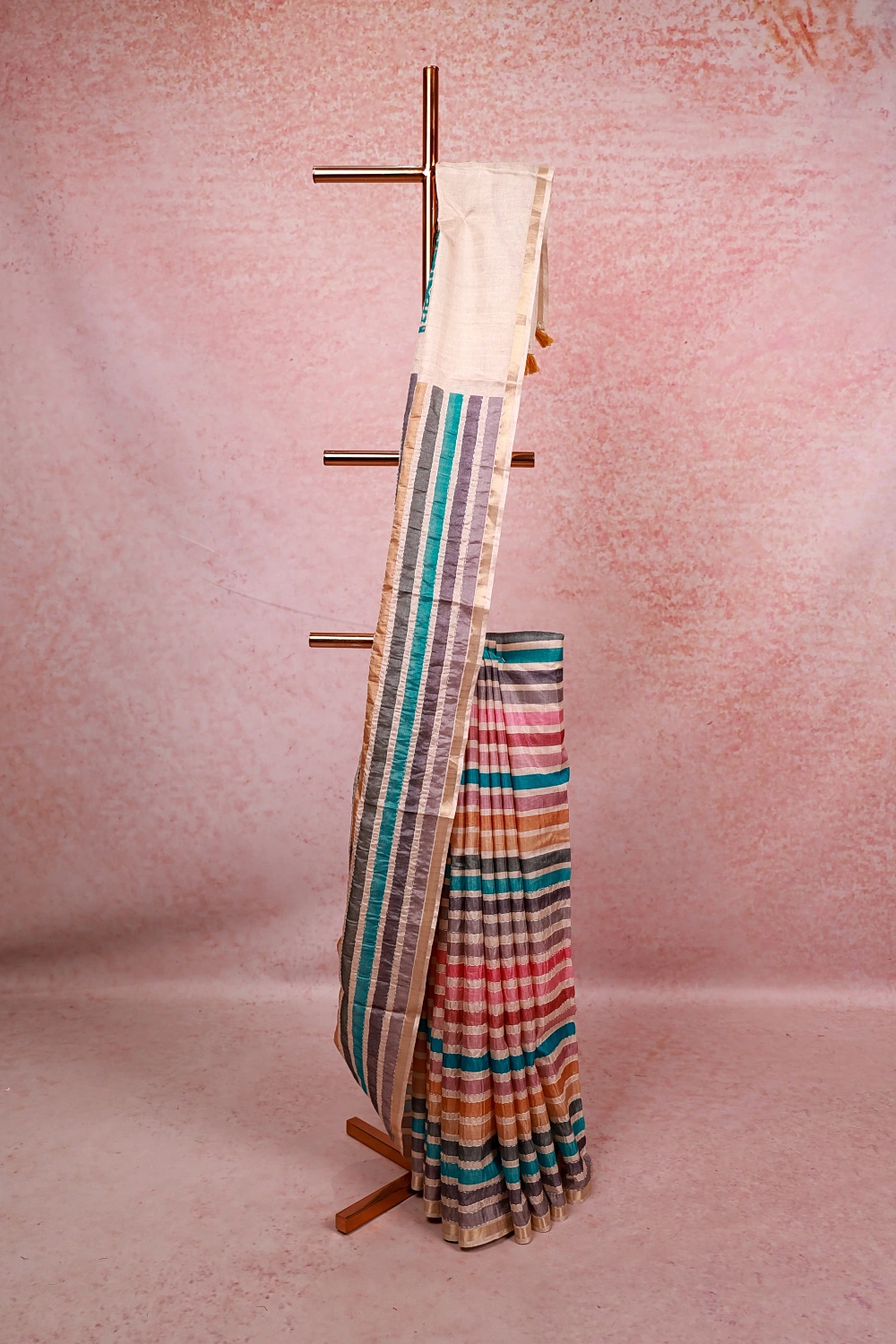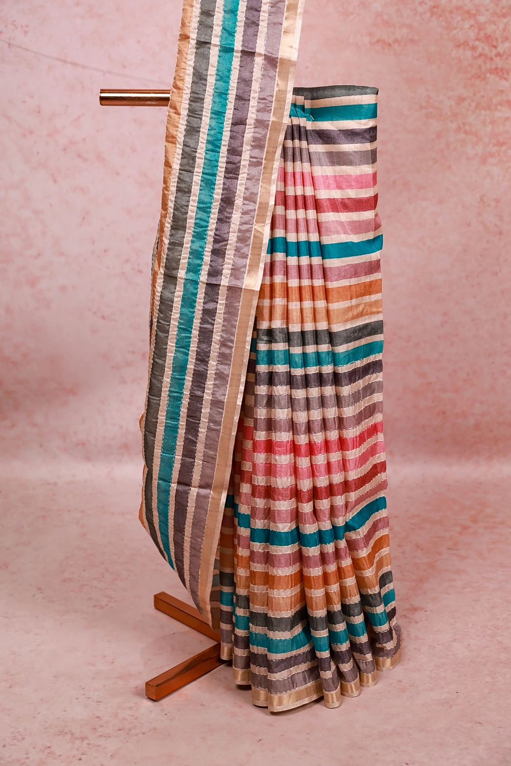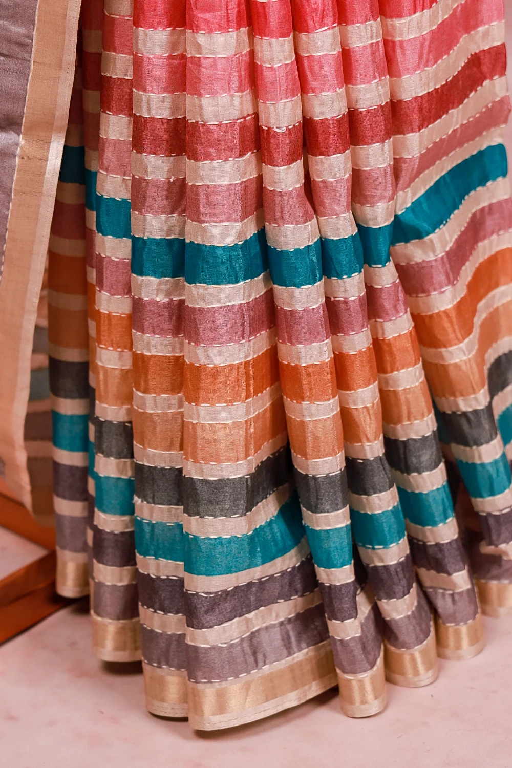 Multi Color Semi Silk Kantha Stitched Saree With Small Border. Includes Unstitched Blouse