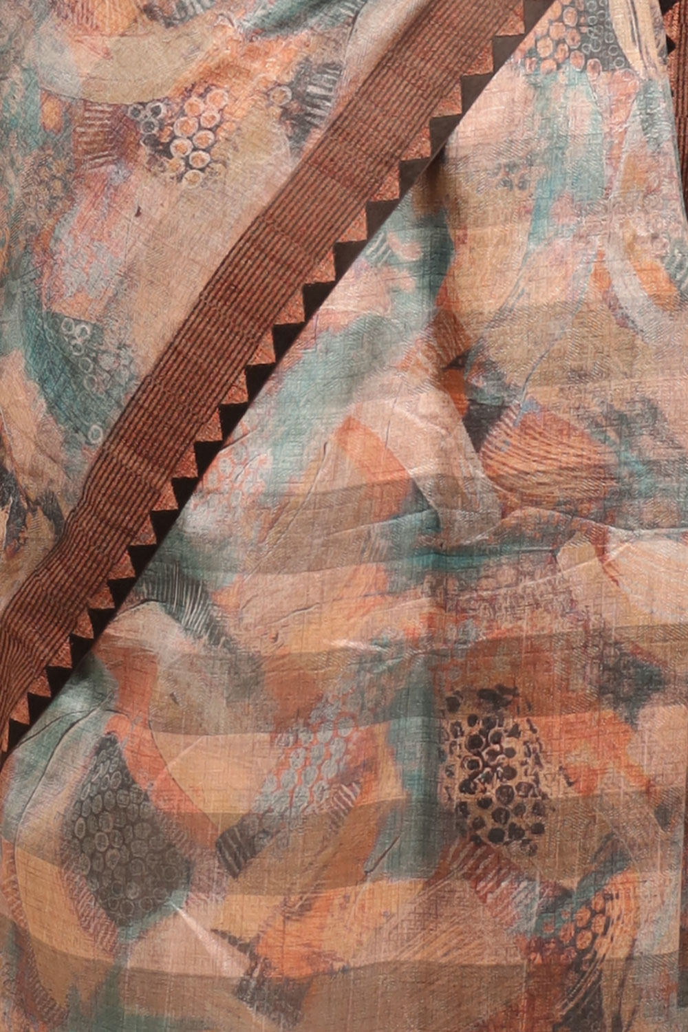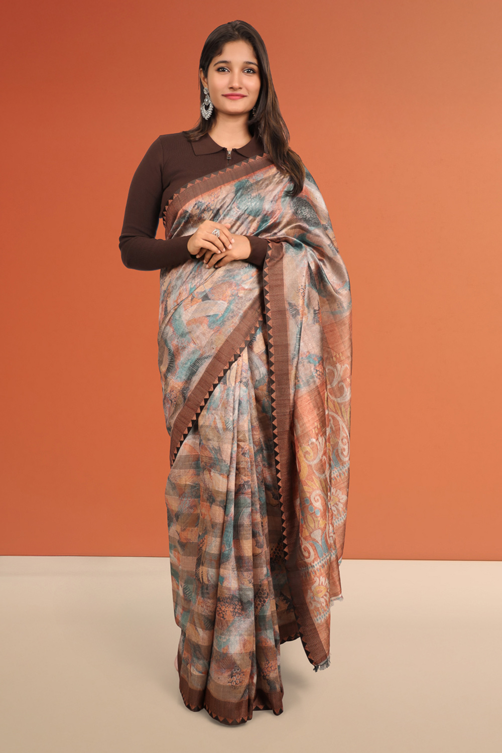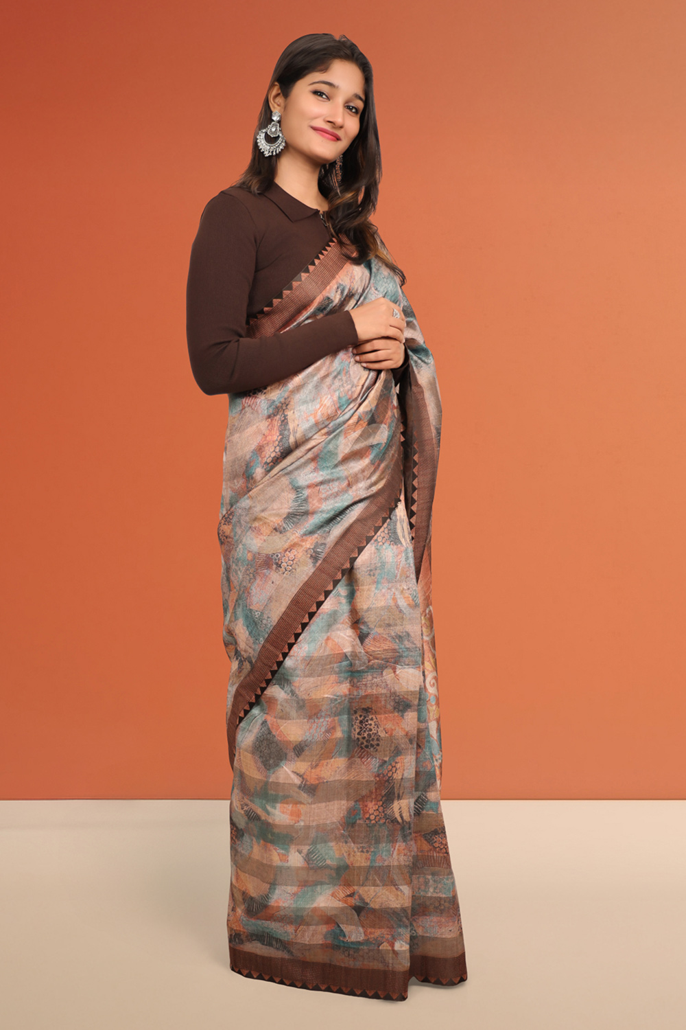 Multi Color Semi Tussar Printed Saree with Printed border. Includes unstitched Blouse