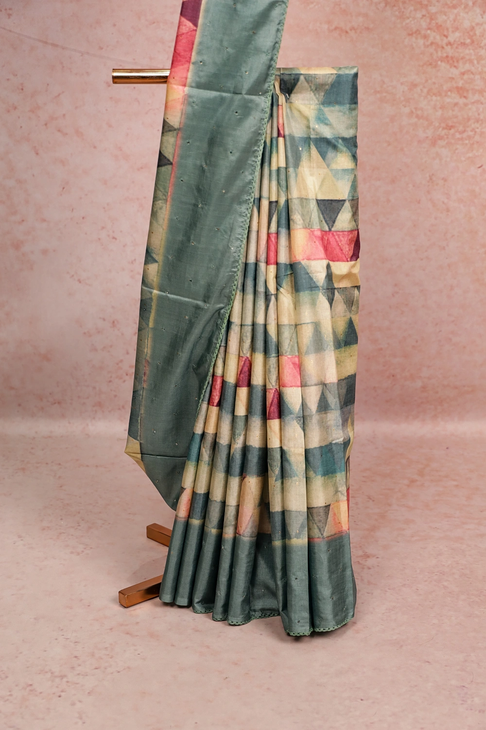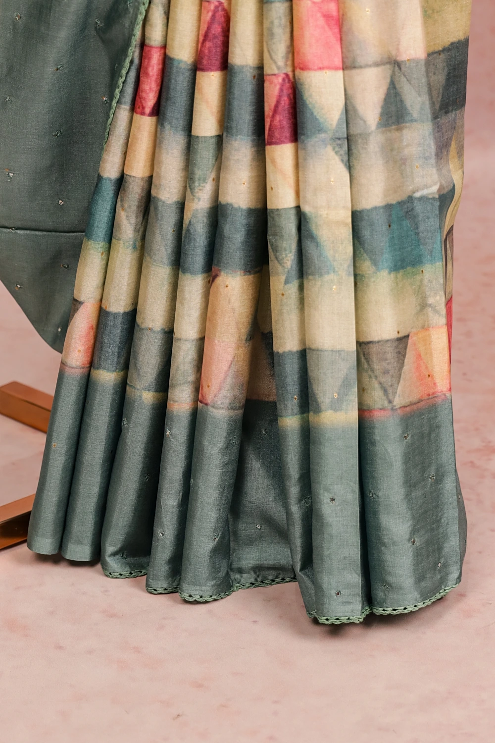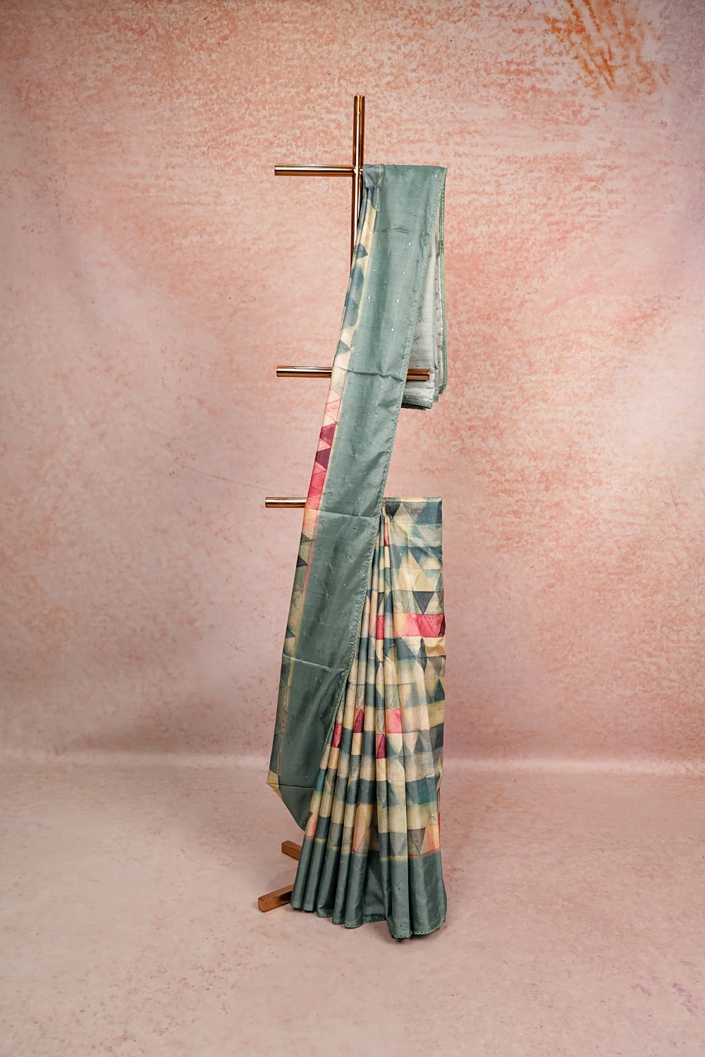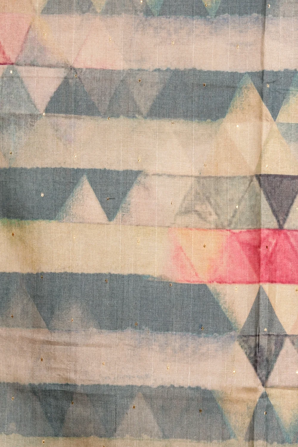 Multi Colour Soft Triangle Design Saree With Mirror Work Border. Includes Unstitched Blouse