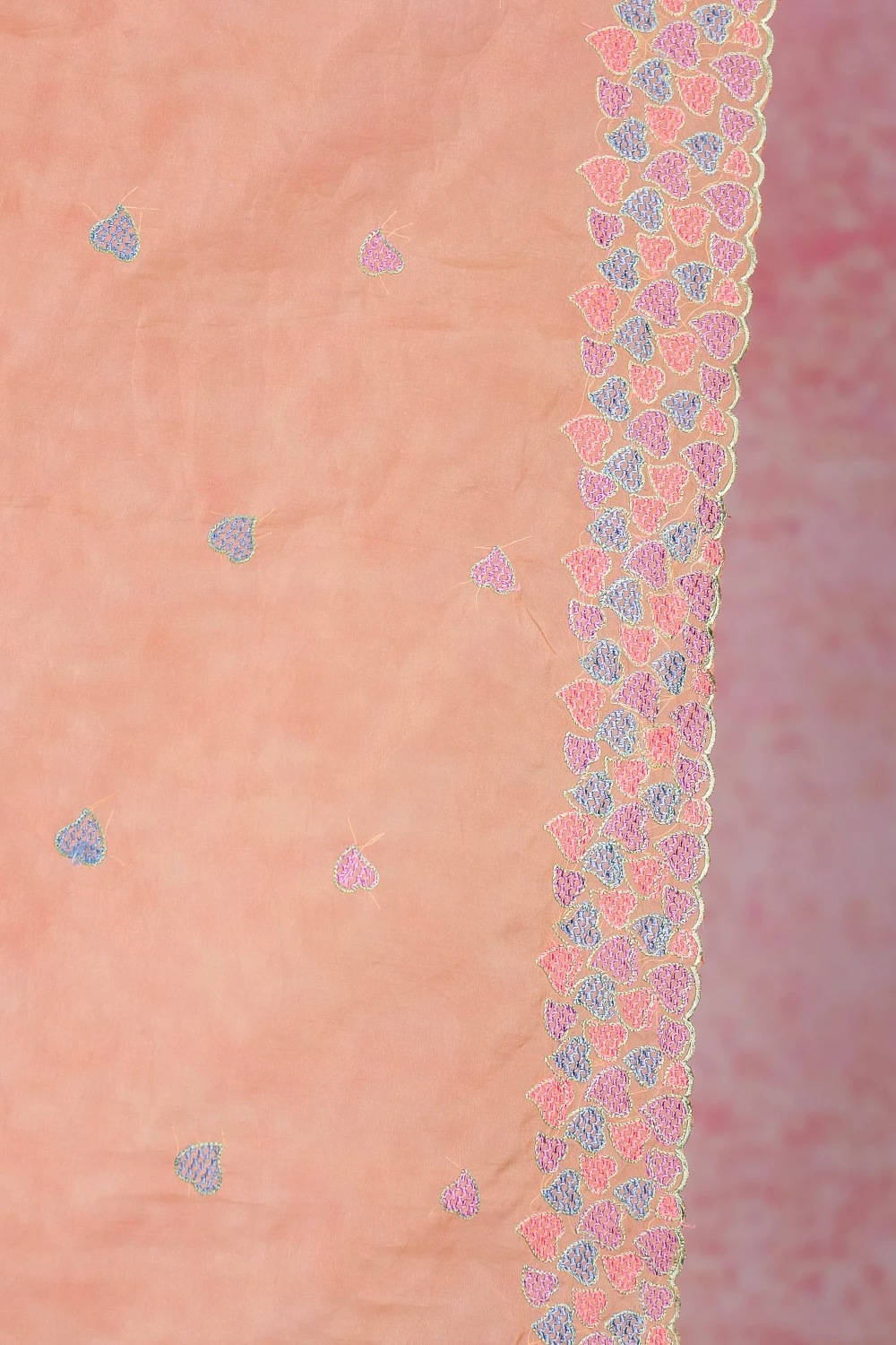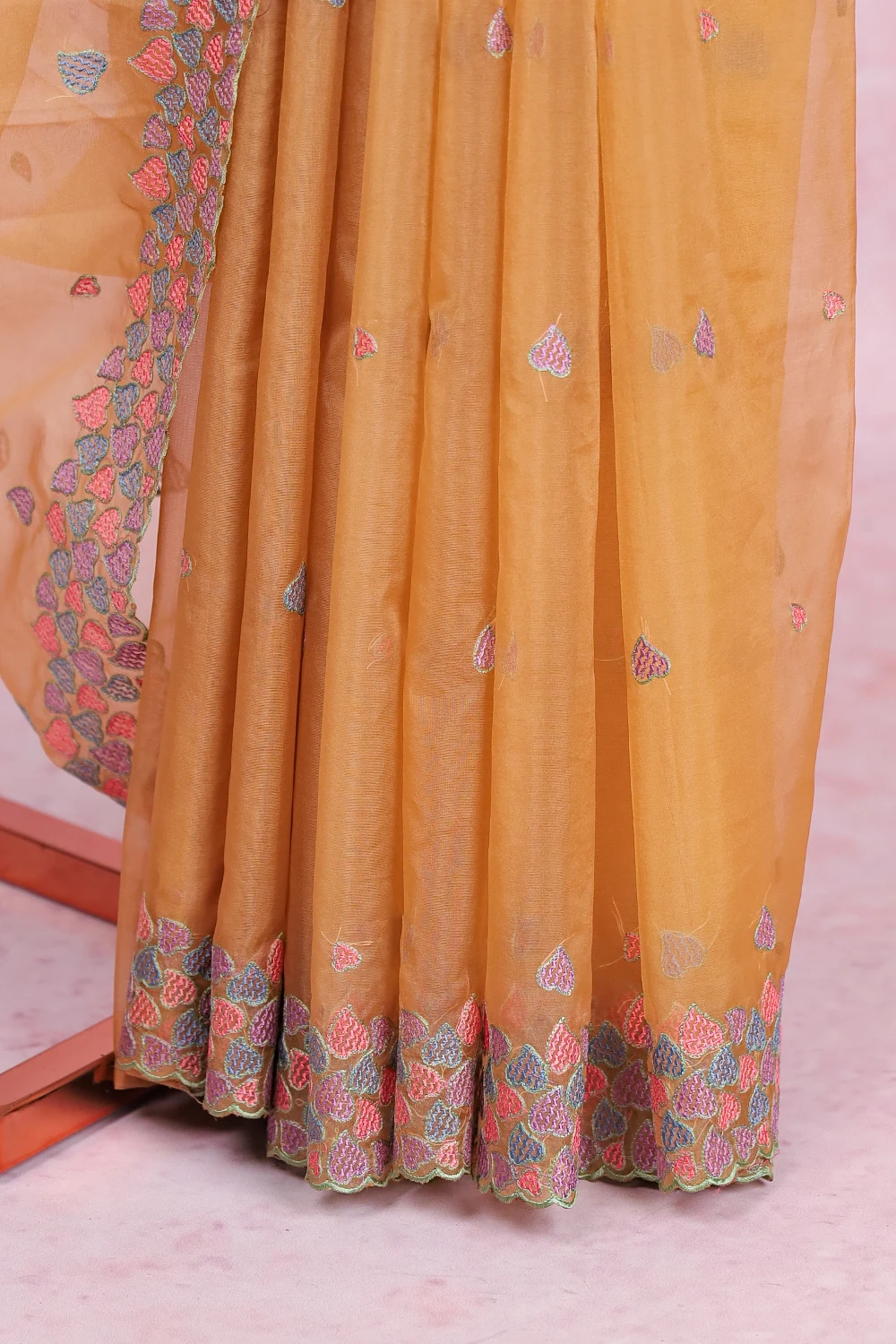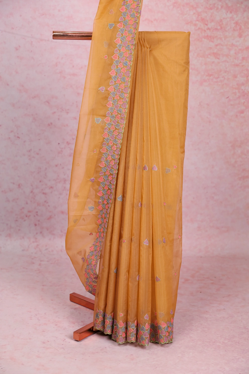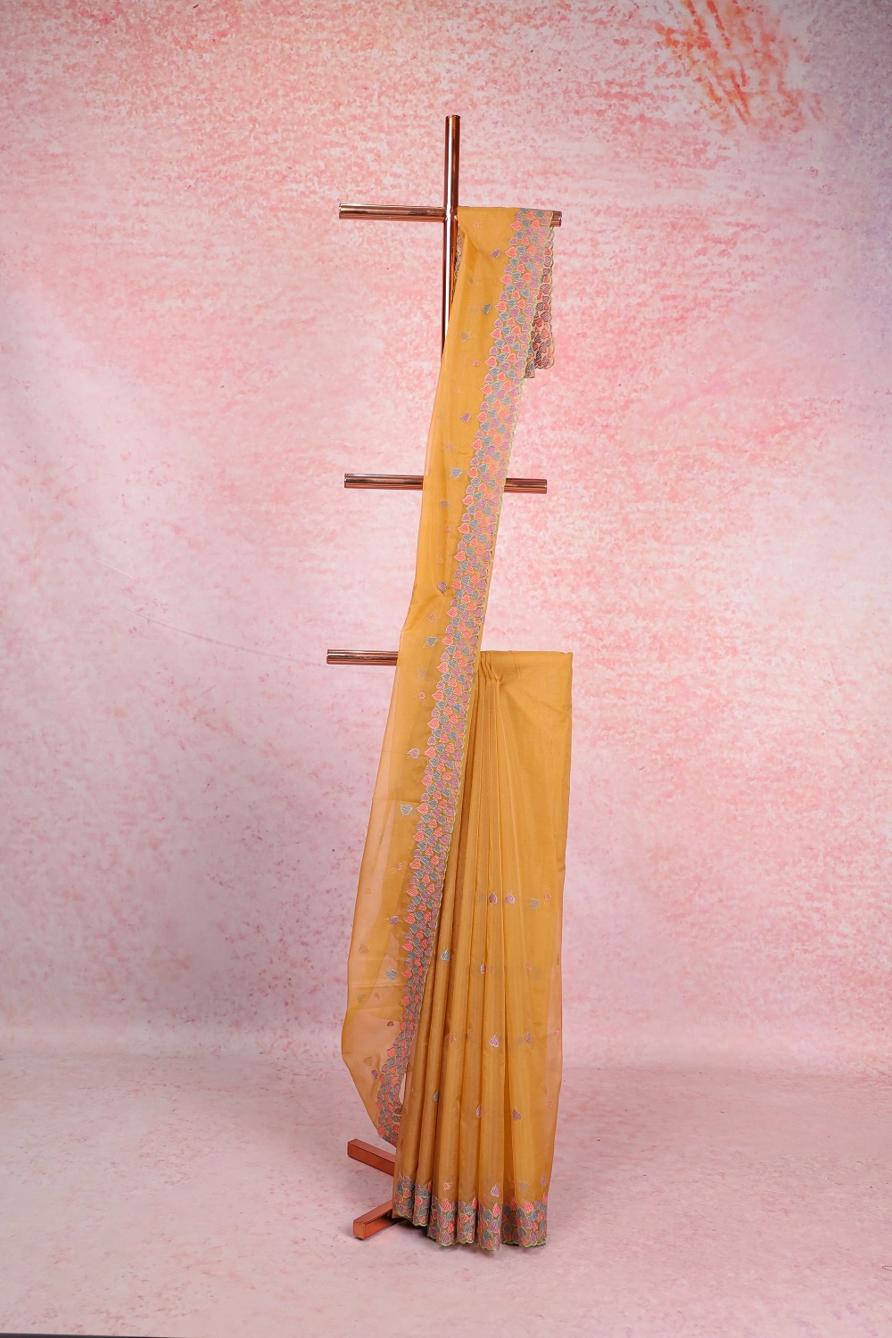 Mustard Yellow Organza Thread Work Saree with Scallop Border. Includes Unstitched Blouse