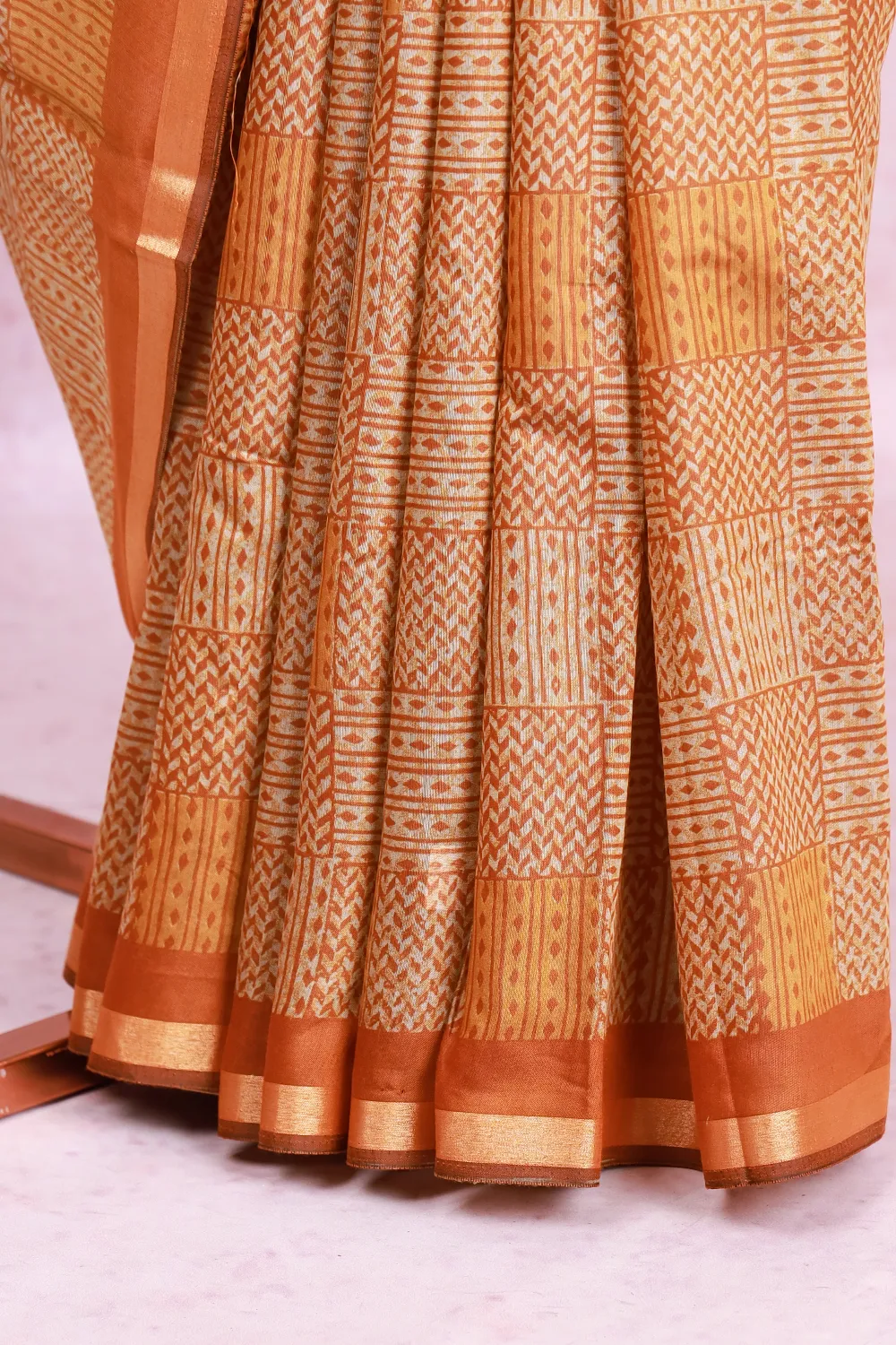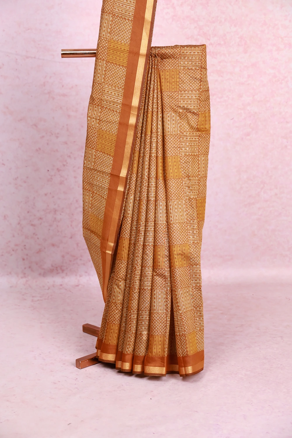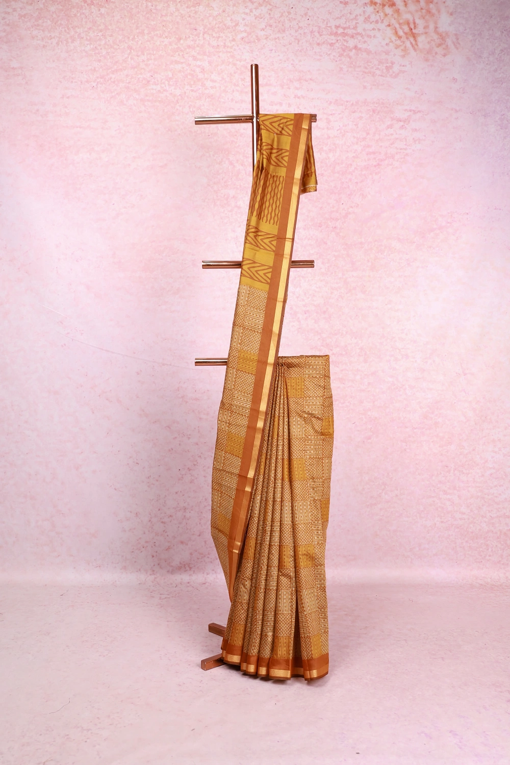 Mustard Yellow Soft Cotton Box Design Saree With Small Border. Includes Unstitched Blouse