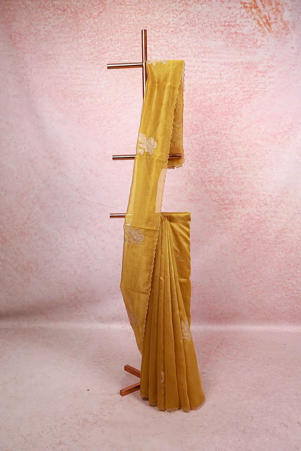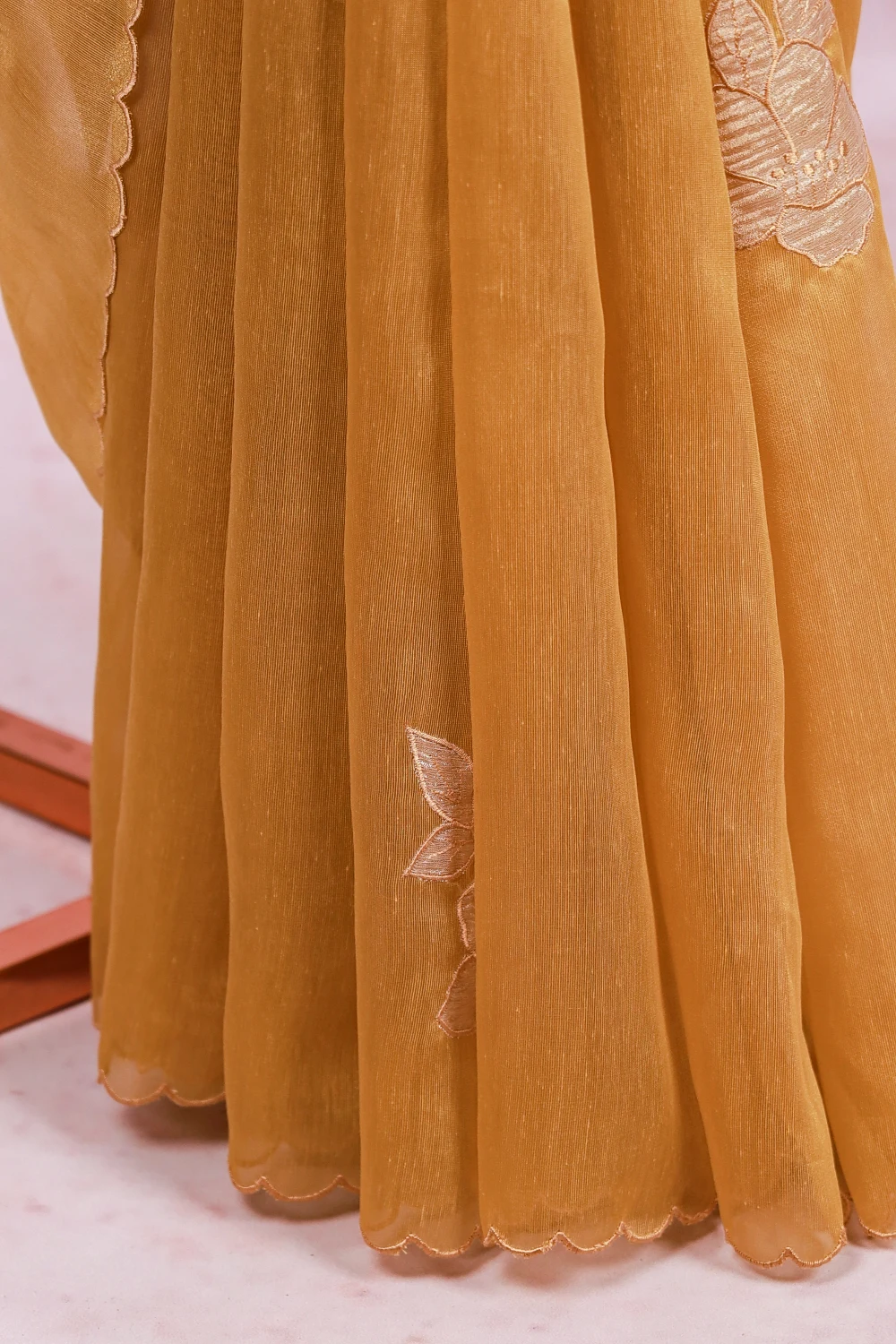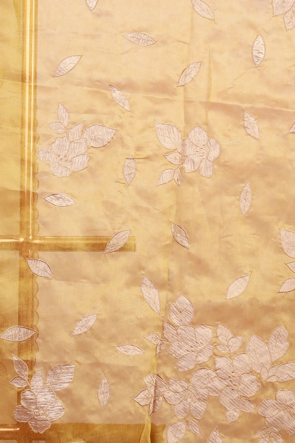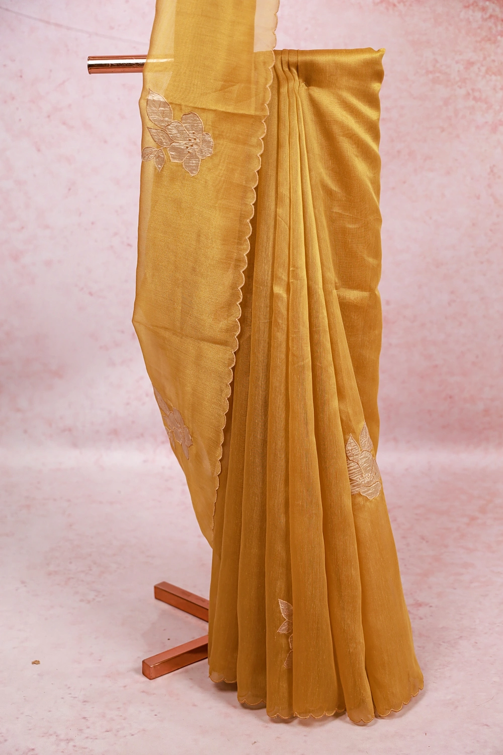 Mustard Yellow Tissue Organza Applic Work Saree With Scalp Border. Includes Unstitched Blouse