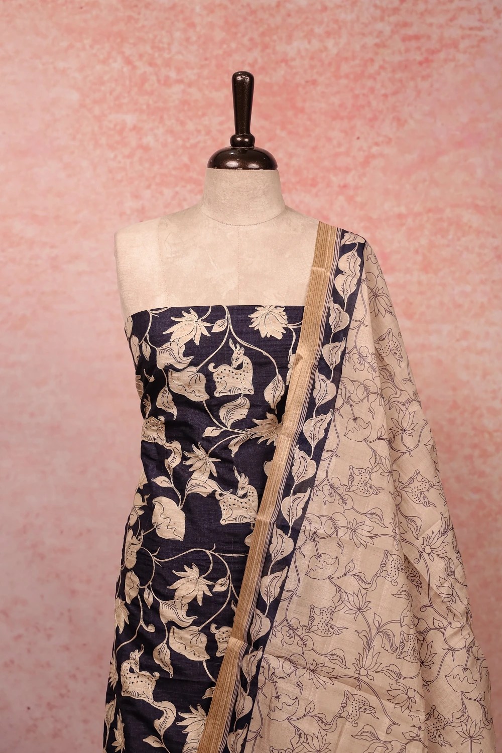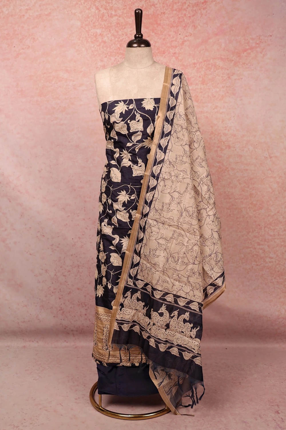 Navy Blue Chanderi Silk Printed Unstitched Churidar Material. Includes Dupatta.