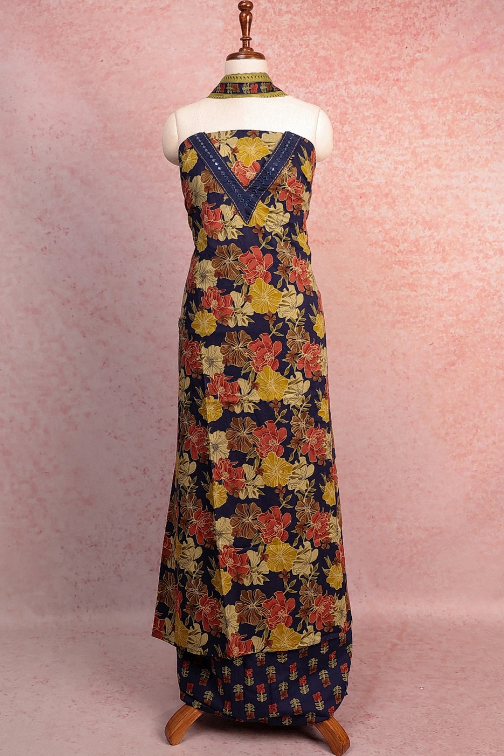 Navy Blue Cotton Floral Printed Unstitched Churidar Material. Includes Dupatta.