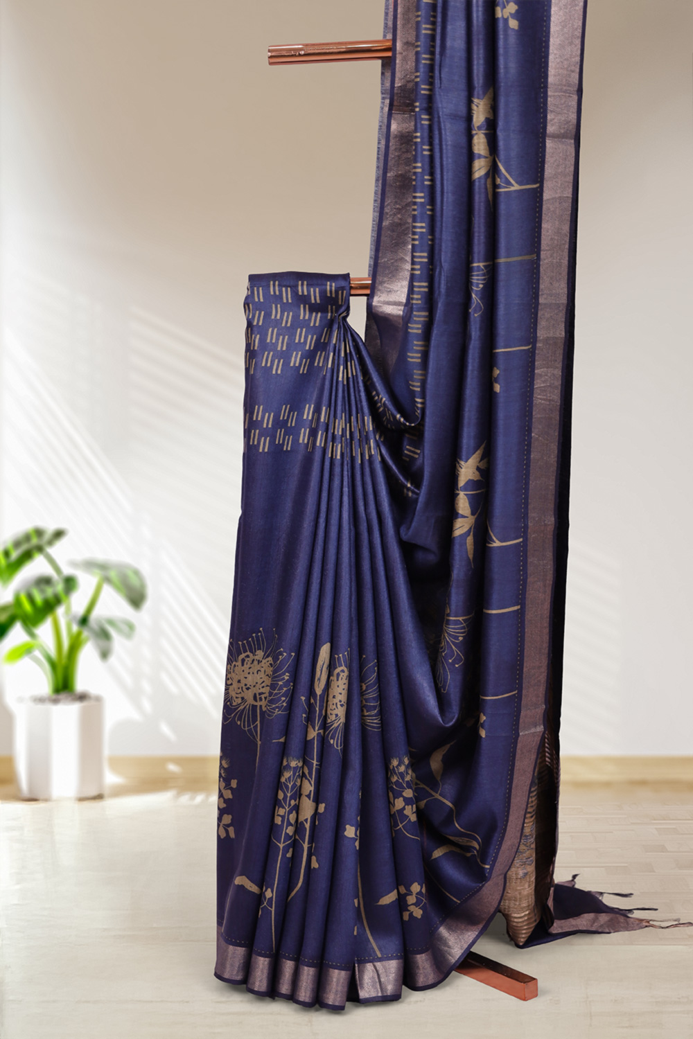 Navy Blue Dupion Silk Printed Saree with Small border. Includes Unstitched Blouse