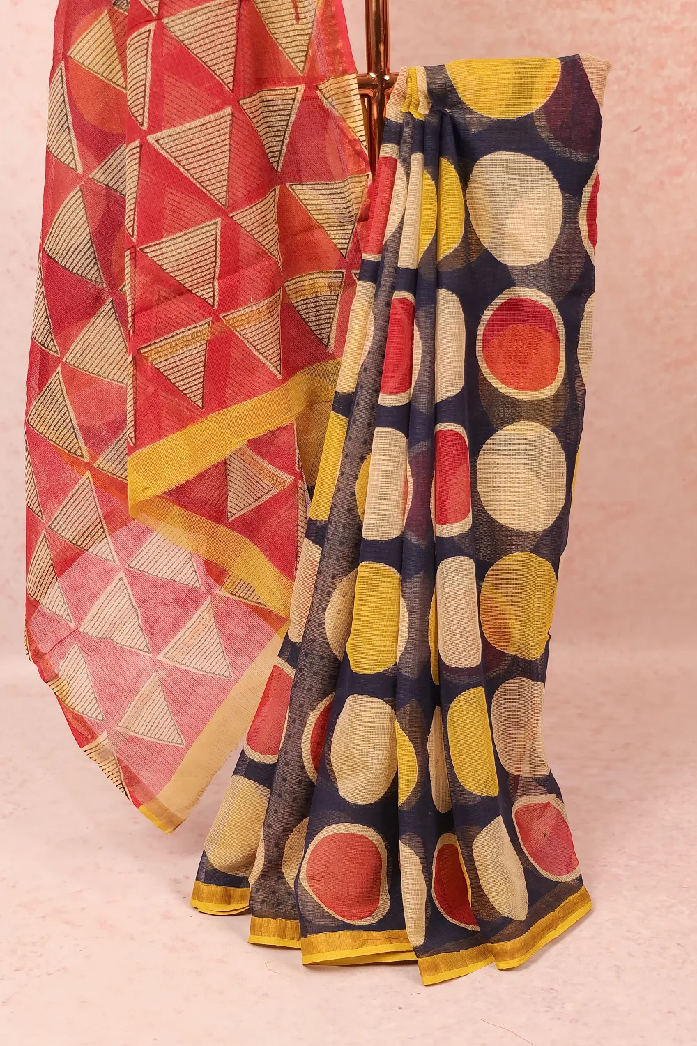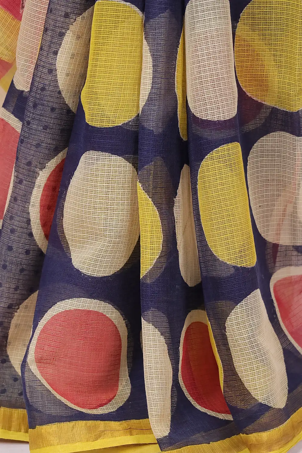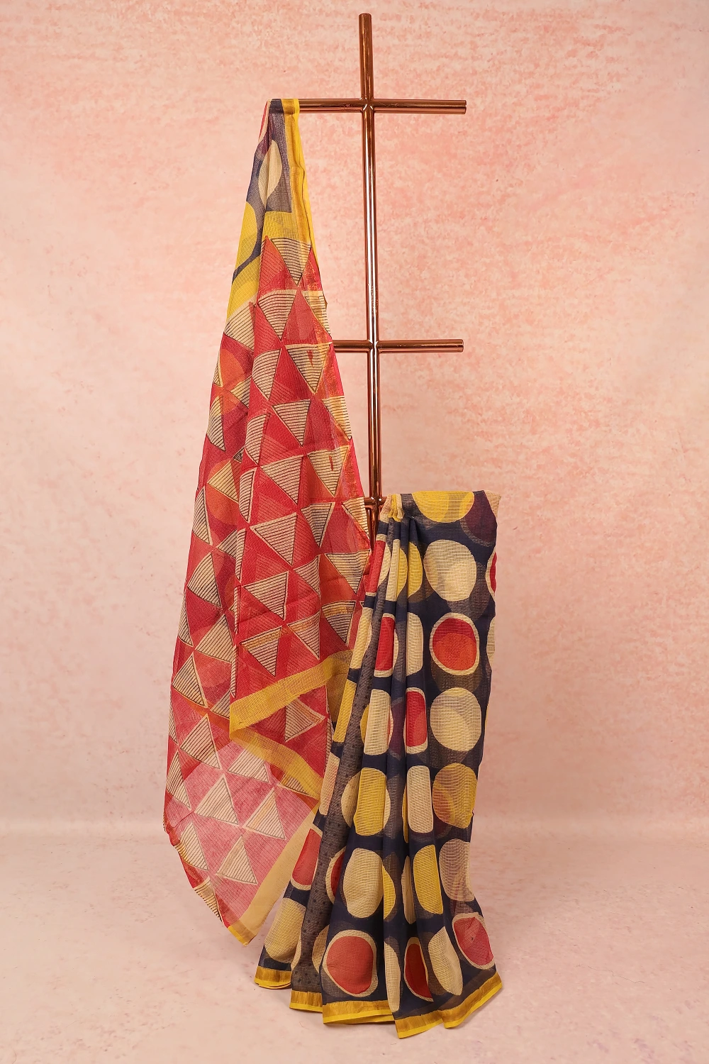 Navy Blue Net Kota Printed Saree with Small border. Includes Unstitched Blouse