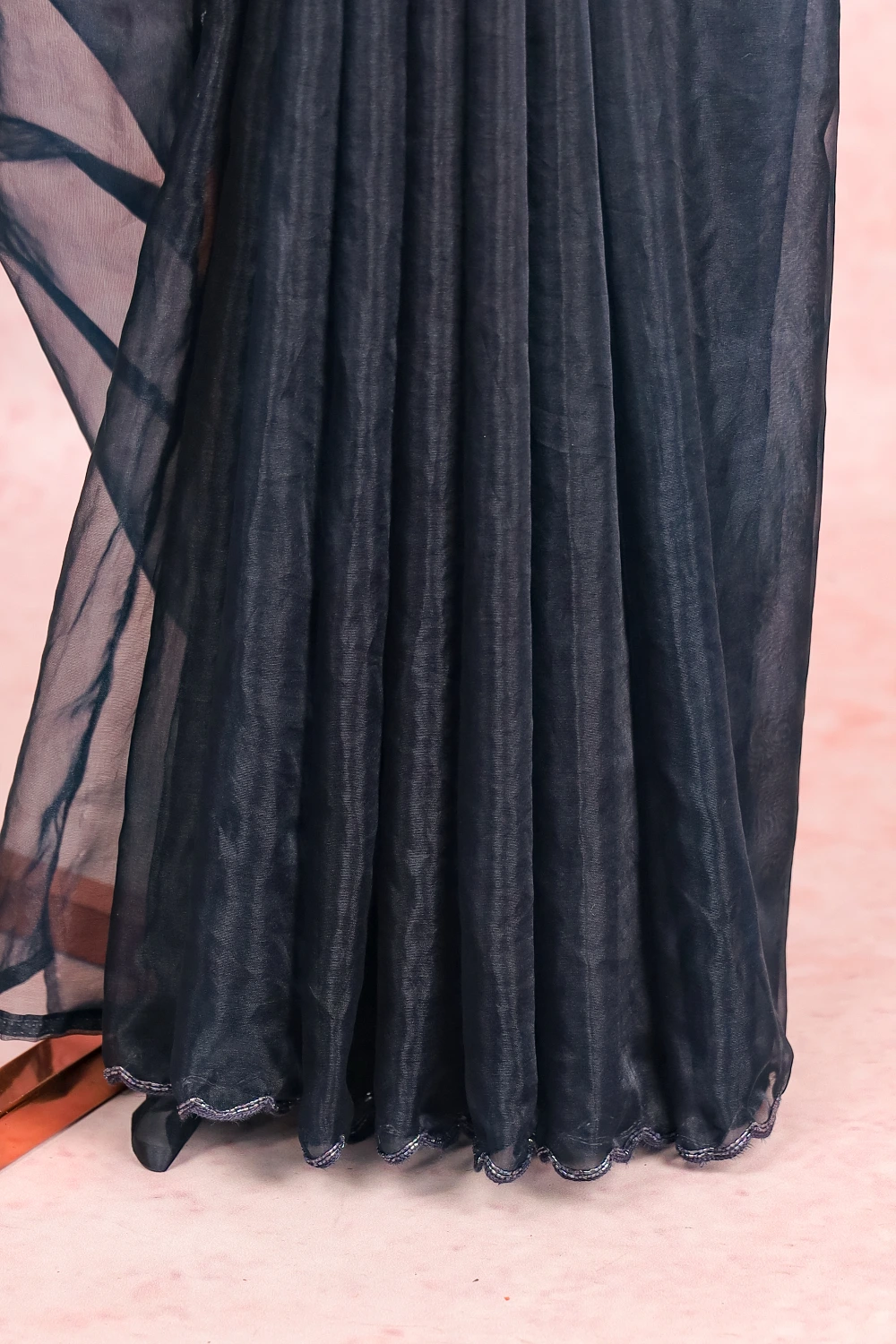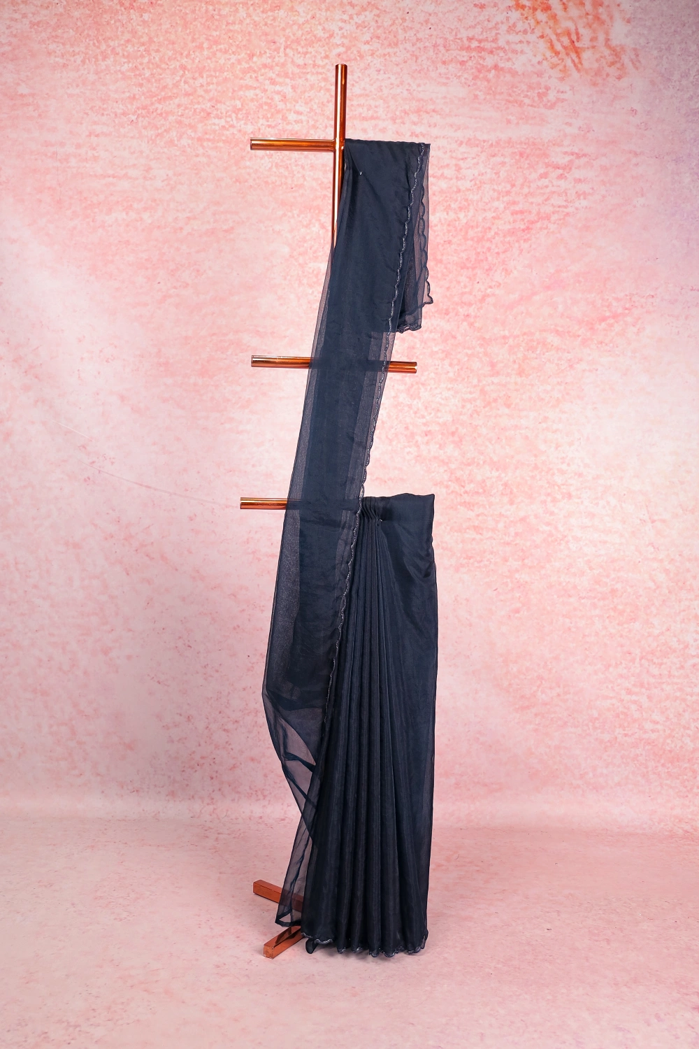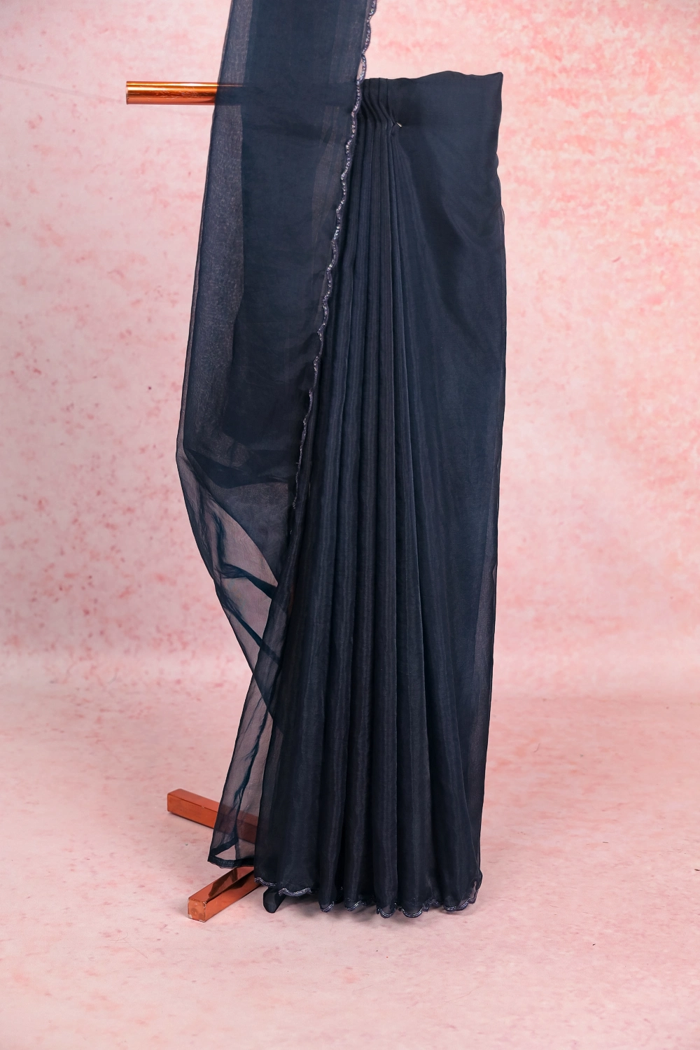Navy Blue Organza Plain Saree with Scallop Border. Includes Unstitched Blouse