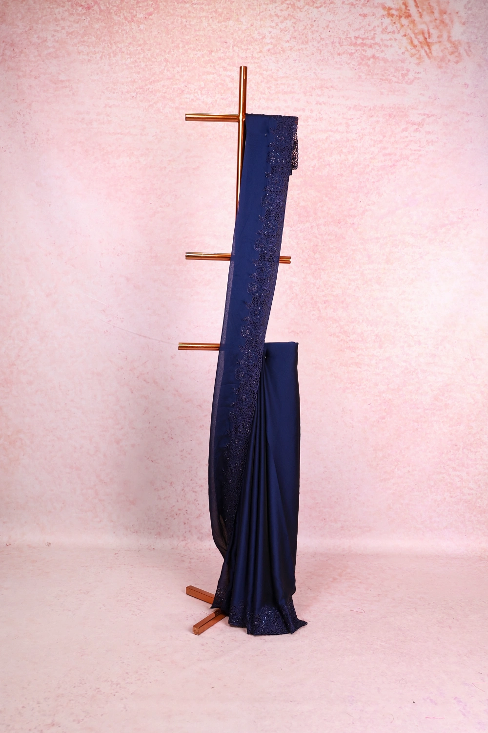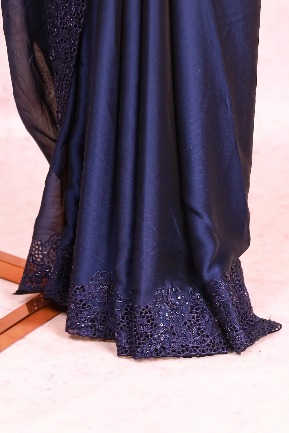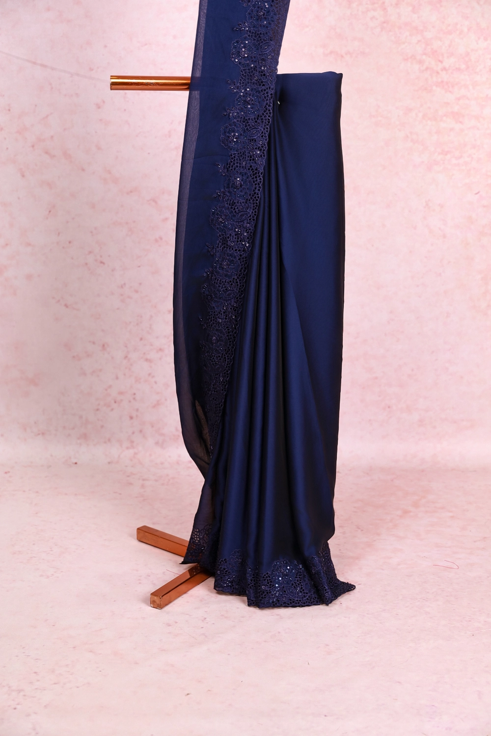 Navy Blue Organza Plain Body Saree With Cutt Work Border. Includes Un Stitched Blouse