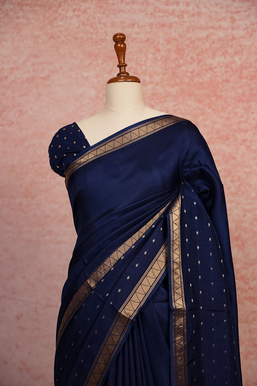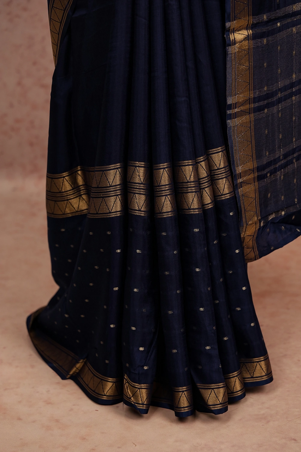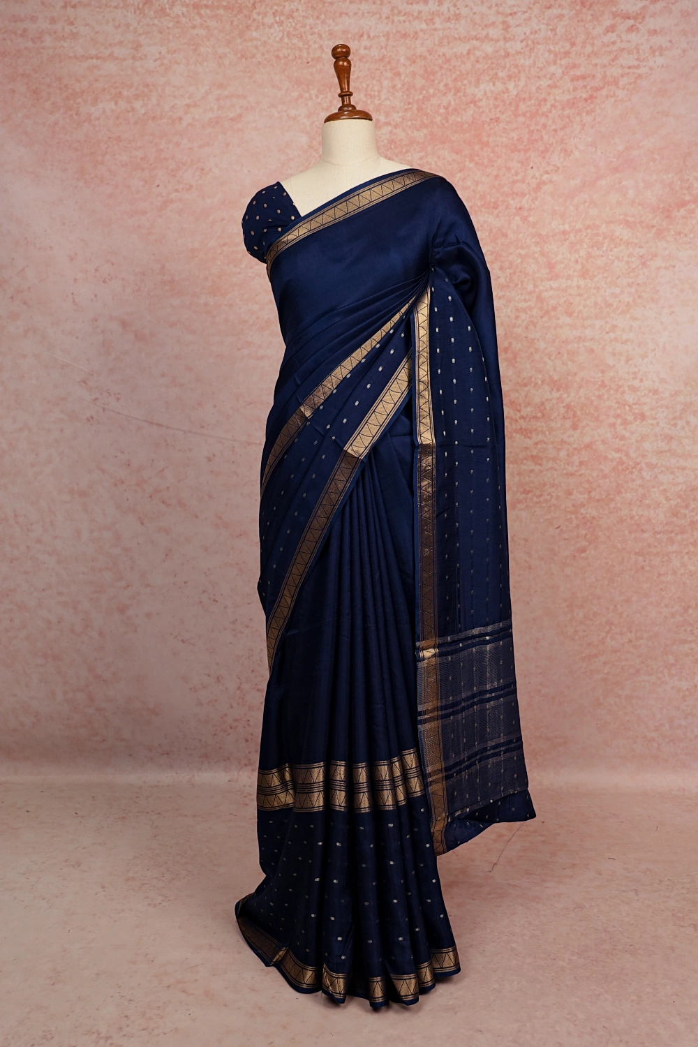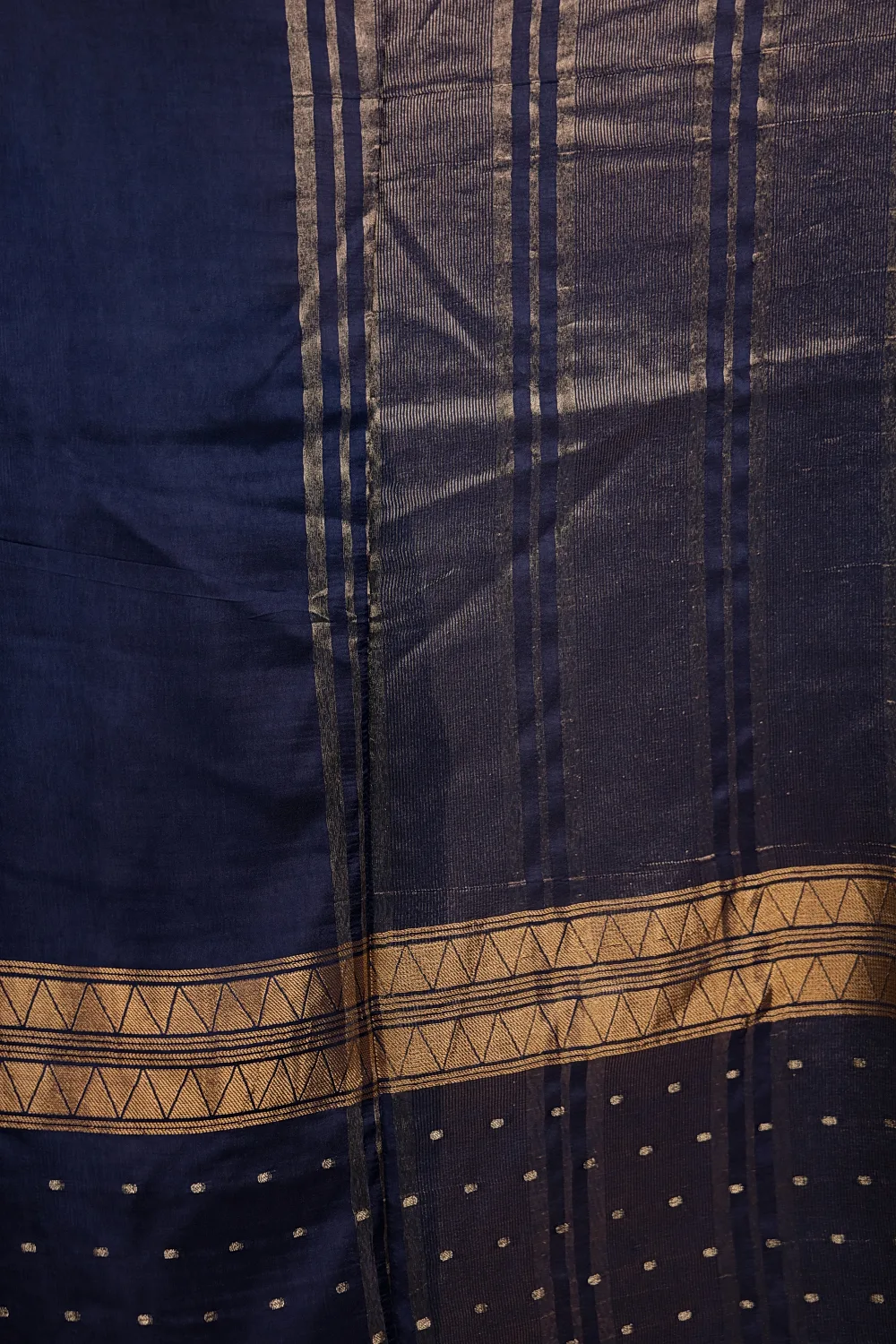 Navy Blue Semi Banatasi Plain Body Saree With Golden Border. Includes Unstitched Blouse