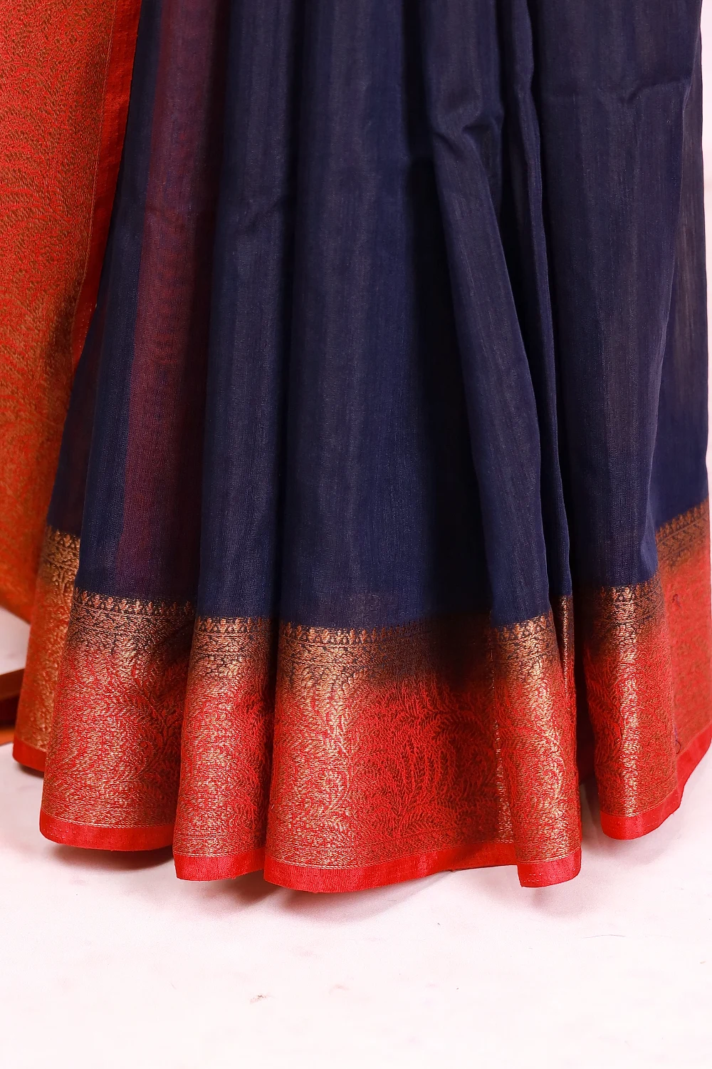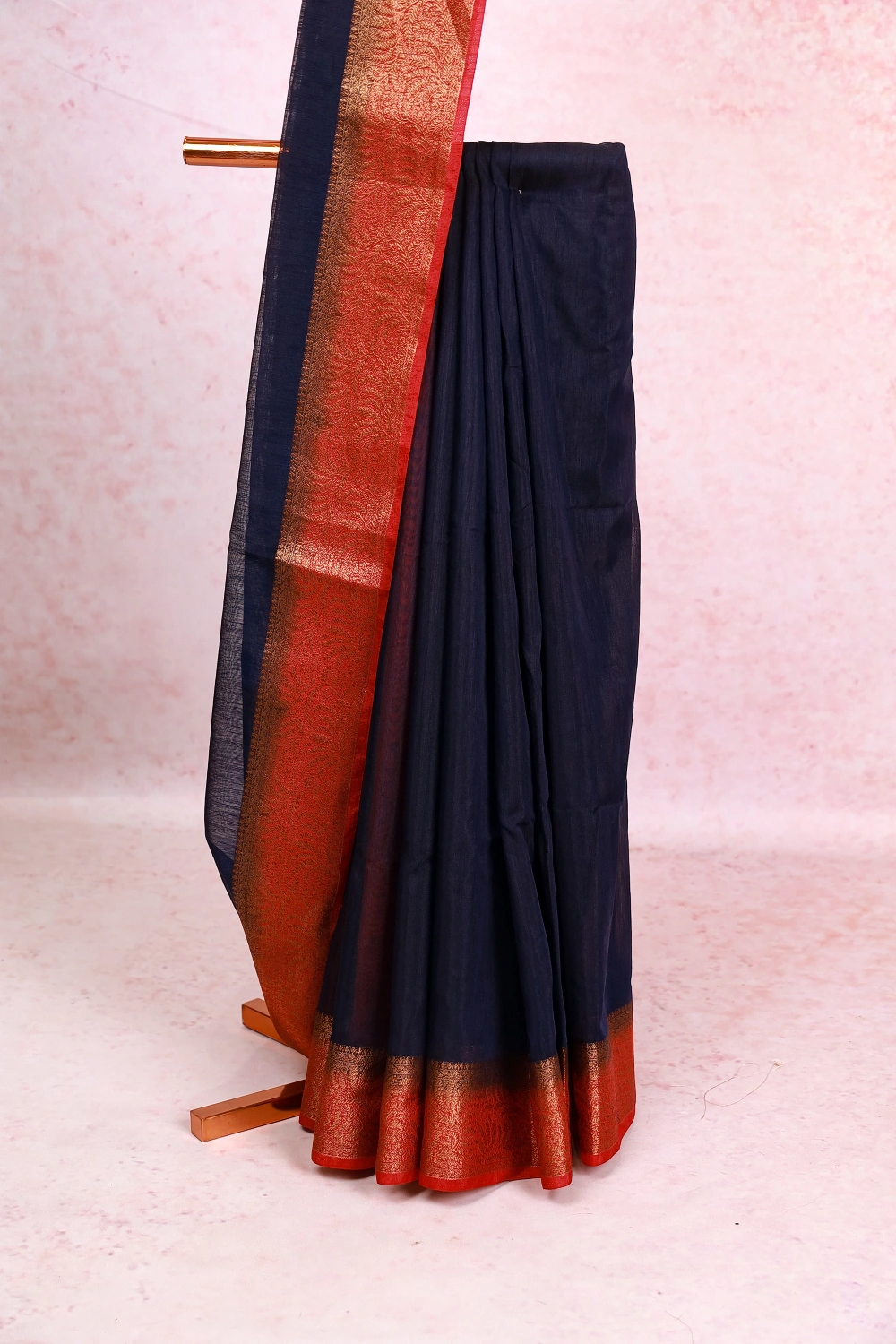 Navy Blue Semi Jute Plain Body Saree with Zari Border. Includes Unstitched Blouse