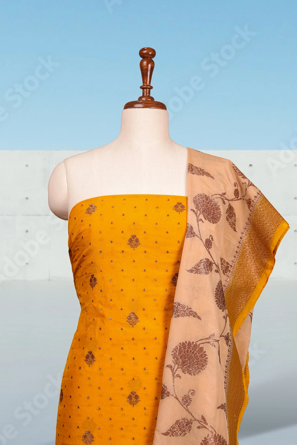 Mustard Yellow Silk Banarasi Design Unstitched Churidar Material. Includes Dupatta.