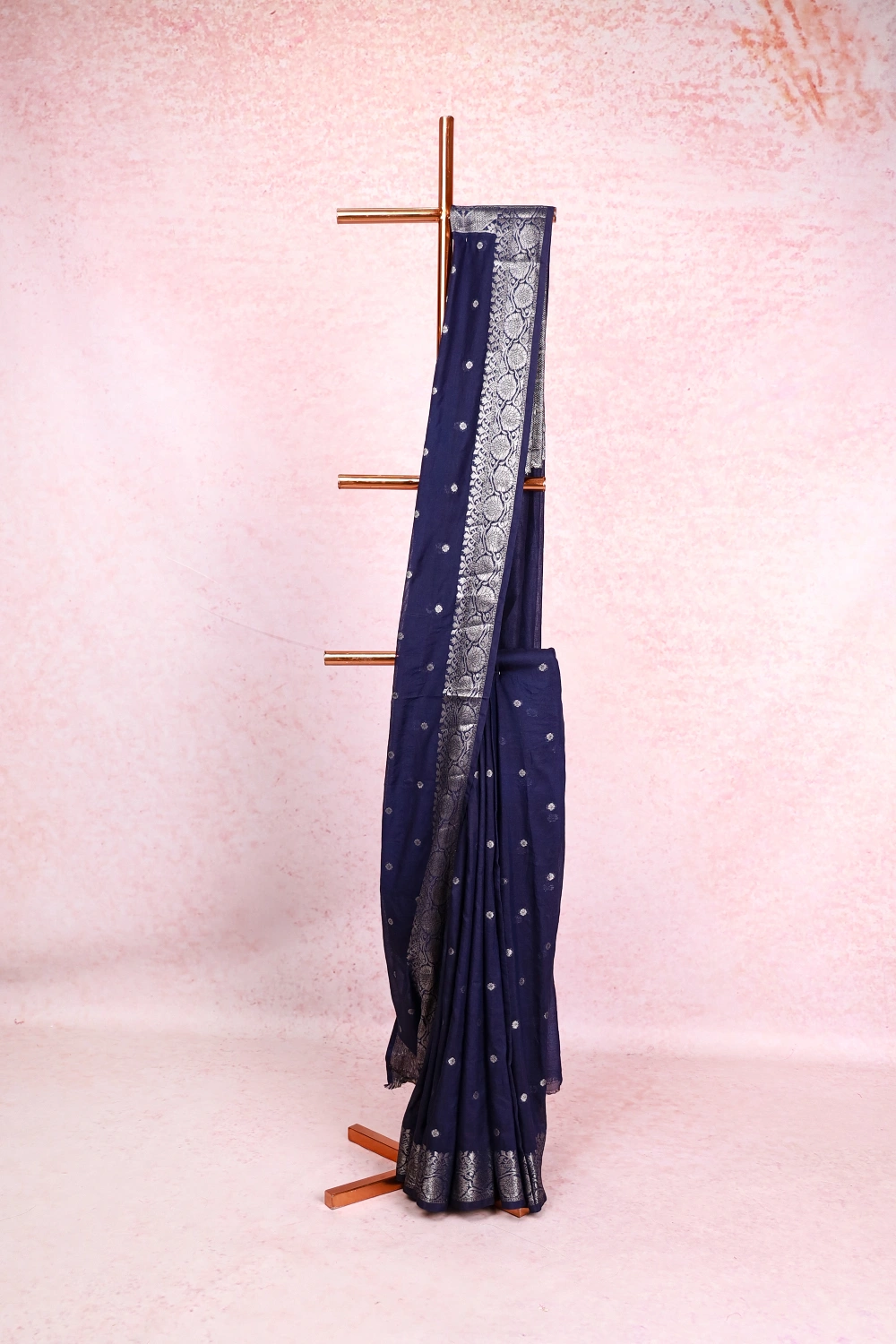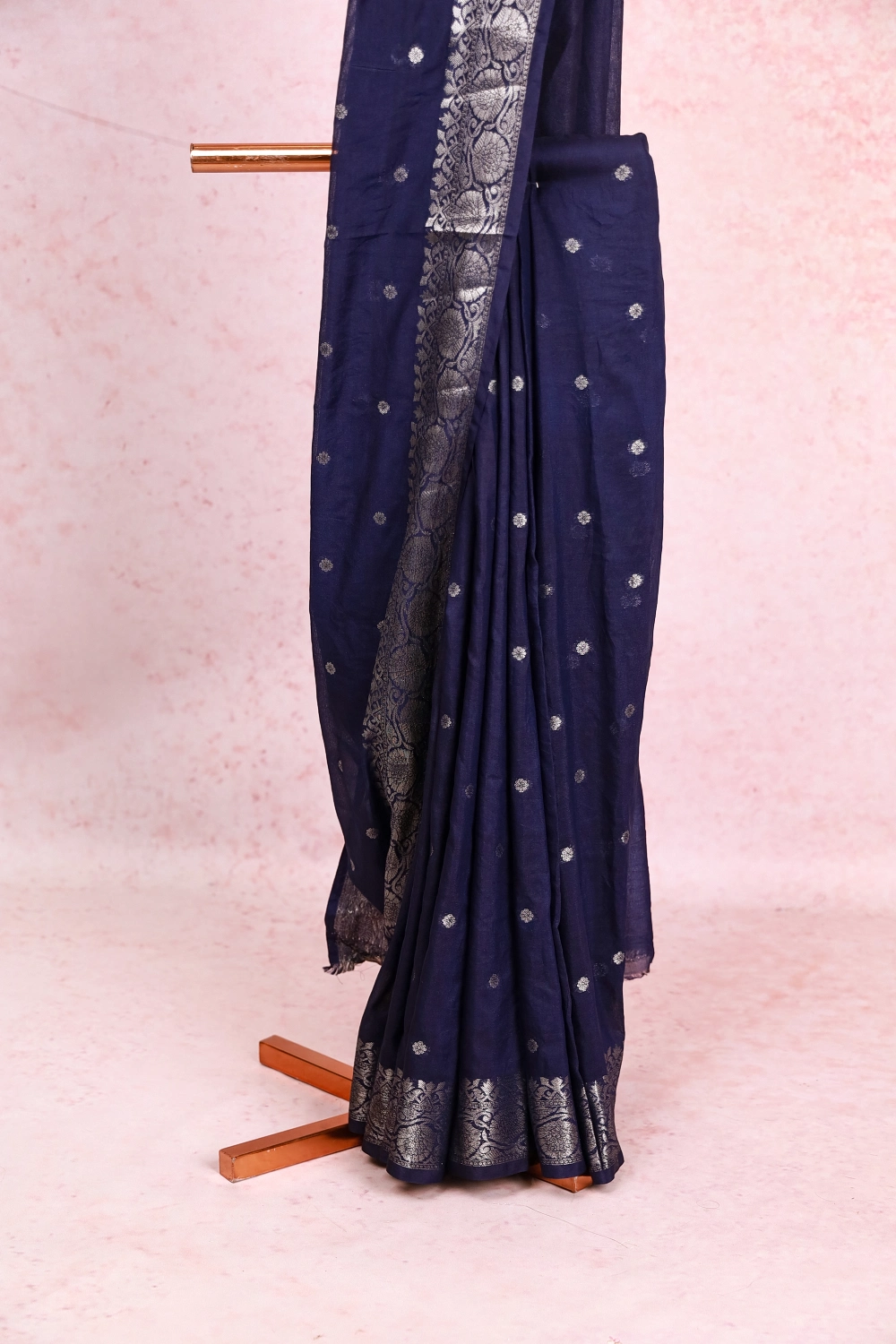 Navy Blue Semi Tussar Butta Saree With Zari Border. Includes Un Stitched Blouse