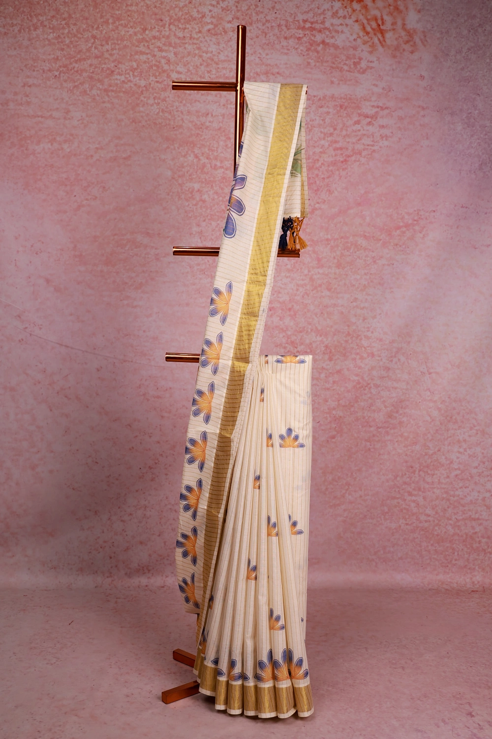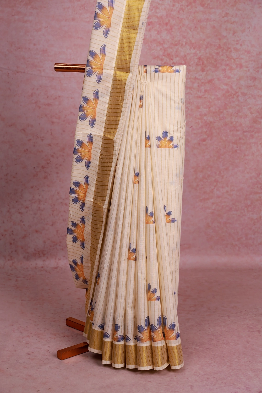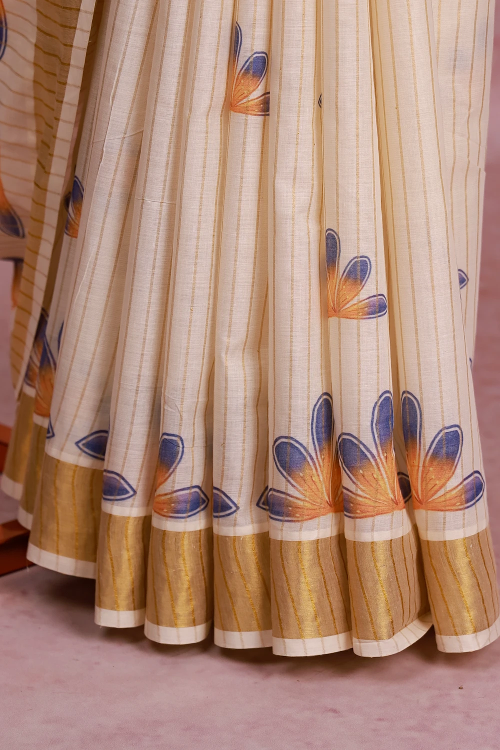 Off White Cotton Kerala Stripes With Floral Design Saree With Zari Border. Includes Un Stitched Blouse