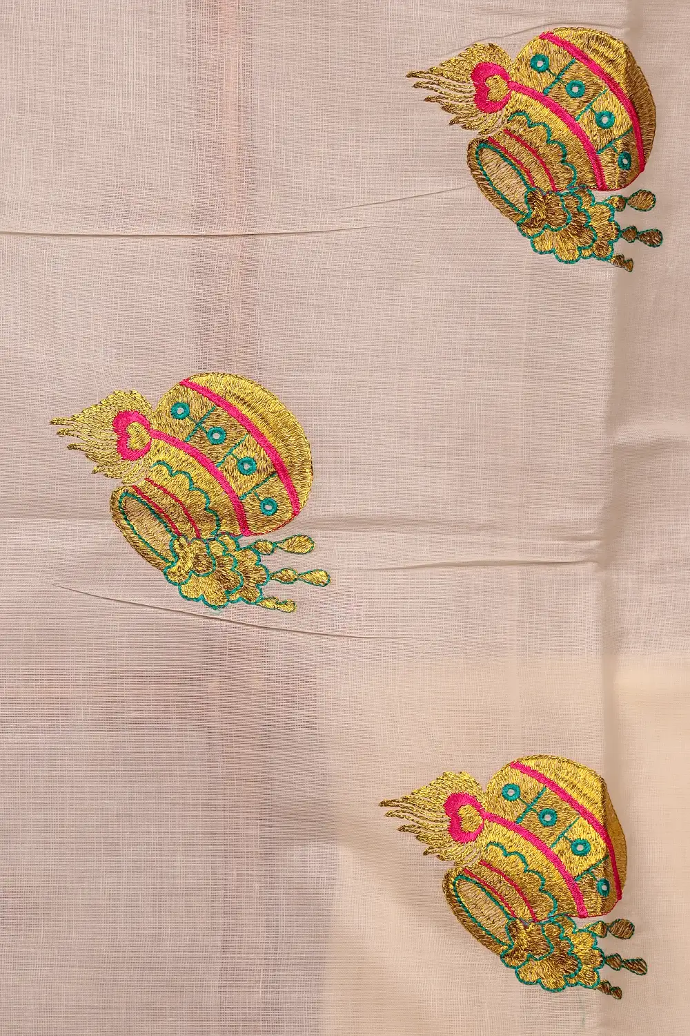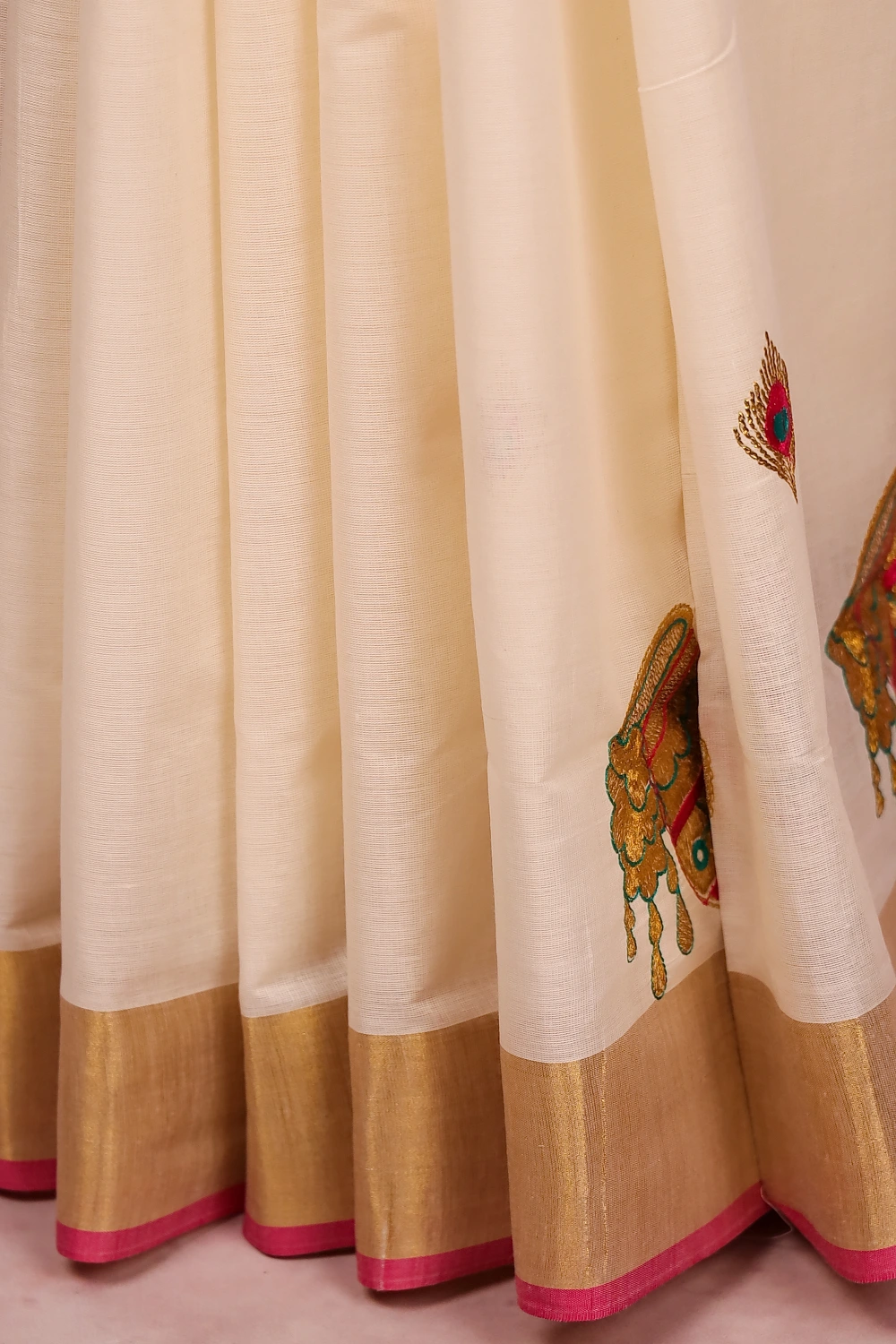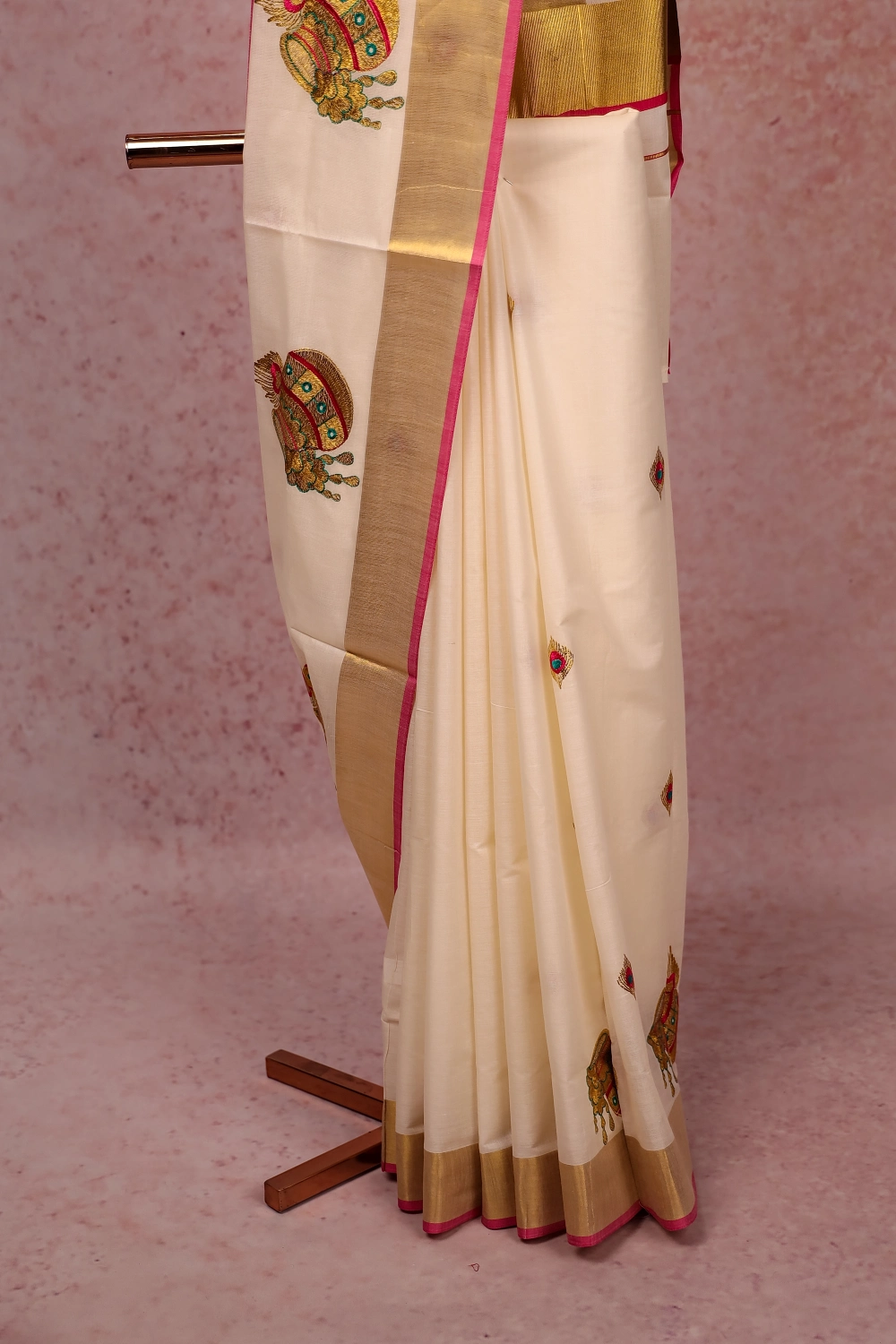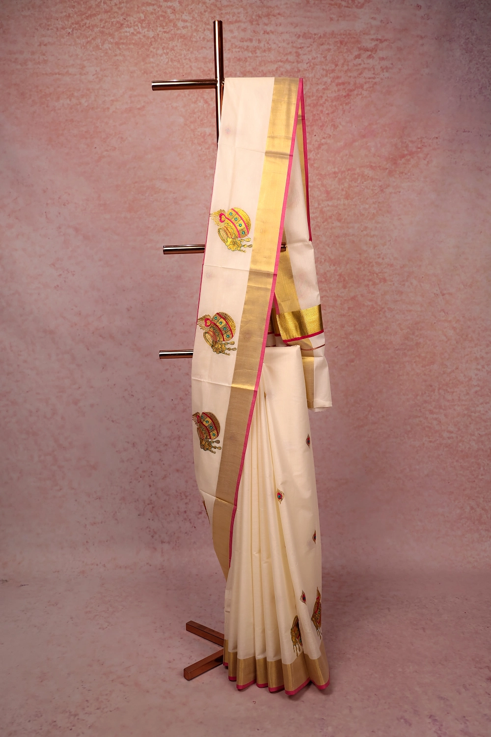 Off White Cotton Kerala Butta Saree with Golden Border. Includes Unstitched Blouse.