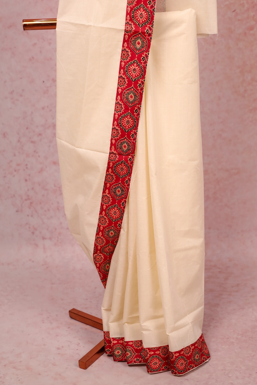 Off White Cotton Kerala Plain Body Saree with Printed Border. Includes Unstitched Blouse.