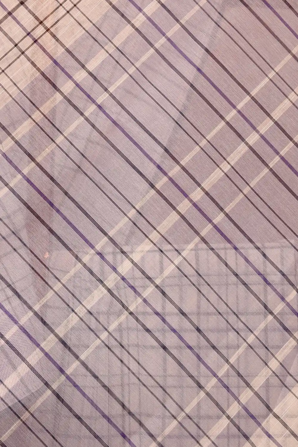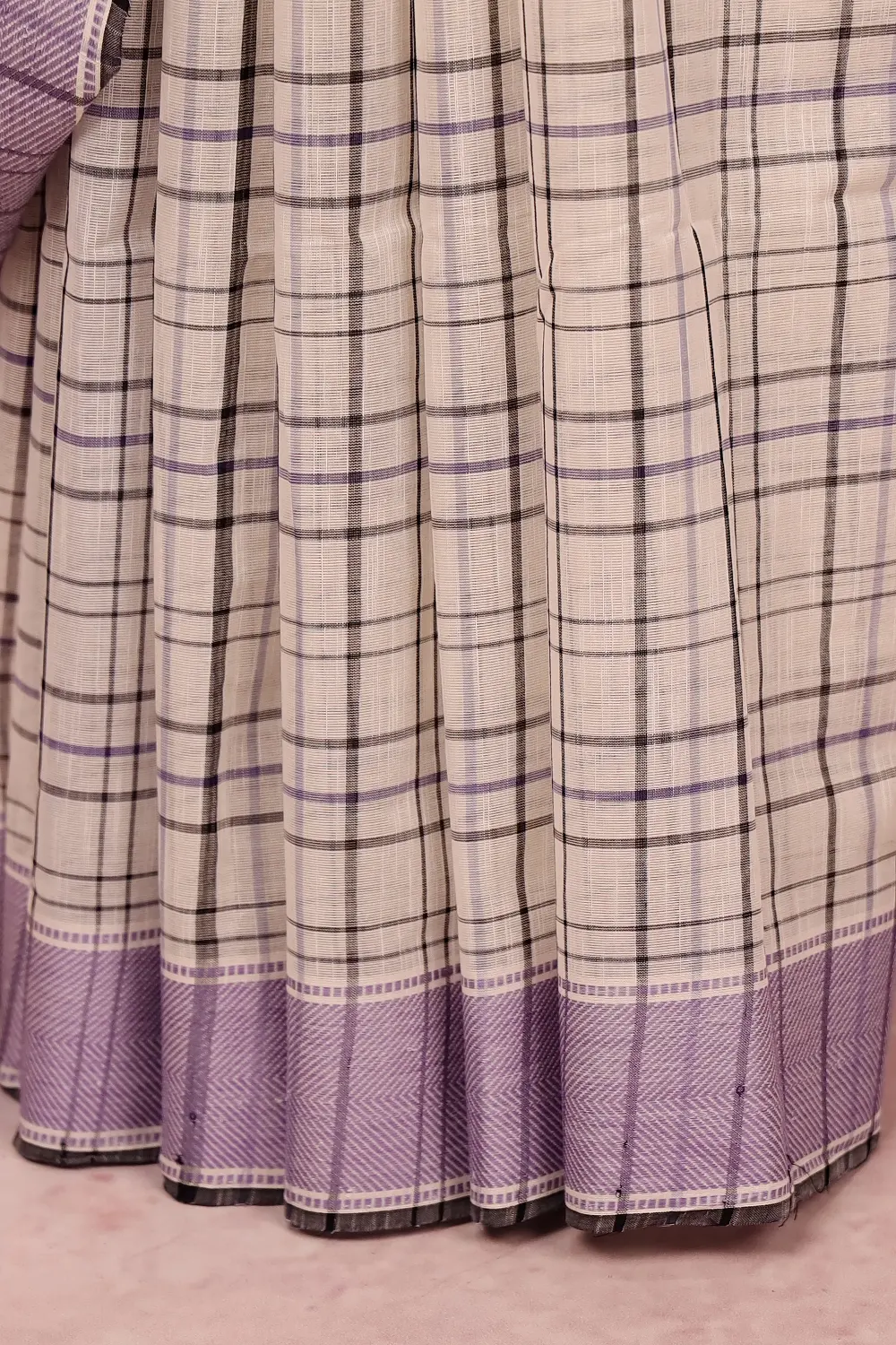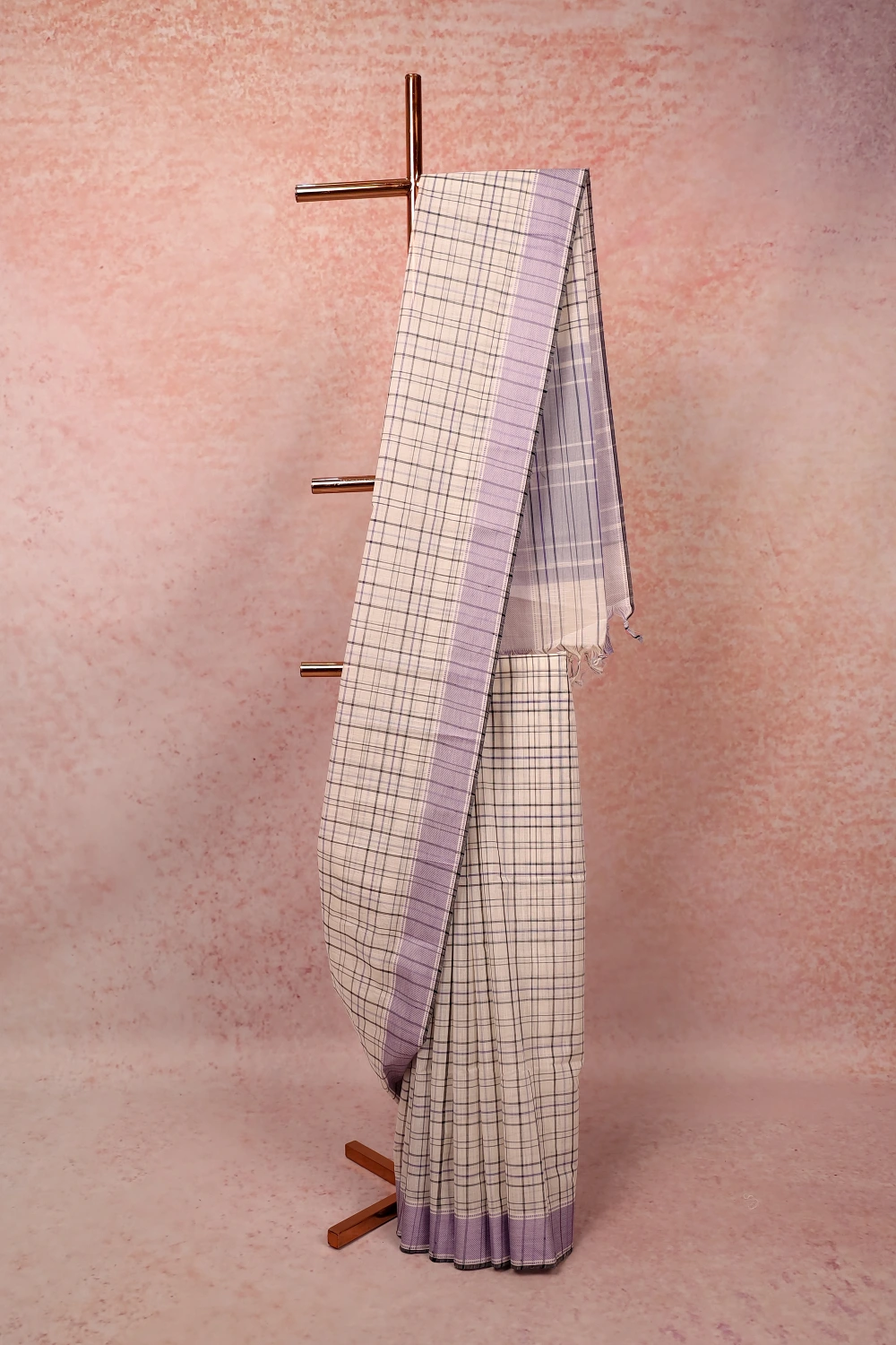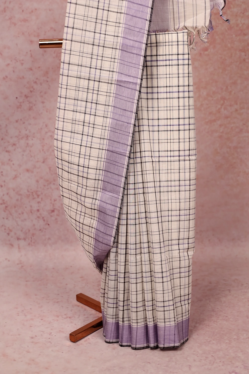 Off White Cotton Check Saree with Designer Border. Includes Unstitched Blouse