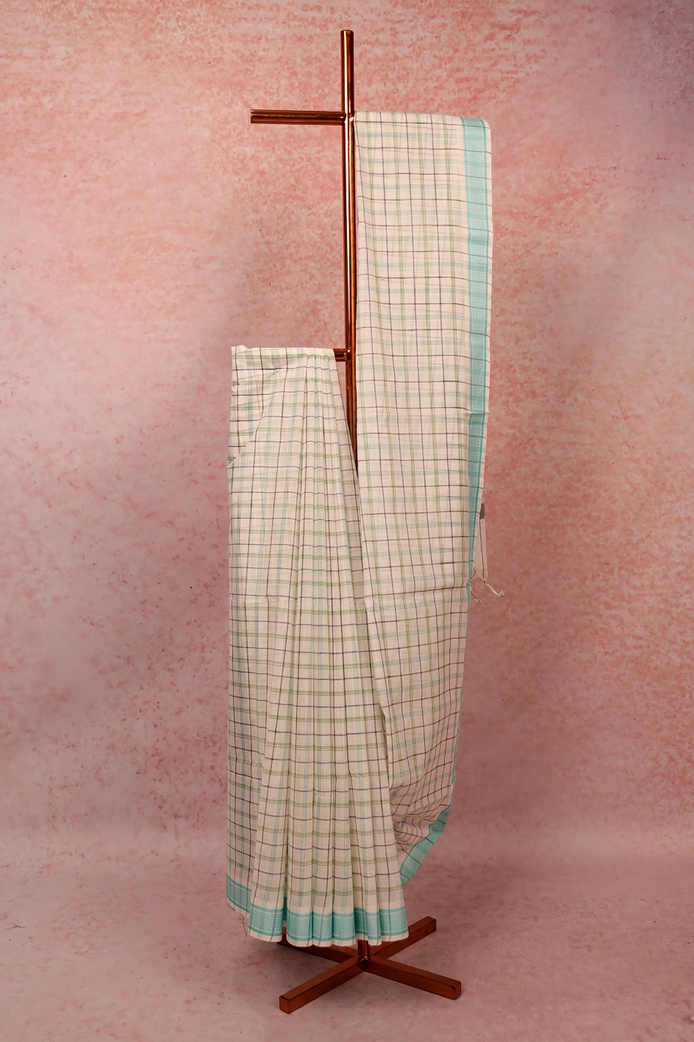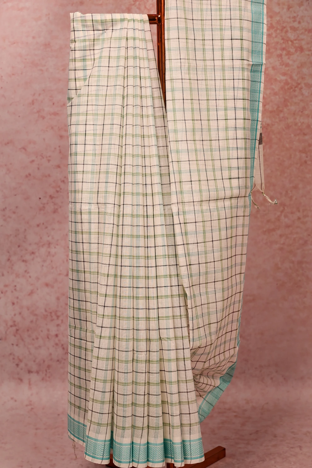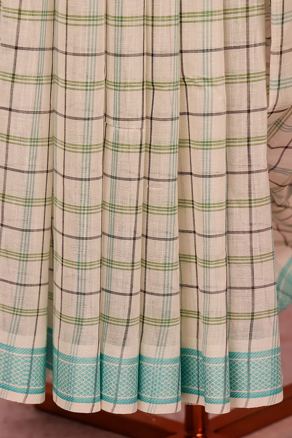 Off White Cotton Check Saree with Thread Border. Includes Unstitched Blouse